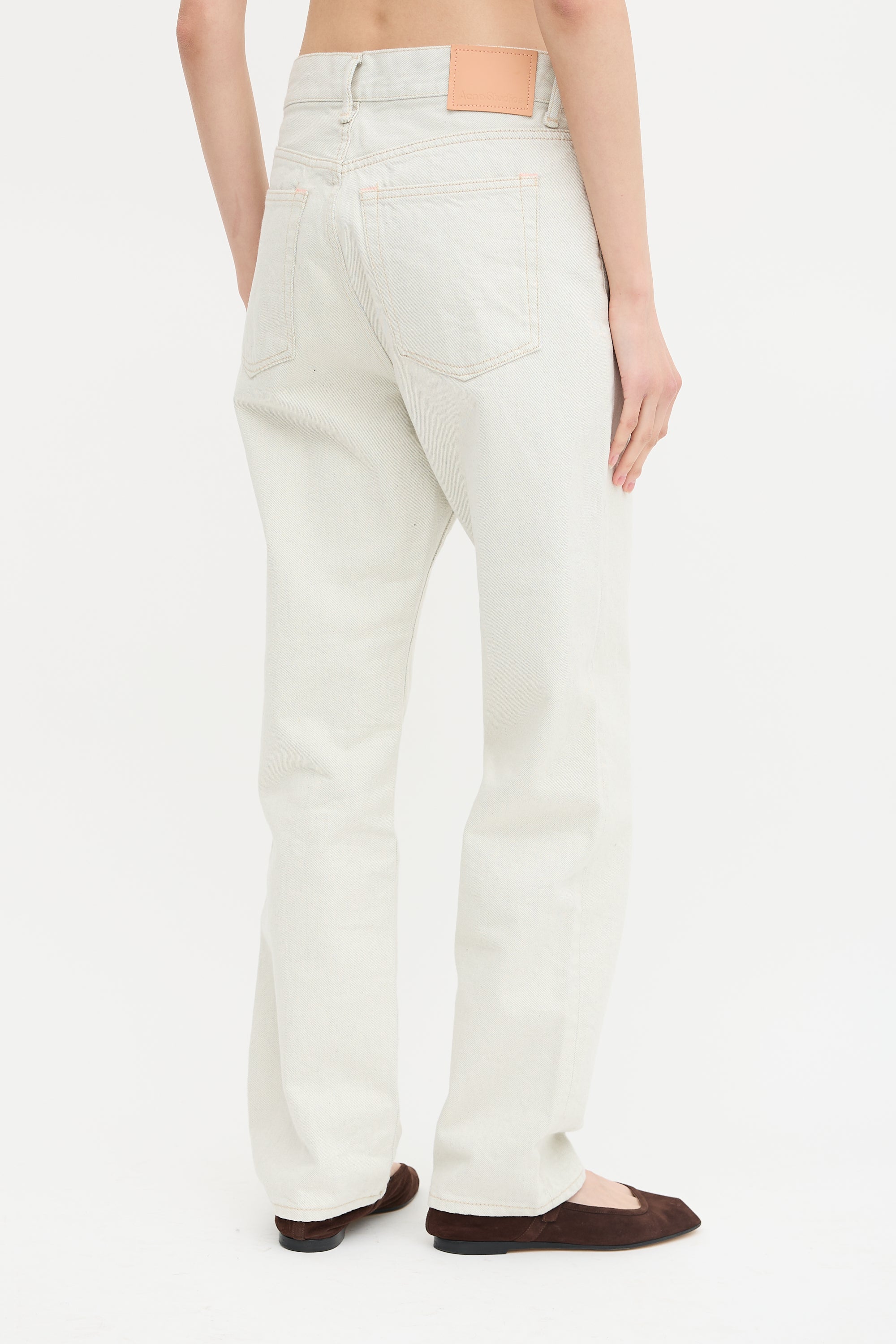 Pre-owned Acne Studios light wash jeans featuring high waist, slim leg, five pocket styling, pink rubber Jacron patch, and button fly.