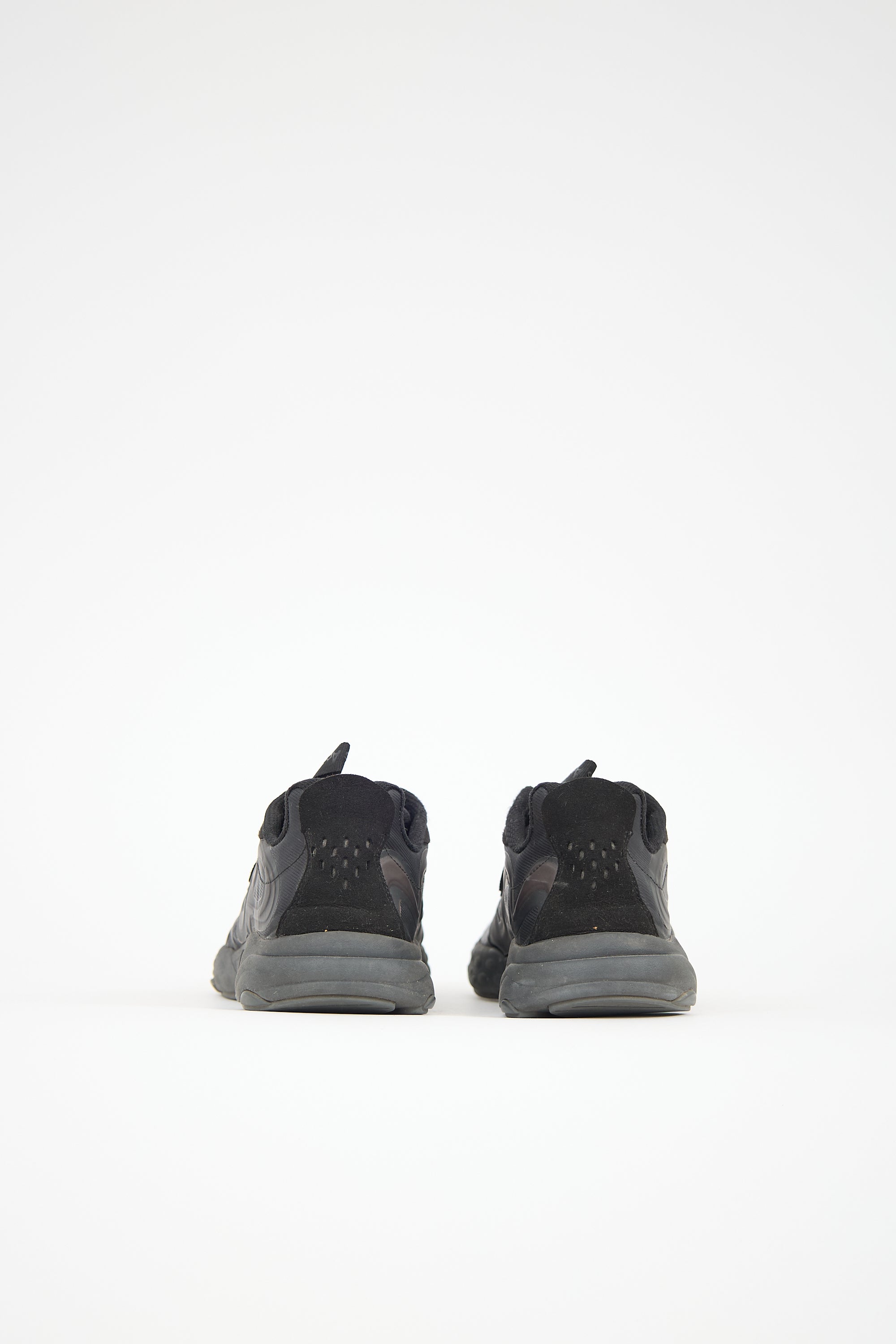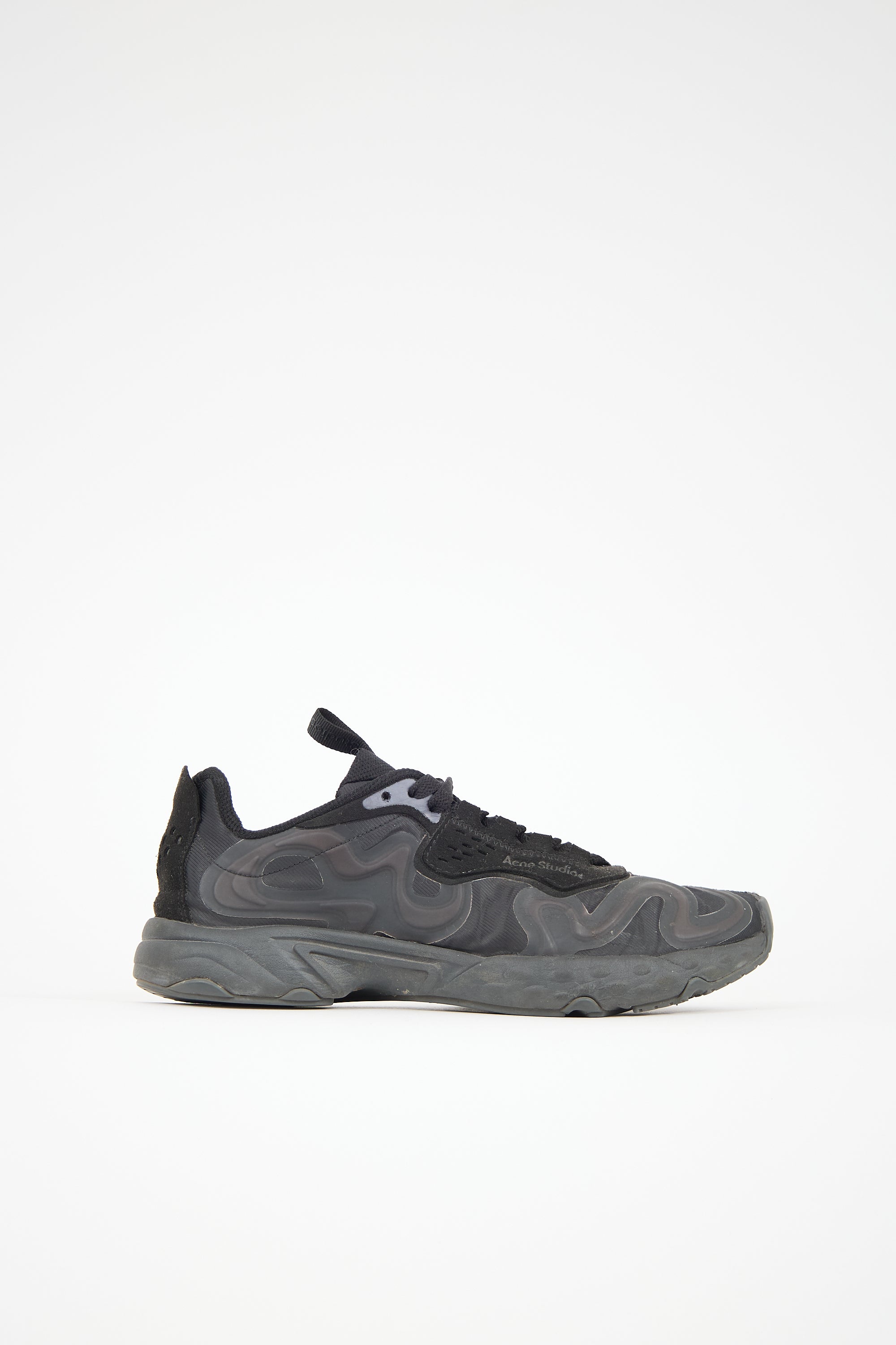 Pre-owned Acne Studios black Ribbon sneakers featuring a rounded toe, lace up front, rubberized wave detail at upper, logo webbing pull tab at tongue, and rubber sole. Comes with original dust bag.