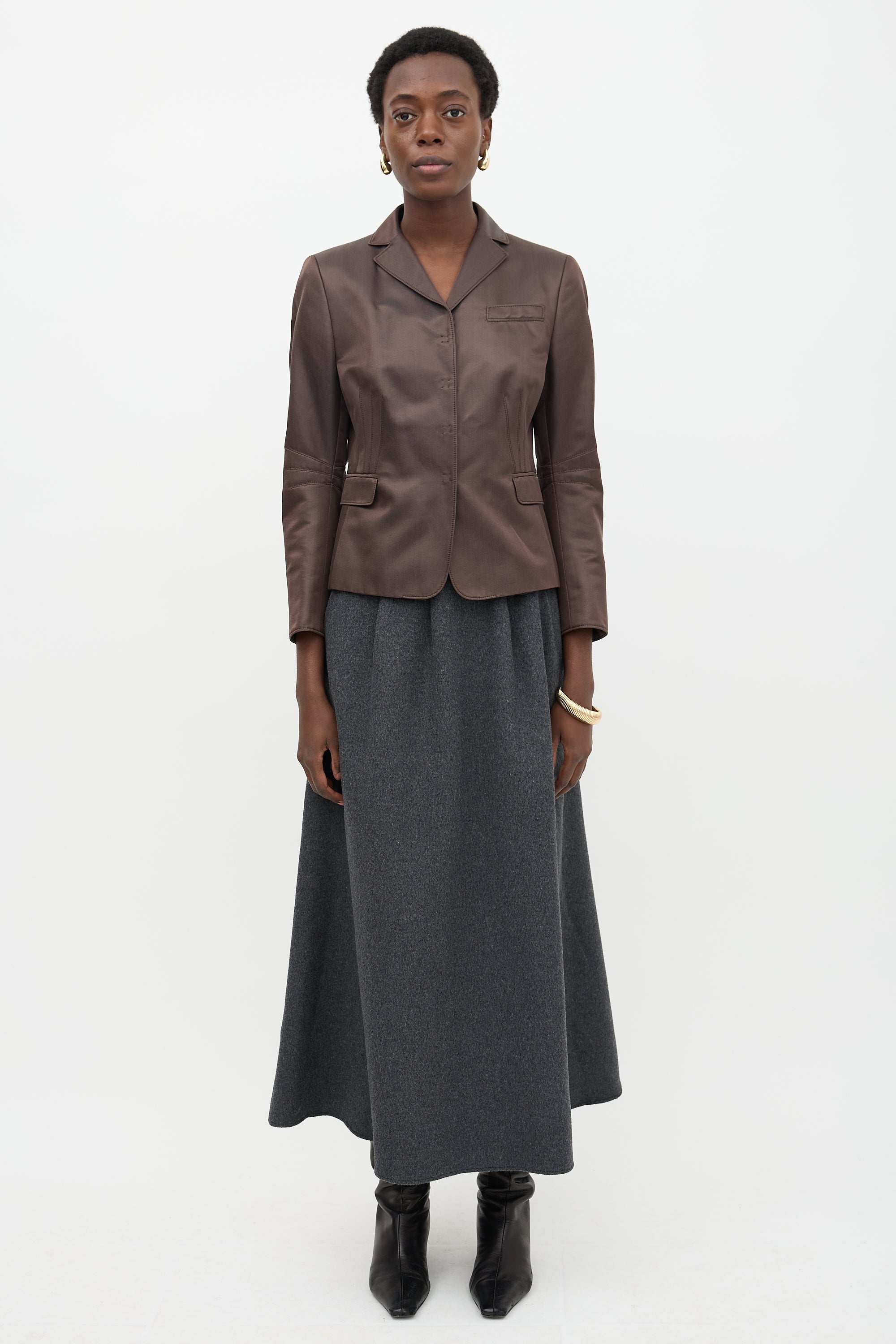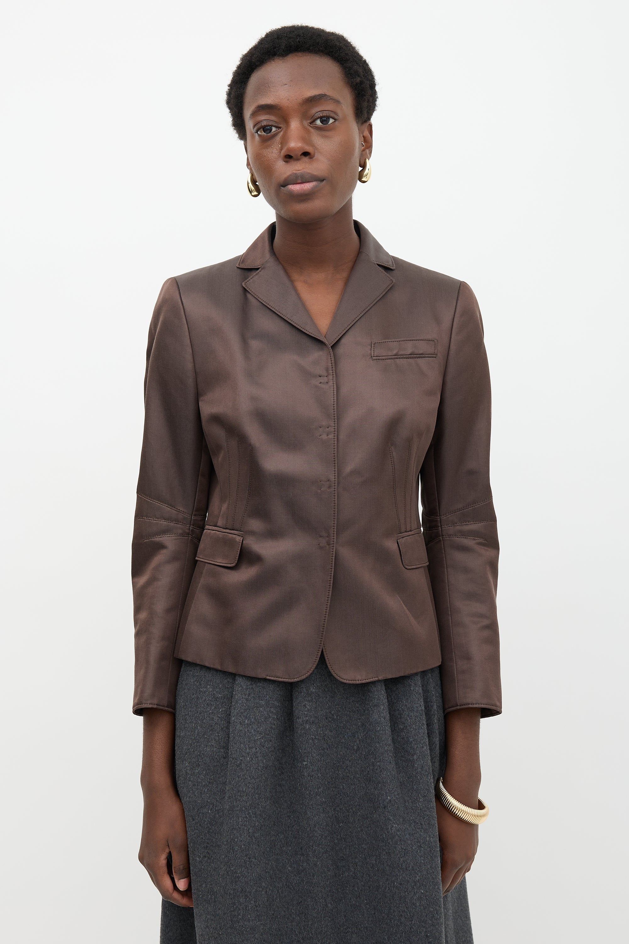 Pre-owned Akris Punto brown silk satin blend blazer featuring notched collar, snap button up front closure, three front pockets, tuck detail, removable back half belt, and slit cuffs. Lined.