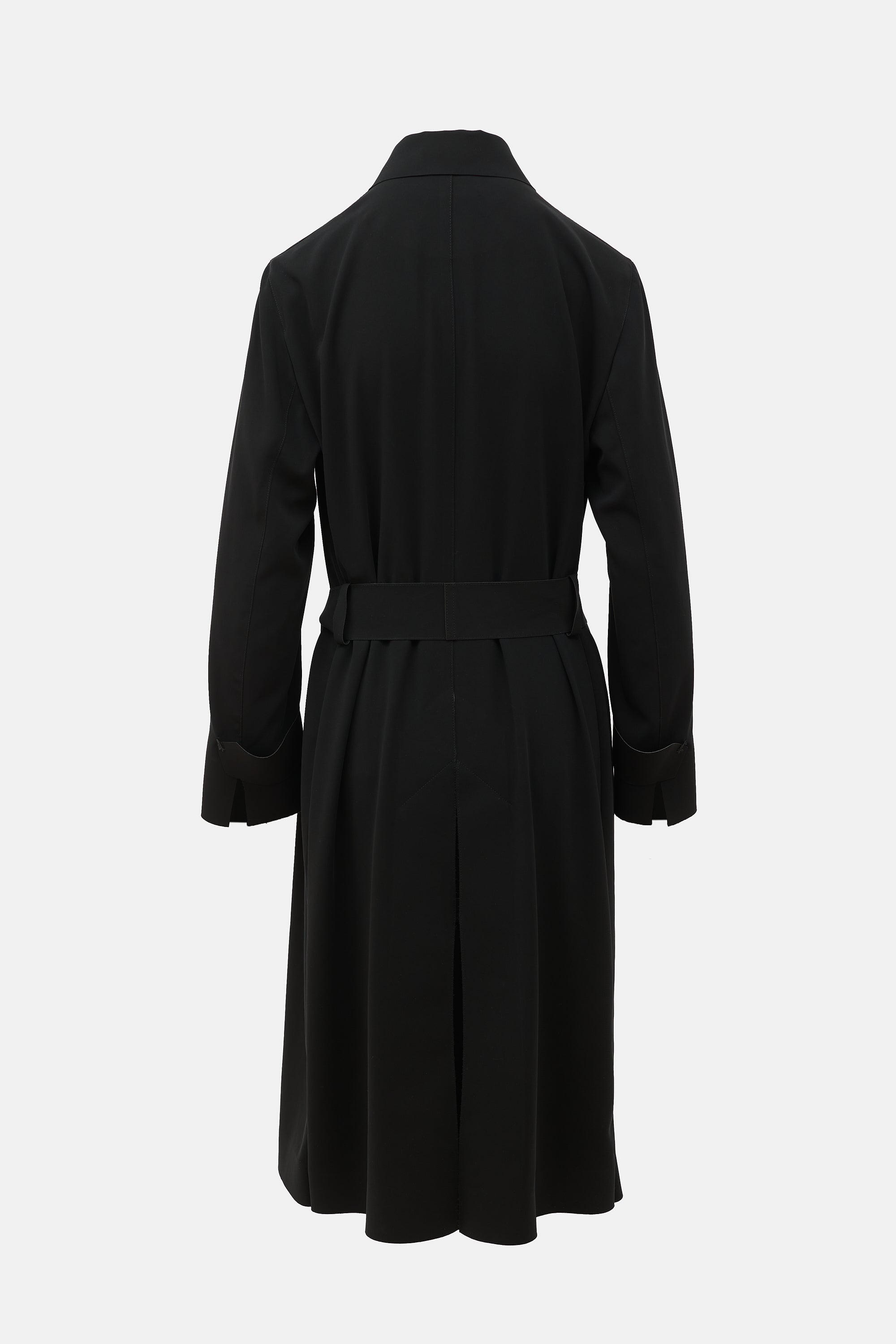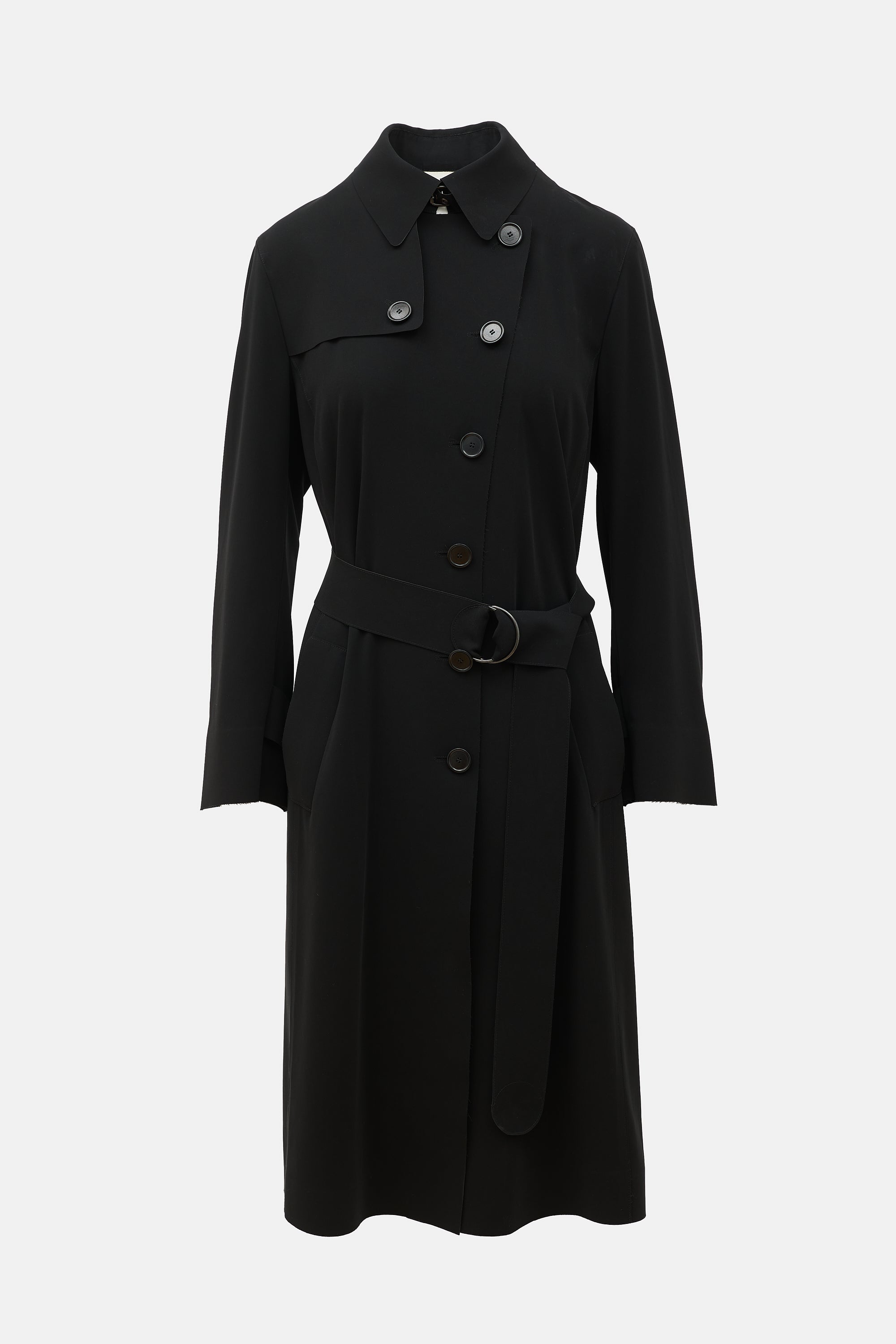 Pre-owned Akris black trench coat featuring a notched collar, storm flap, asymmetrical button front, adjustable belt, welt pockets, back vent, and raw trim. Unlined.