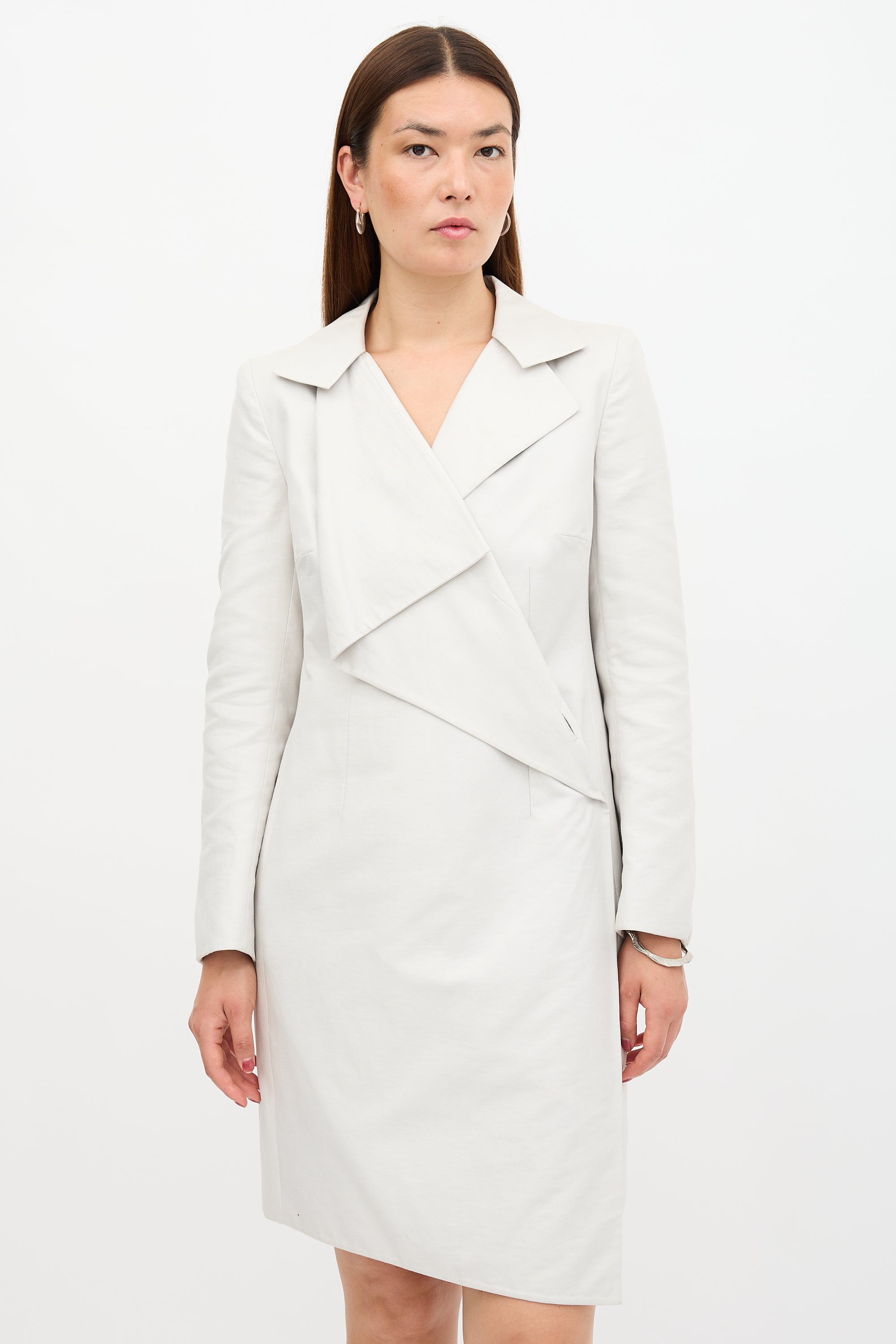 Pre-owned Akris beige trench dress featuring asymmetrical drape lapel collar, concealed snap button front, zip cuffs, and back storm shield. Lined.