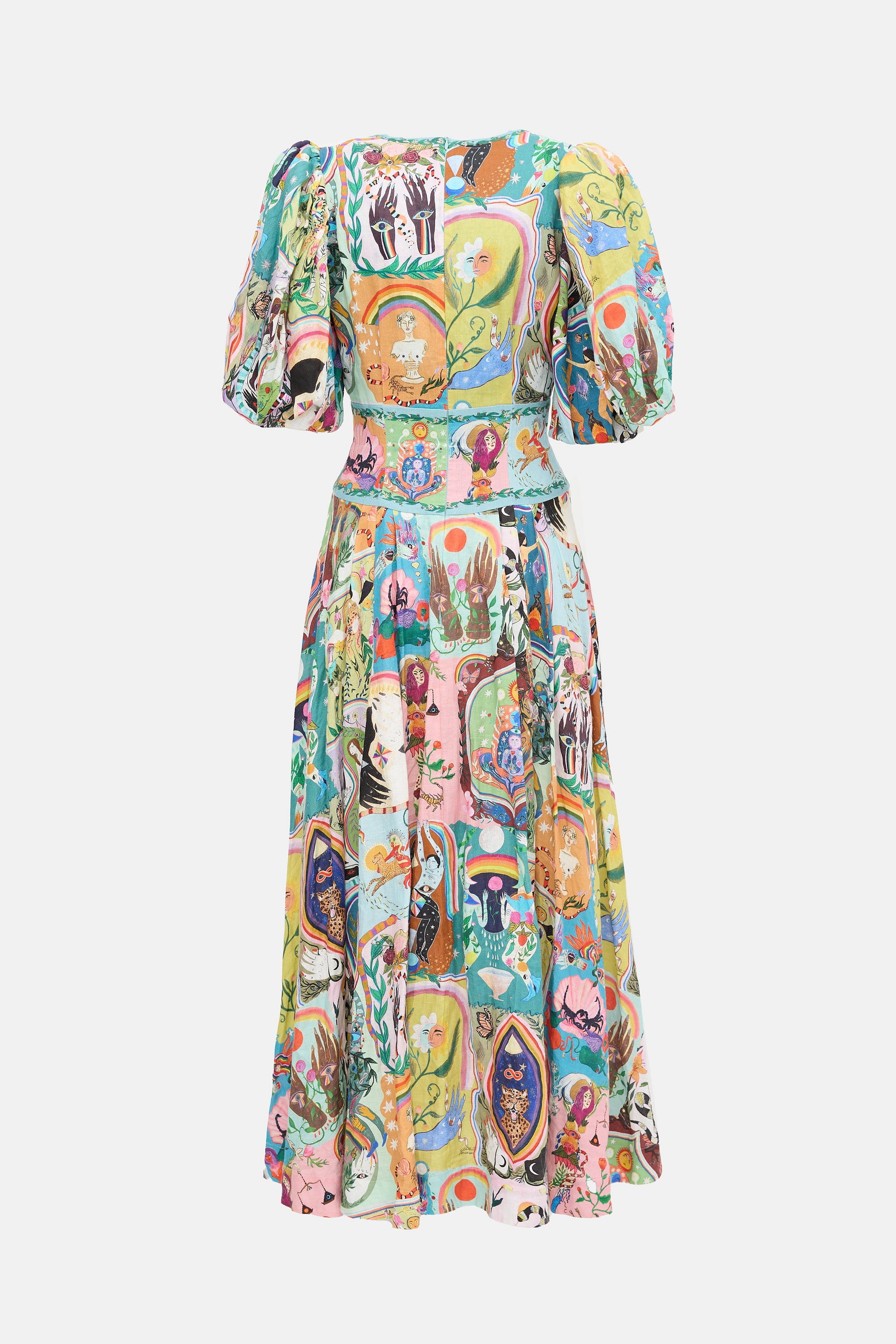 Pre-owned Alemais linen Evergreen dress featuring mixed multicolour illustrated prints, V-neckline, decorative button front, concealed back zip, puff sleeves, and pleated skirt. Lined.
