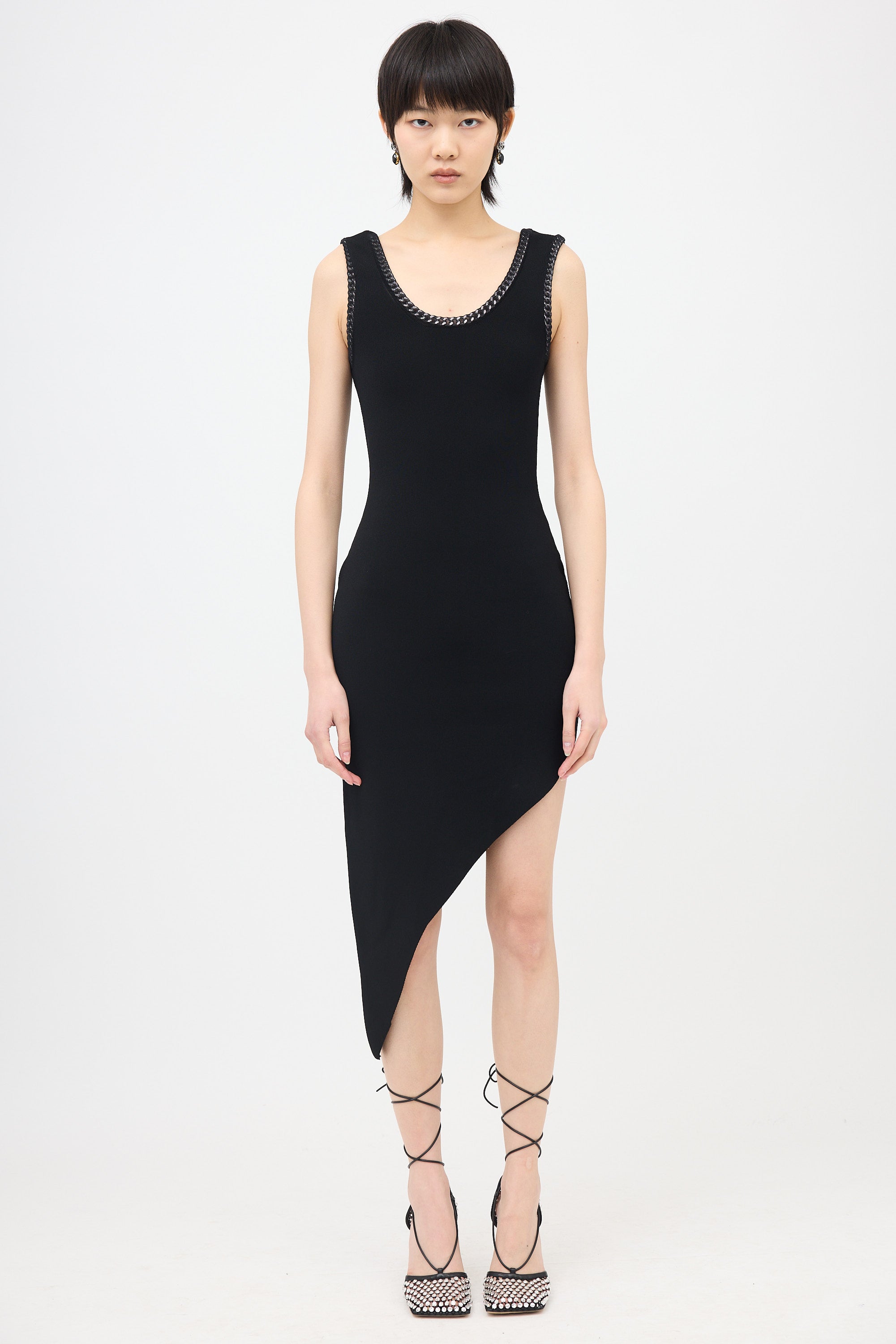 Pre-owned Alexander Wang black knit dress featuring a chain link trim with mesh covering, round neckline, and asymmetrical hem.