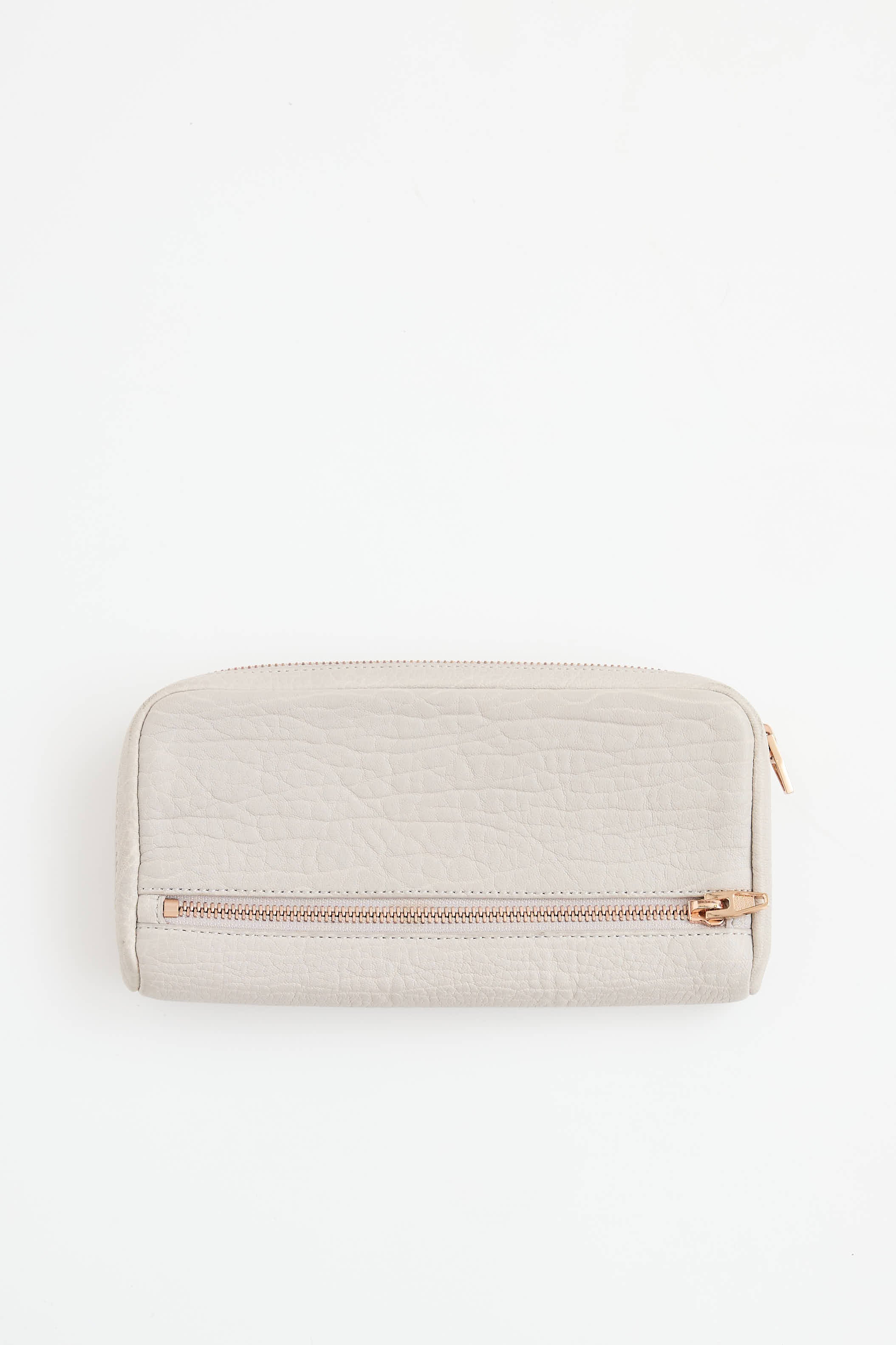 Pre-owned Alexander Wang grey continental wallet featuring pebbled leather upper, rose gold hardware, two zip pockets at front and back, top zip with two main compartments, one bill slot, 6 slip pockets, and eight card slots.