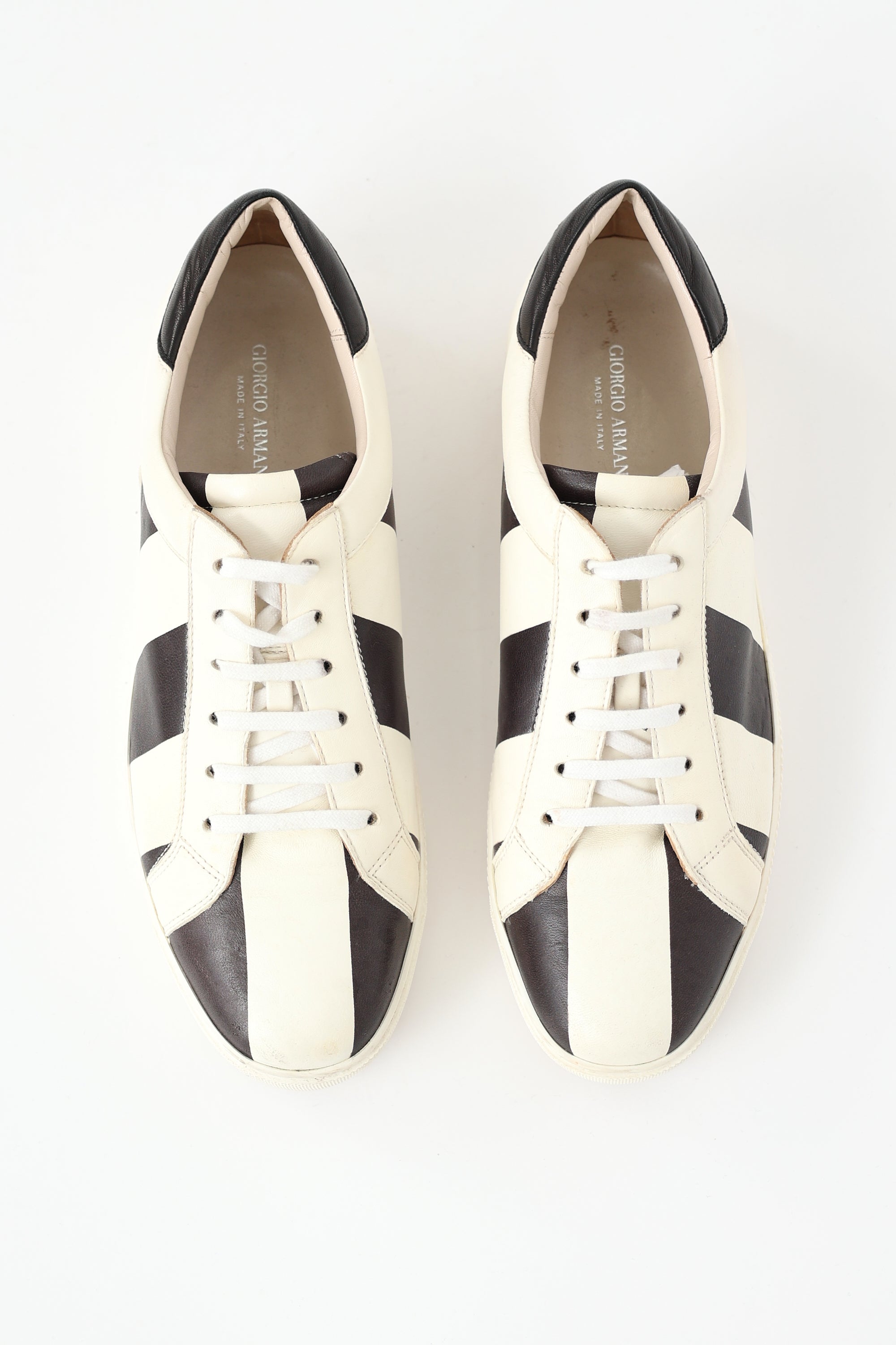 Pre-owned Giorgio Armani black and white leather sneakers featuring almond toe, colourblock upper, lace up front, and stamped logo at back.
