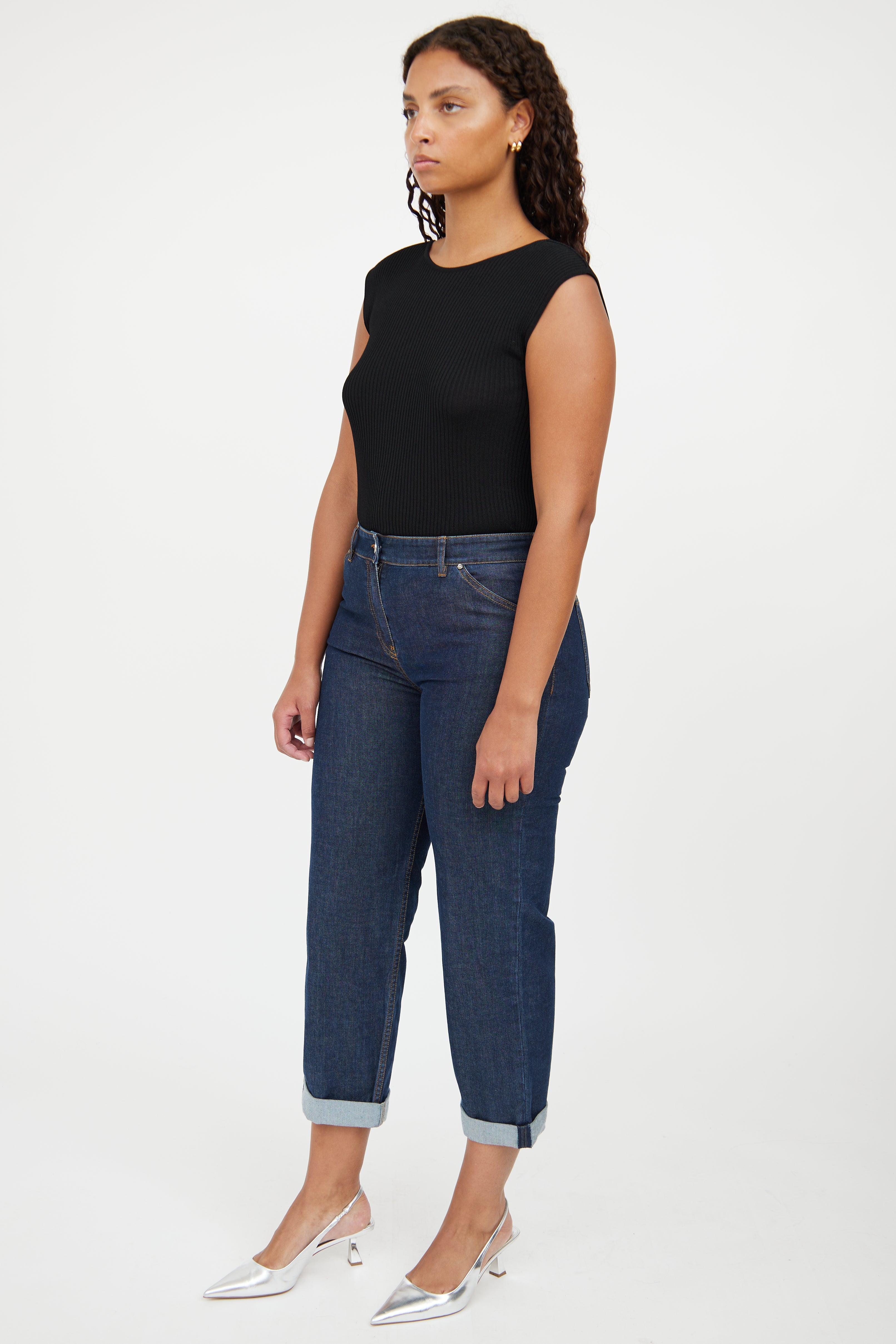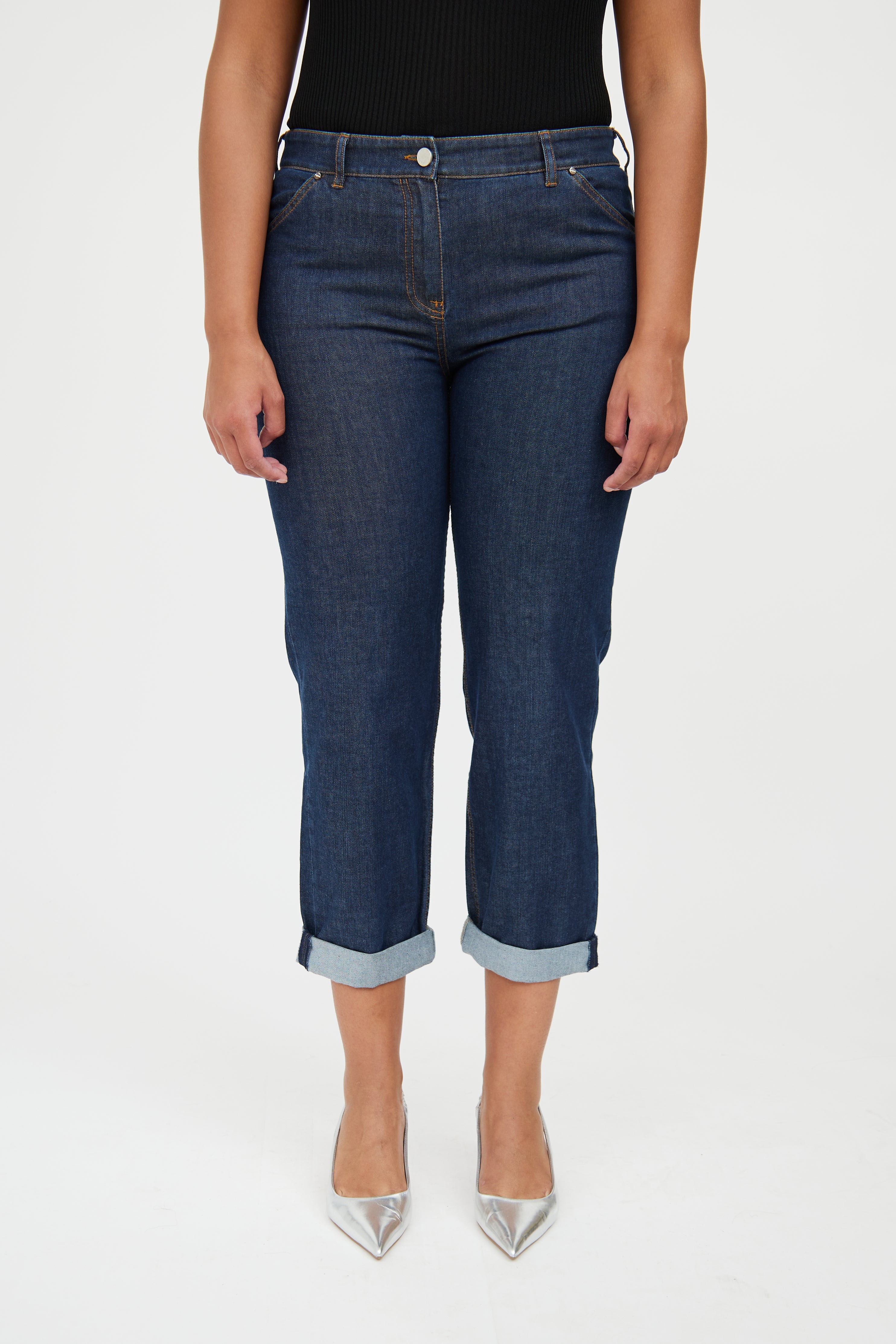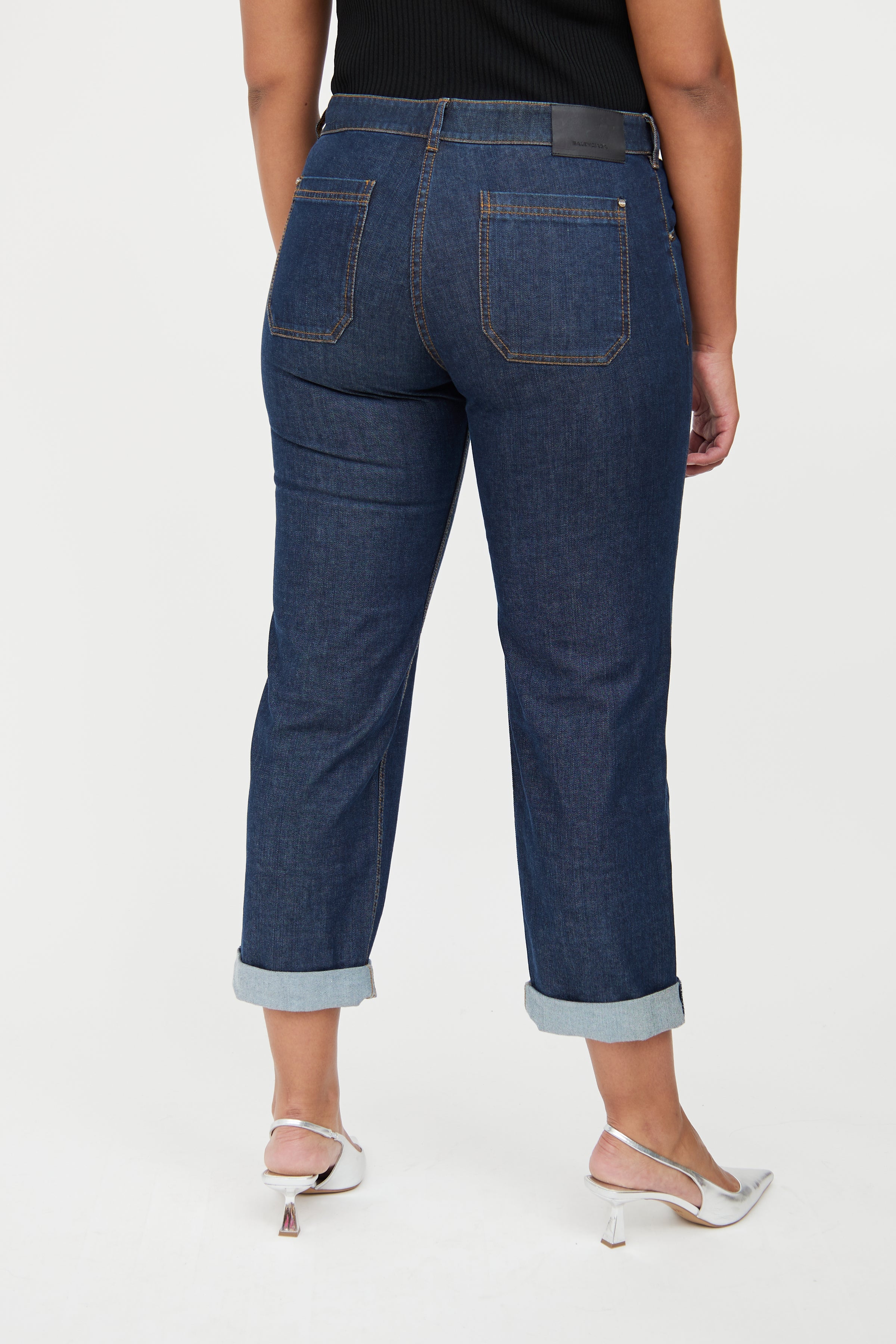 Pre-owned Balenciaga dark wash jeans featuring button and zip closure, belt loops on waist, dual slip pockets on hip, contrast stitching, straight leg and dual slip pockets on back.