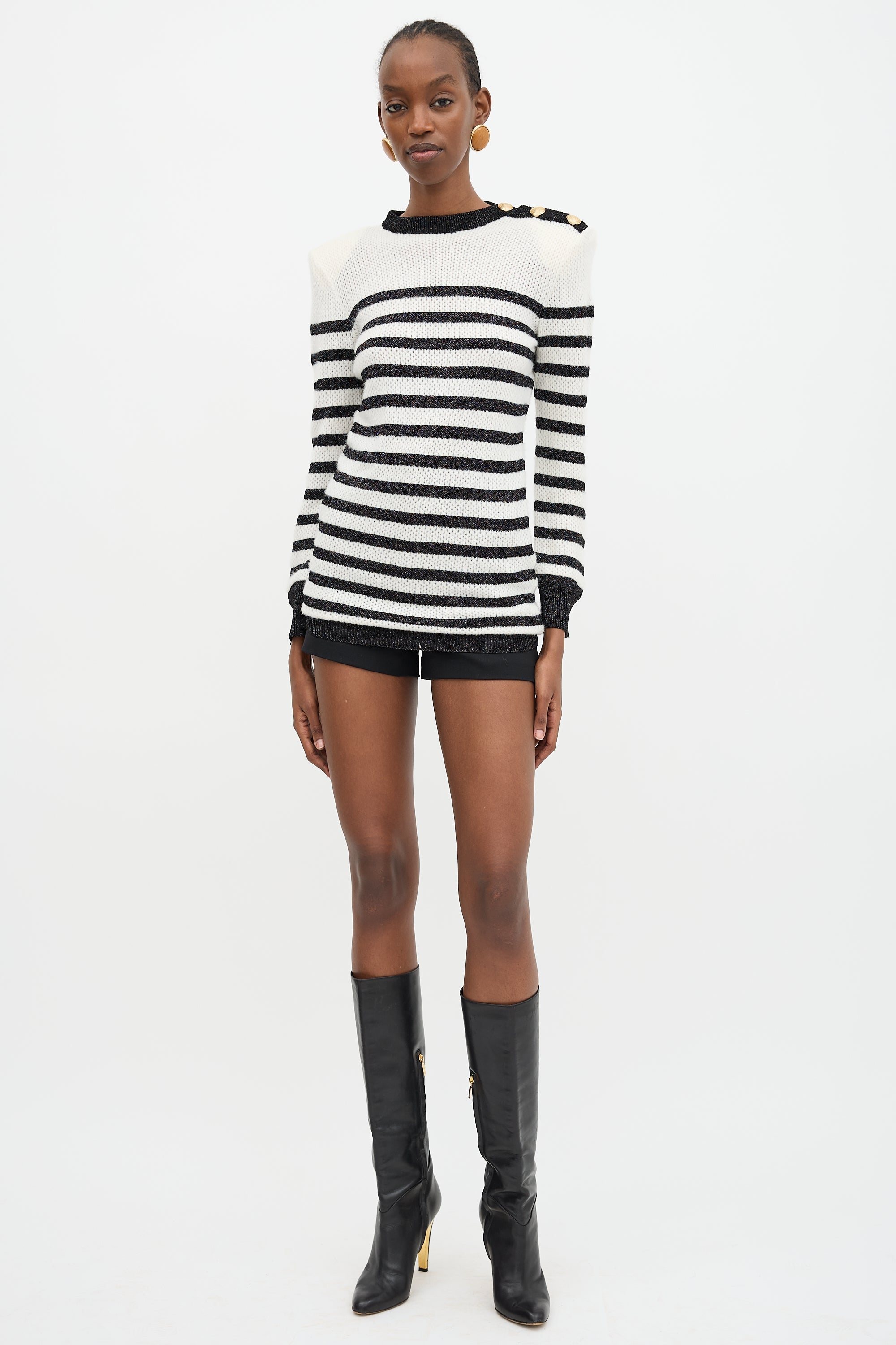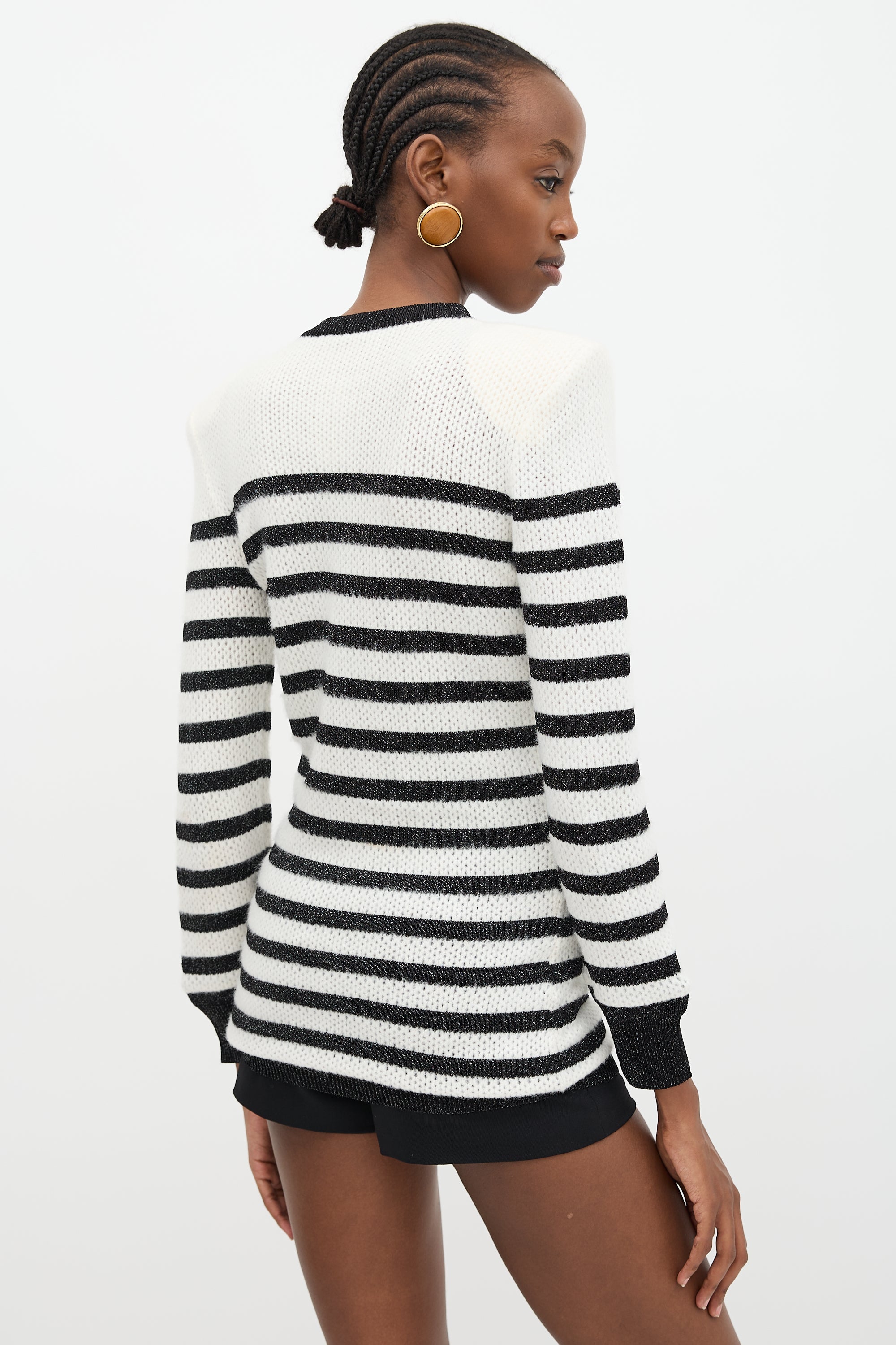 Pre-owned Balmain white knit sweater featuring a crew neckline, gold tone logo buttoned shoulder, padded shoulders, silver threading throughout black stripes, and a ribbed hem and cuffs.