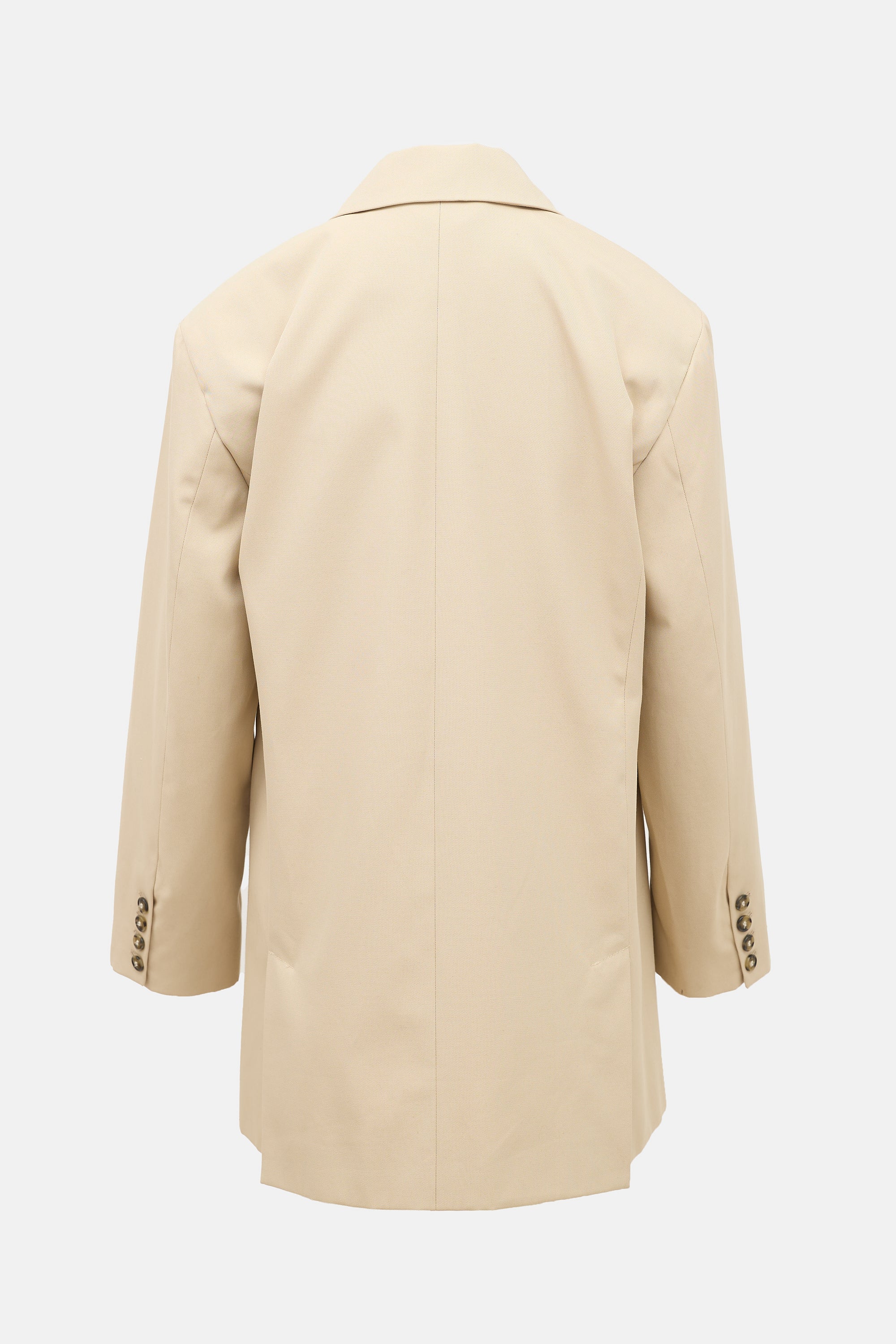 Pre-owned Birgitte Herskind beige Verner blazer featuring a notched collar, padded shoulder, asymmetrical button front, double welt pockets, and dual back vents. Lined.