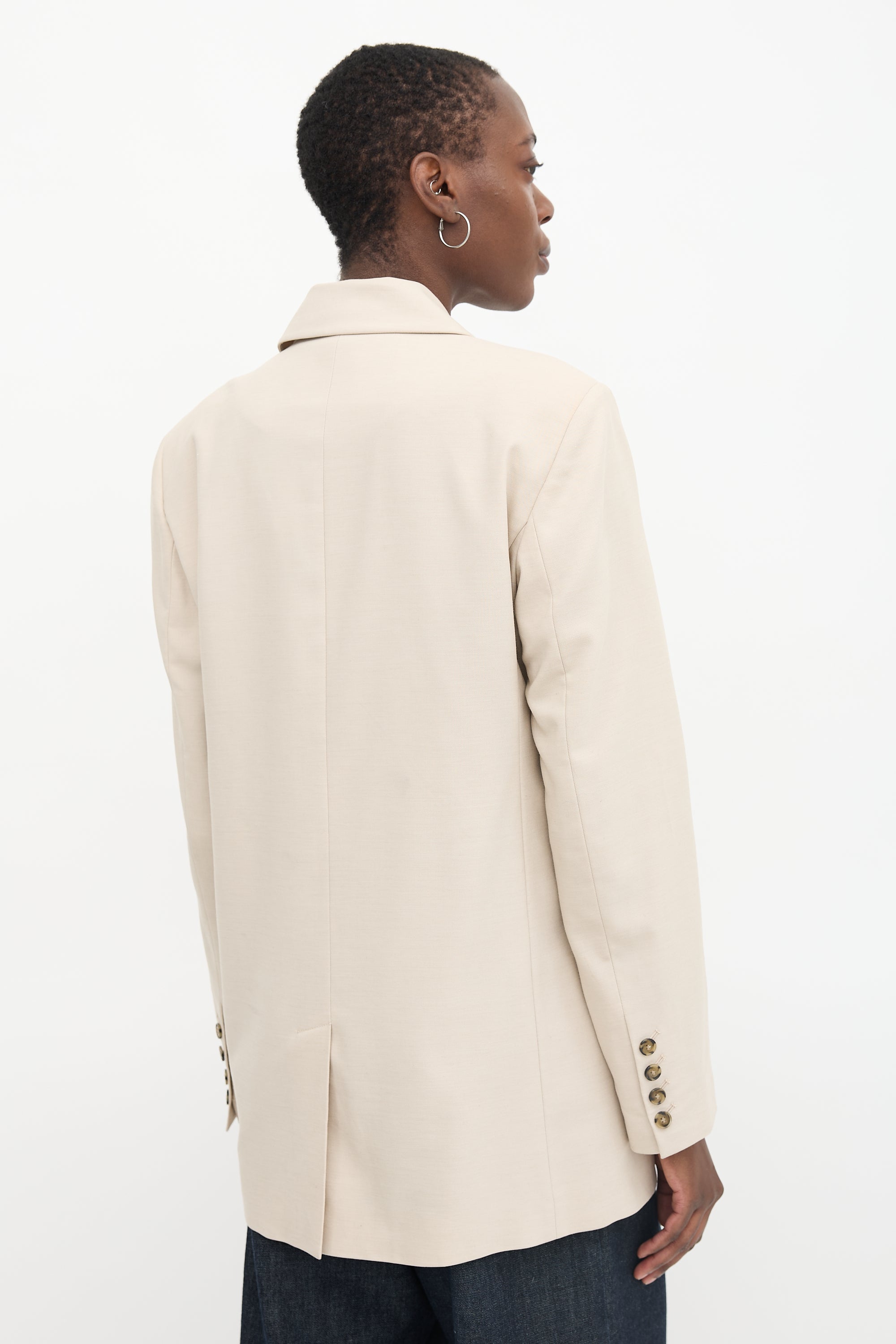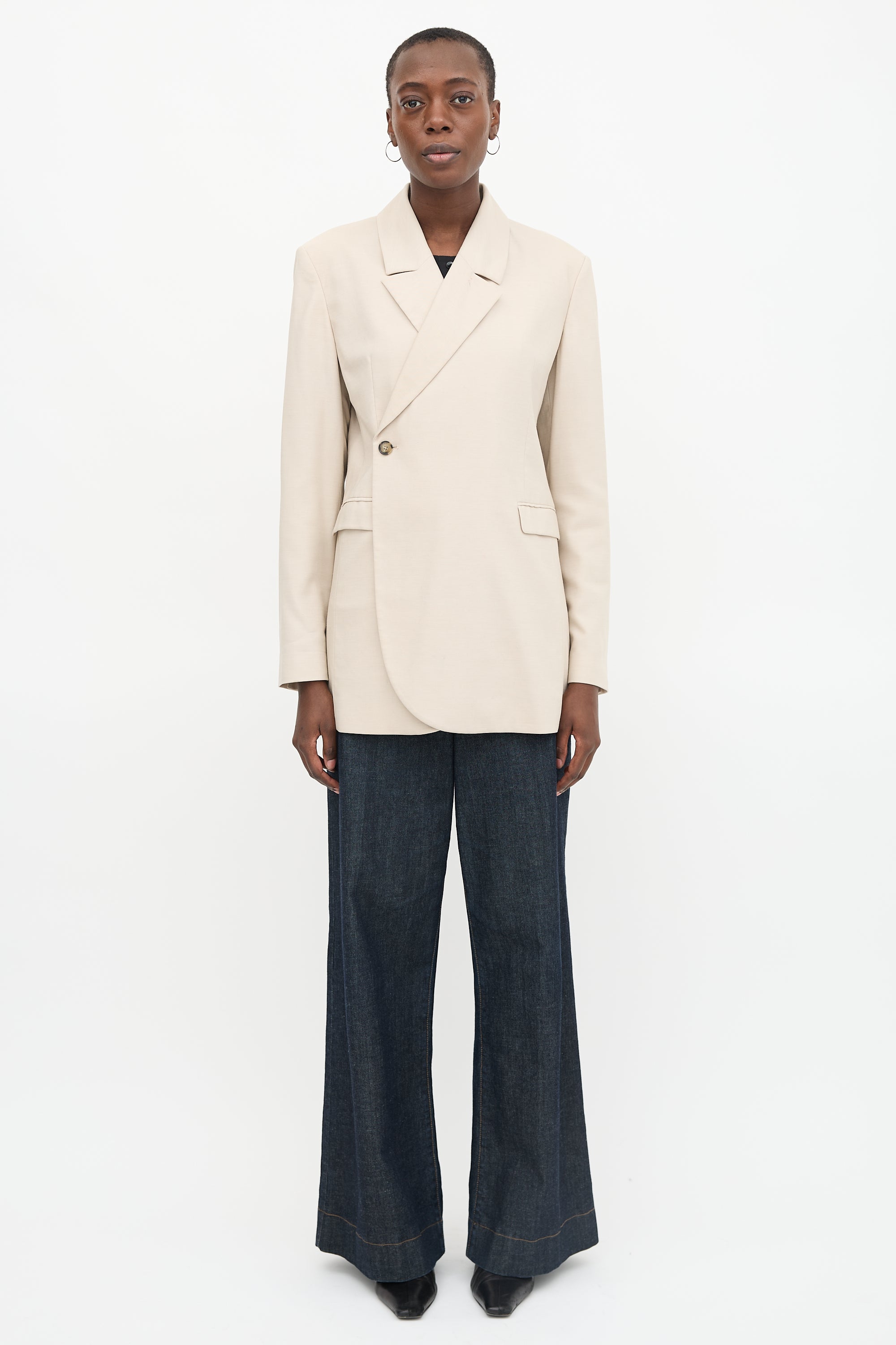 Pre-owned Birgitte Herskind beige Verner blazer featuring a peak lapel, padded shoulder, asymmetrical button front, double welt pockets, and back vent. Lined.