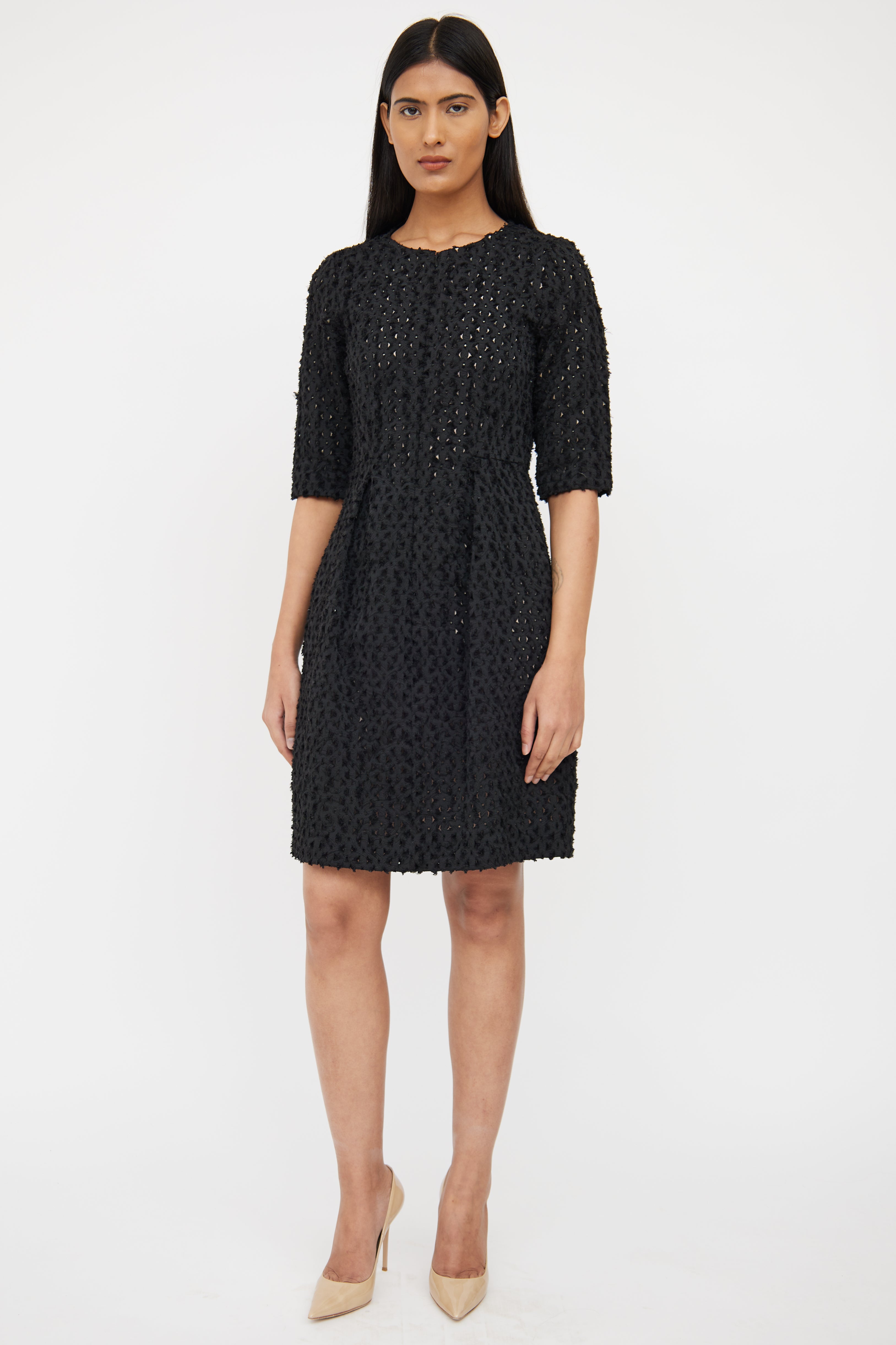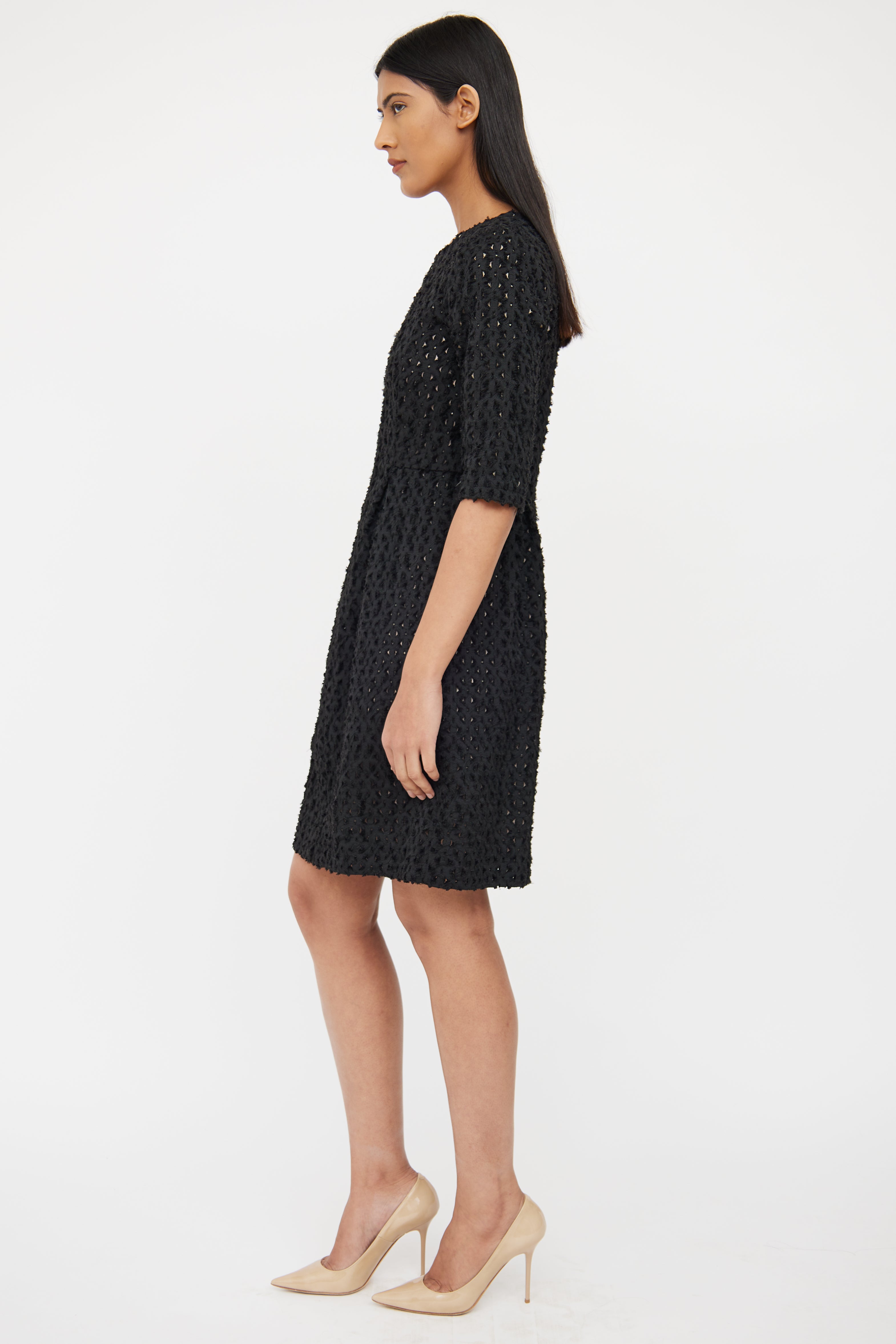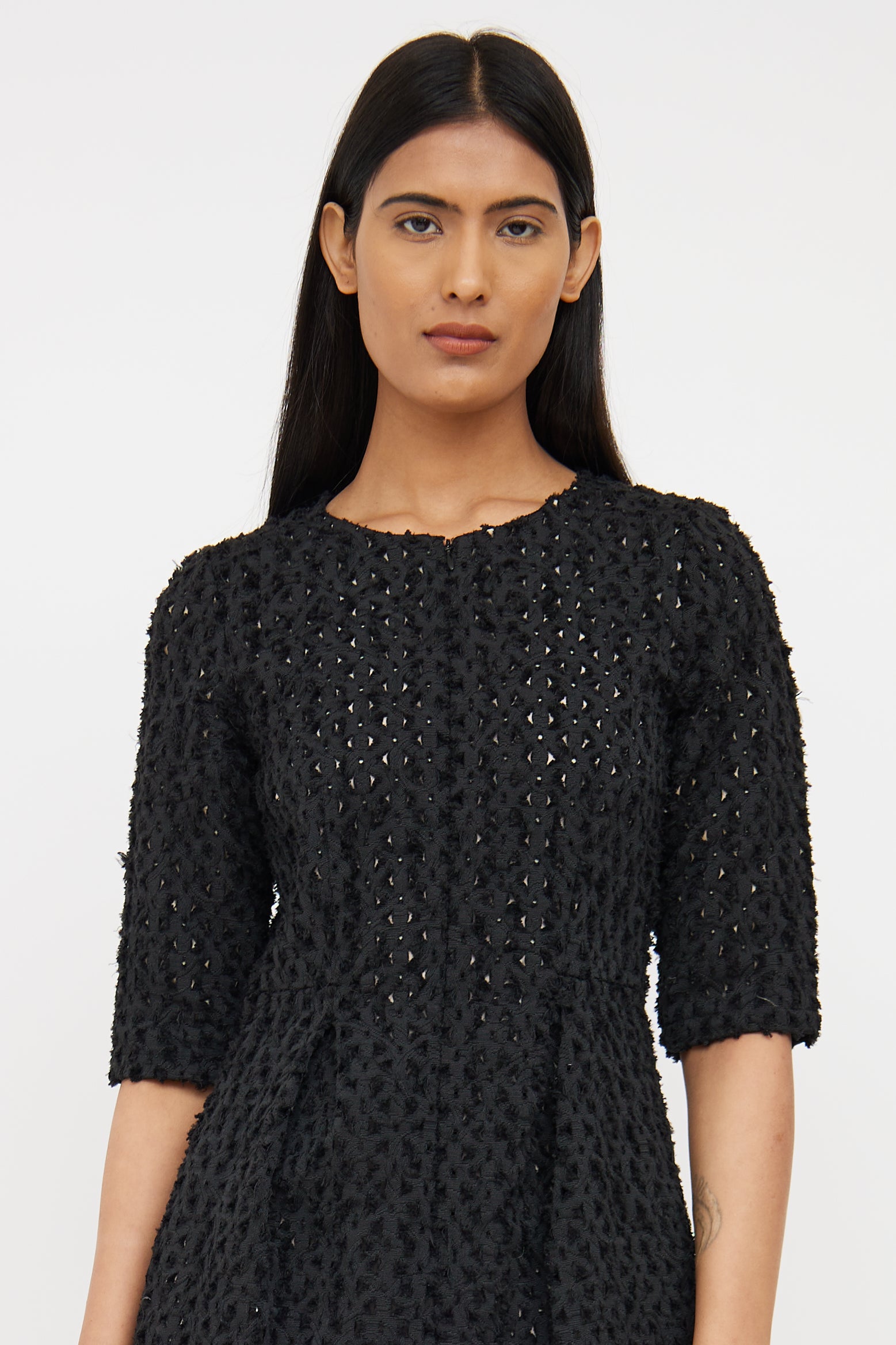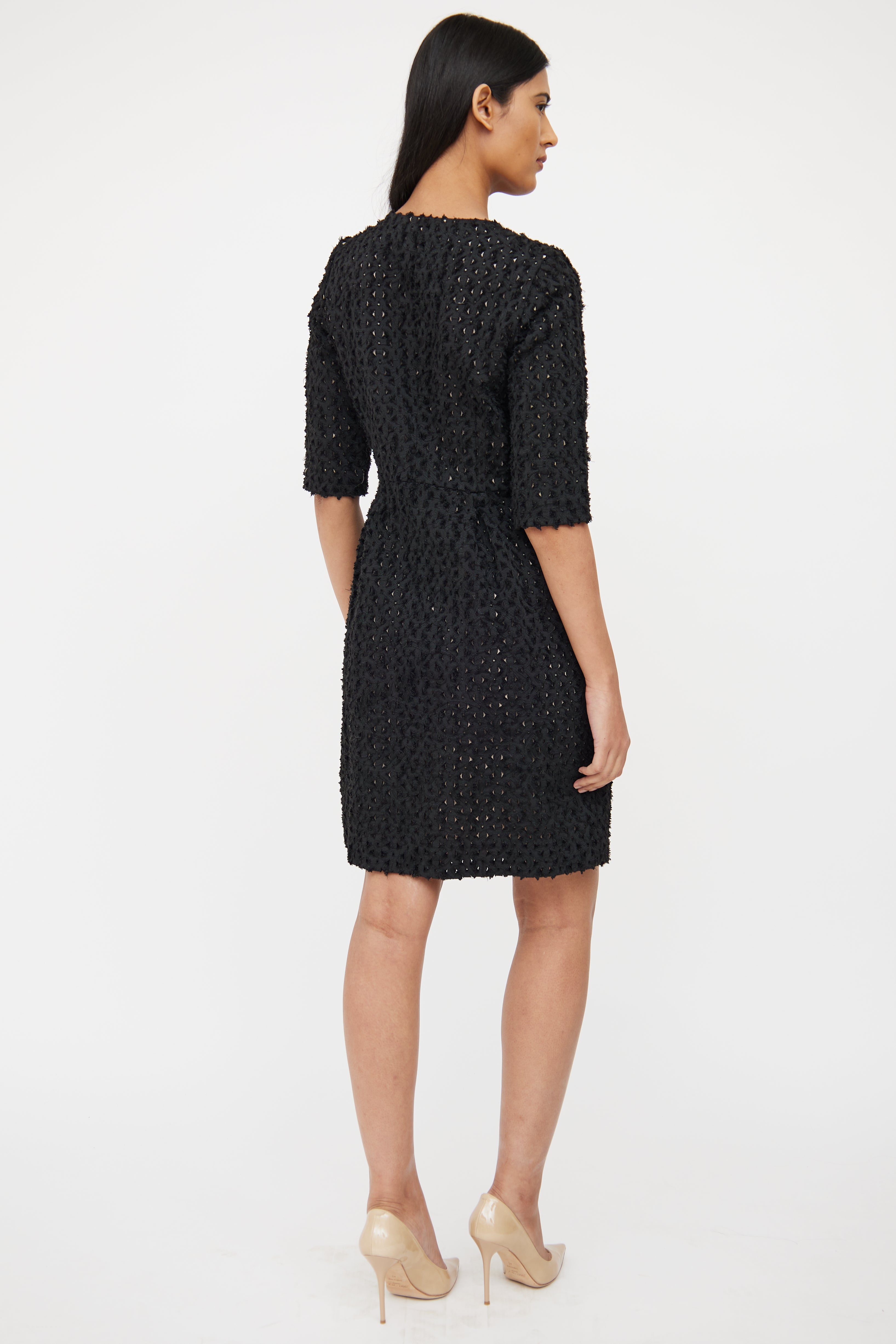 Pre-owned Dorothee Schumacher textured black dress featuring half sleeves, round neckline, concealed front zip closure, pleated mid length skirt and slip pockets at side. Fully lined.