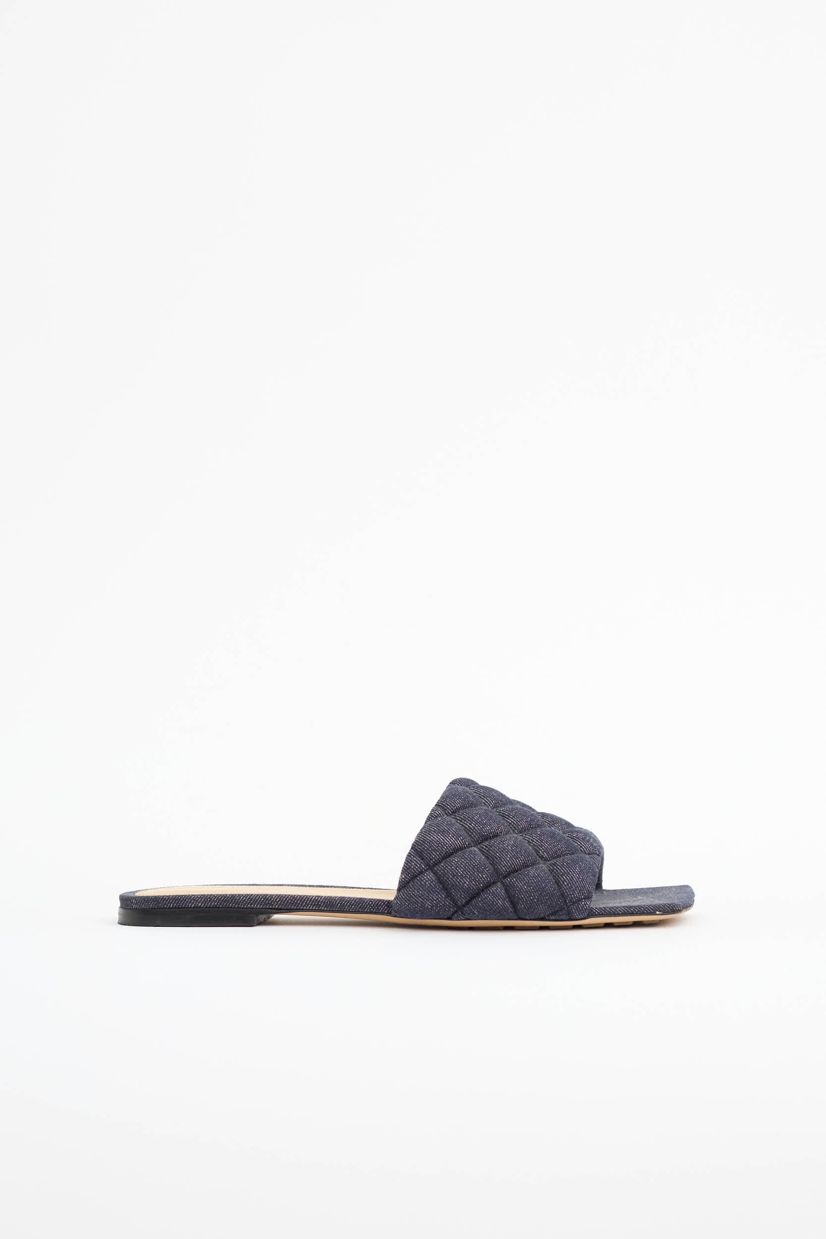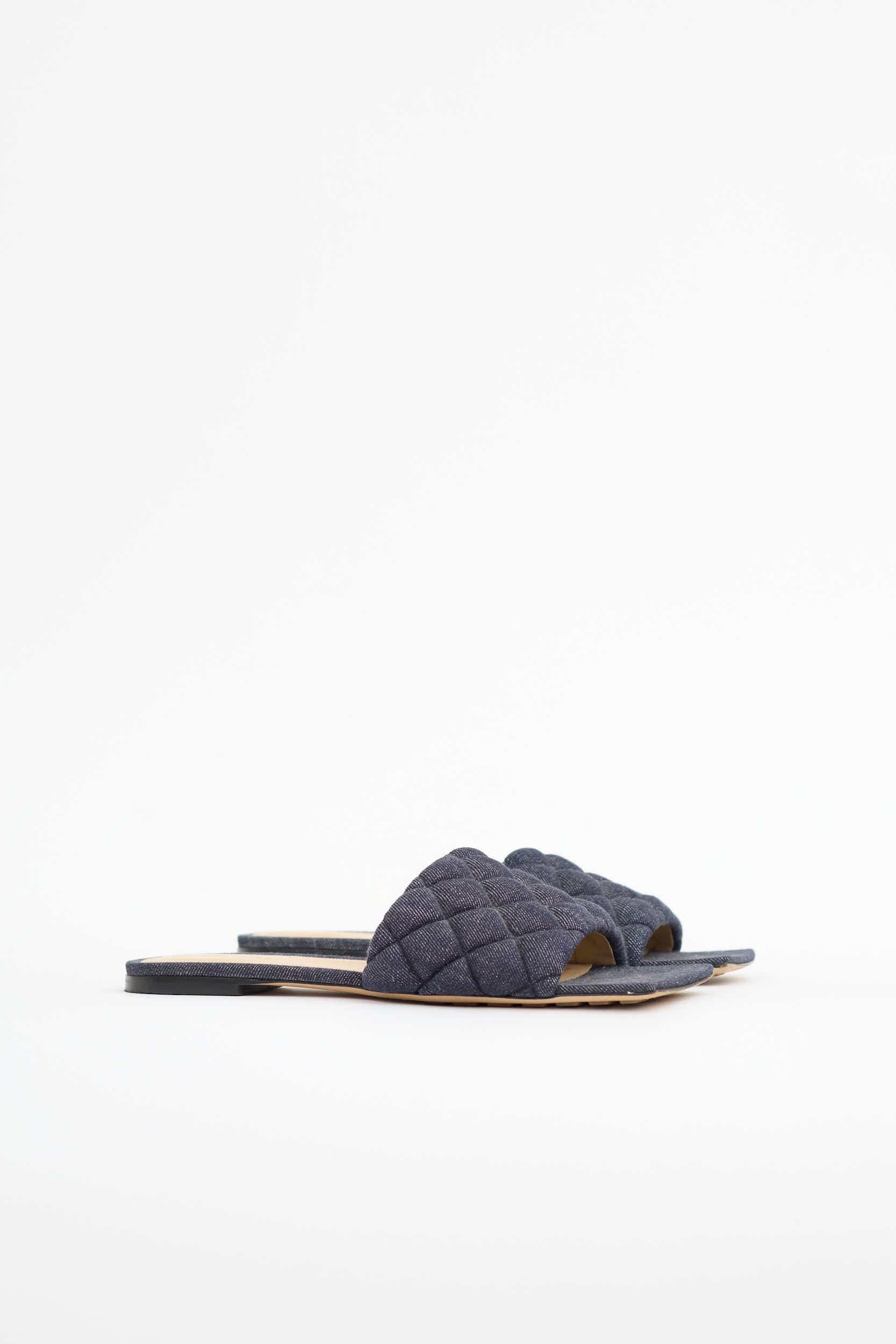 Pre-owned Bottega Veneta dark wash quilted denim slides featuring open square toe, slip on entry, quilted upper, and rubber treaded outsole.