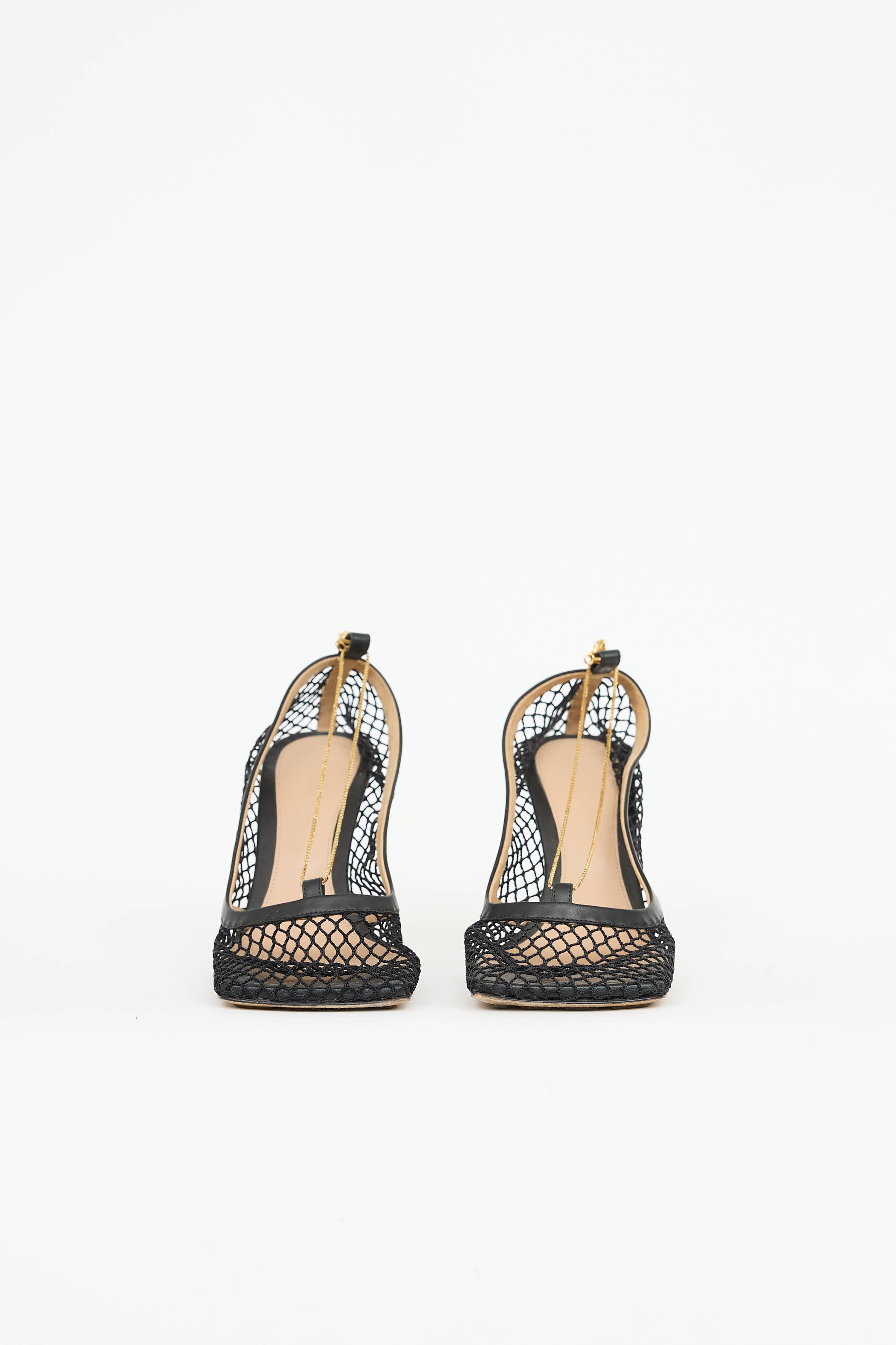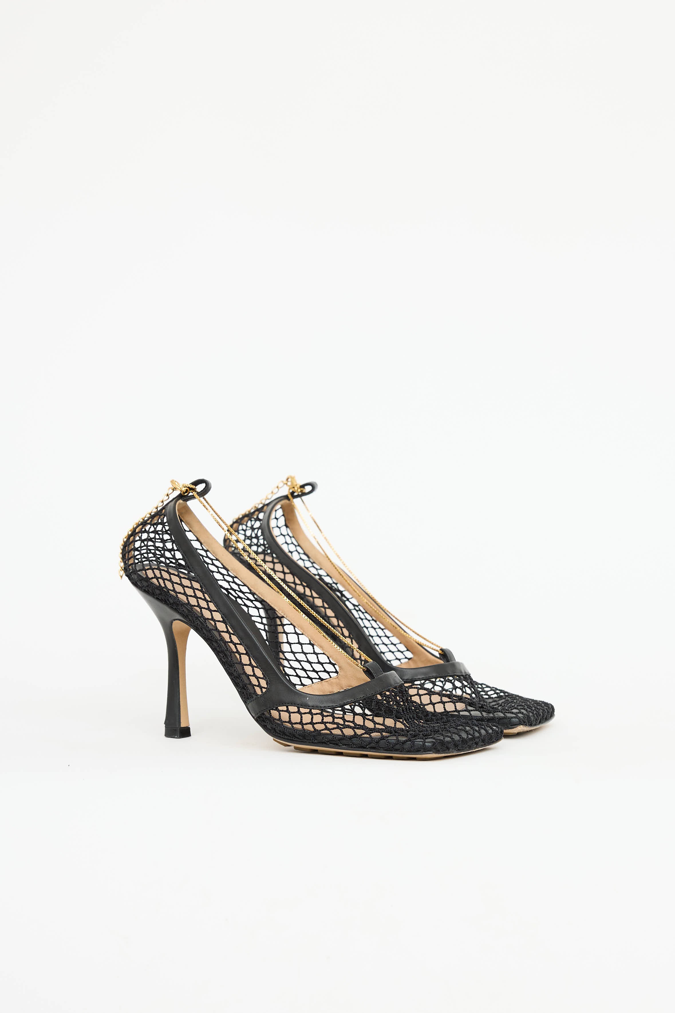 Pre-owned Bottega Veneta black pump featuring square toe, mesh and leather upper, gold tone chain embellishment, covered heel, and treaded outsole.