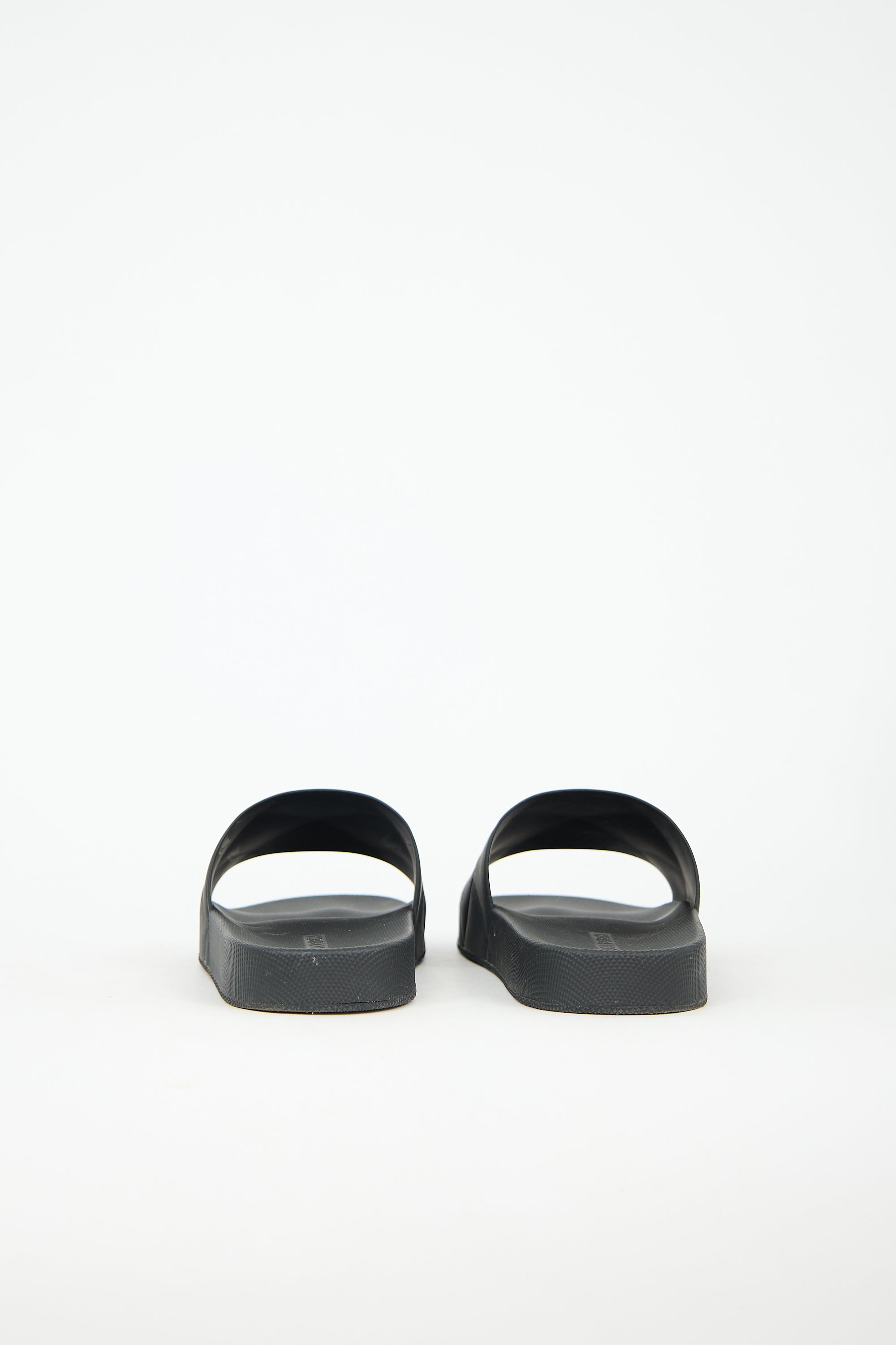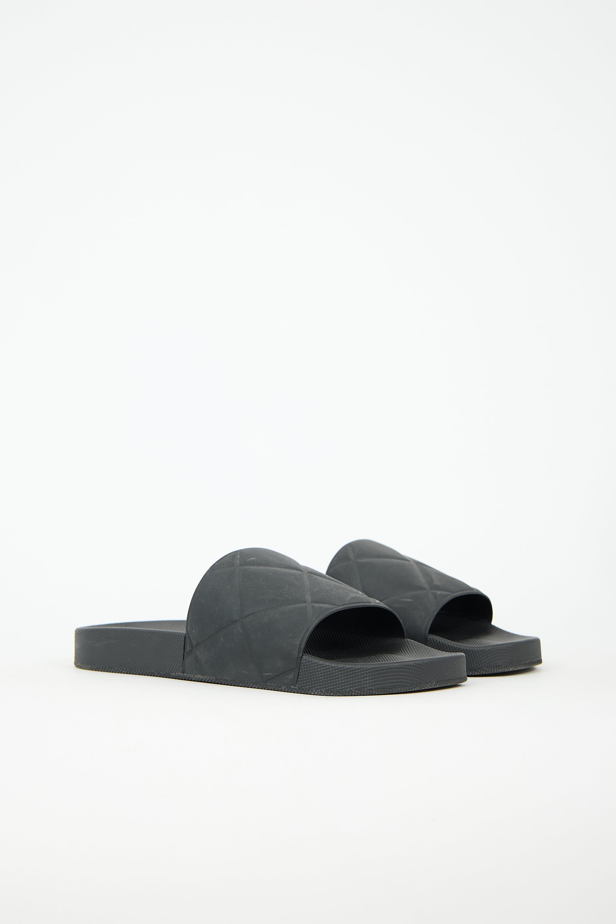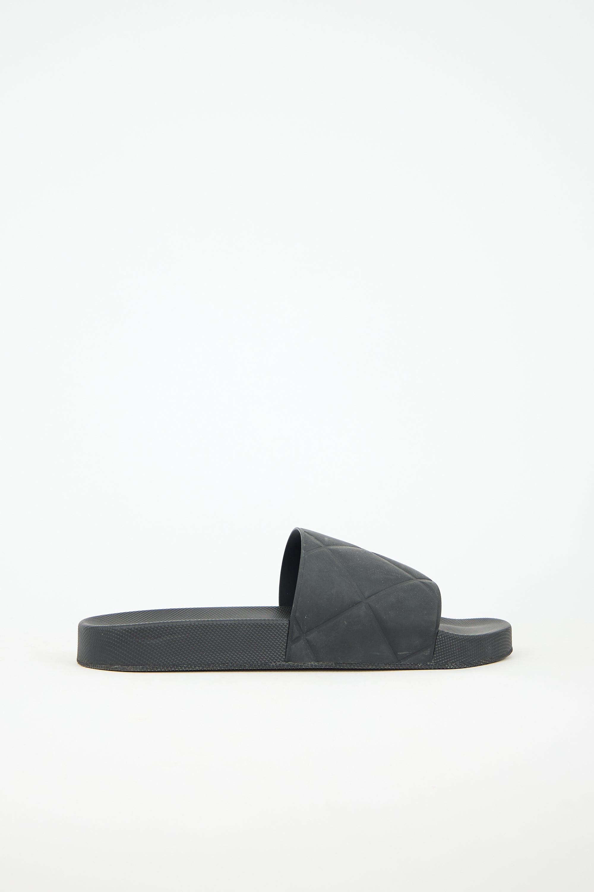 Pre-owned Bottega Veneta black rubber slides featuring open rounded toe and quilt motif vamp strap.