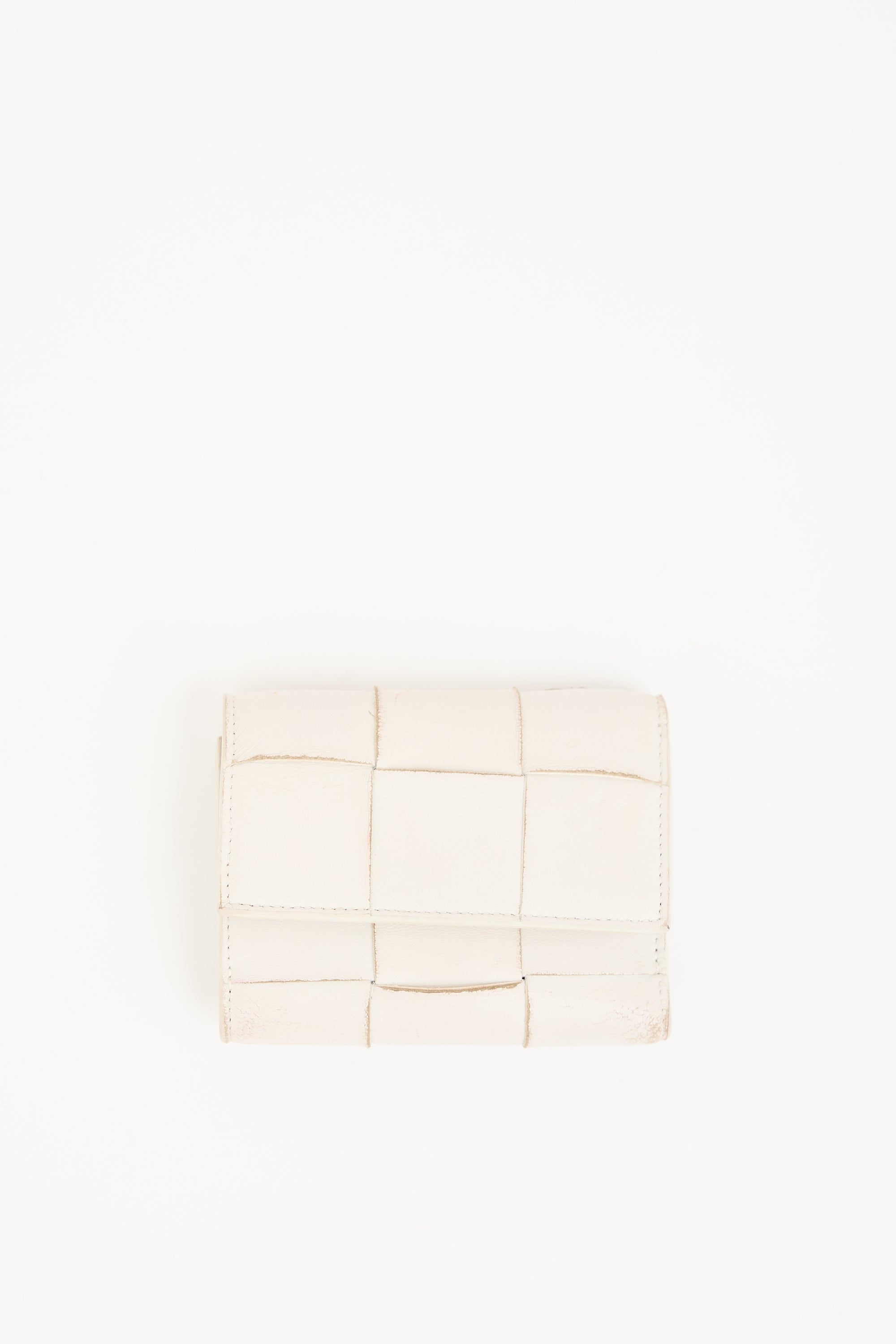 Pre-owned Bottega Veneta white leather wallet featuring snap button closure, one bill compartment, two slip pockets, six card slots, one zip pouch, and Intrecciato woven exterior. Comes with original dust bag.