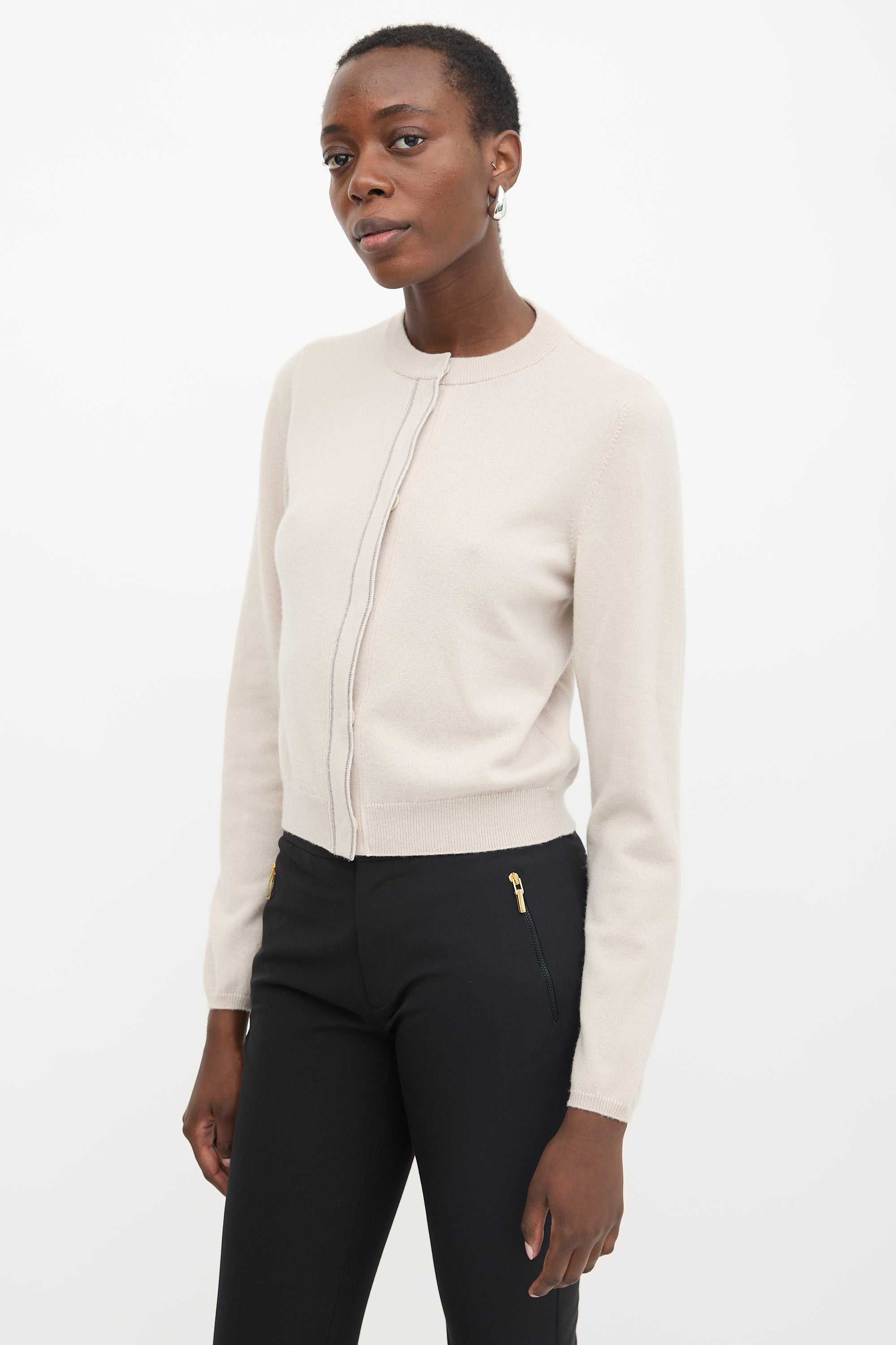 Pre-owned Brunello Cucinelli grey cashmere cardigan featuring a crew neckline, concealed snap button front with monili trimmed front, and a ribbed hem and cuffs.