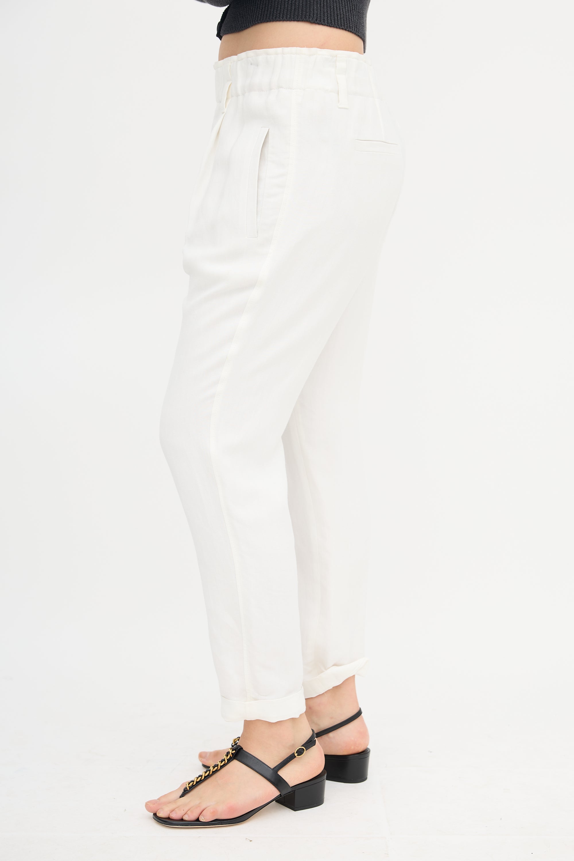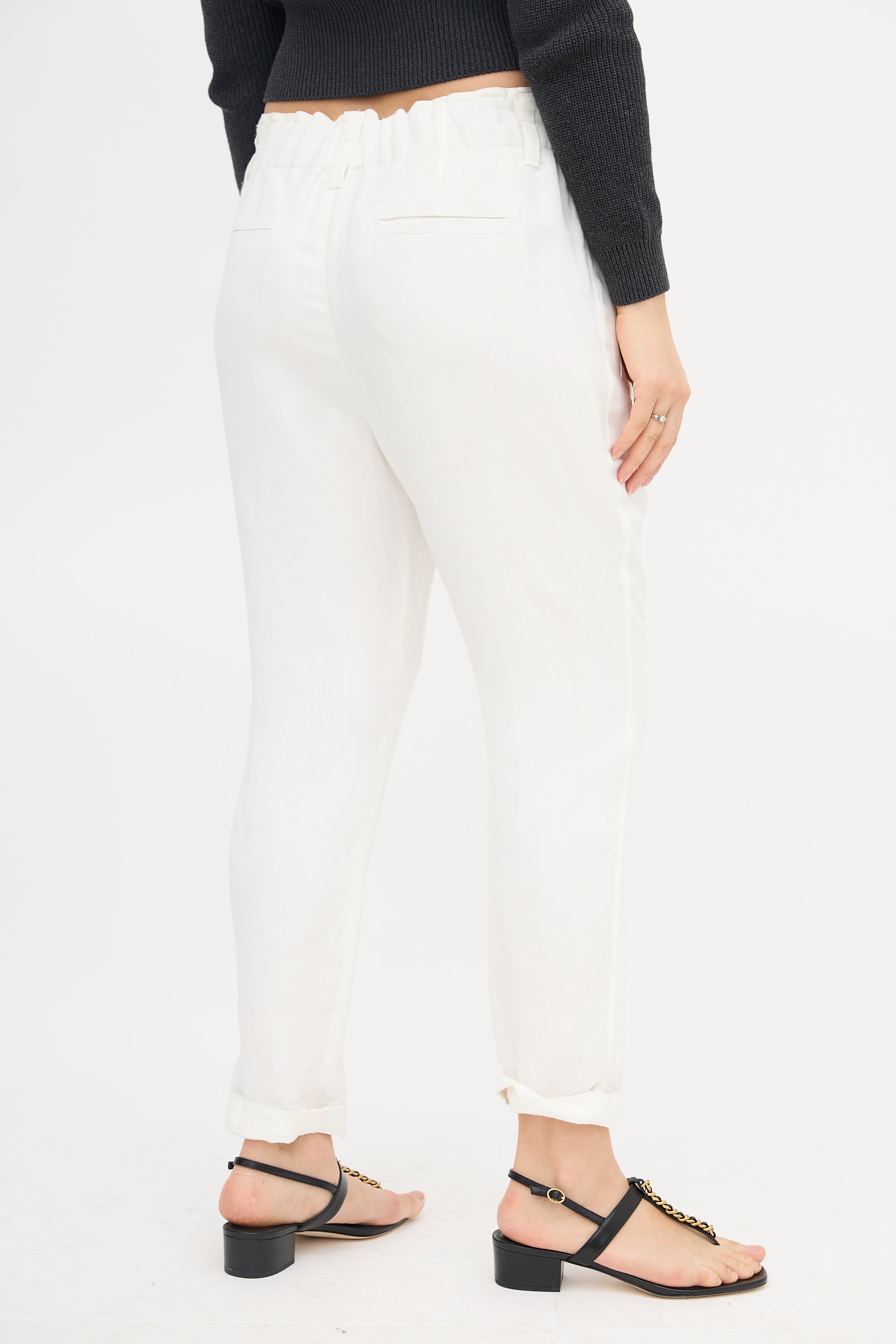 Pre-owned Brunello Cucinelli white linen blend trousers featuring elasticized waist, belt loops, front pleats, dropped seat, tapered leg, fold over hem, and four pocket styling. Does not come with belt.