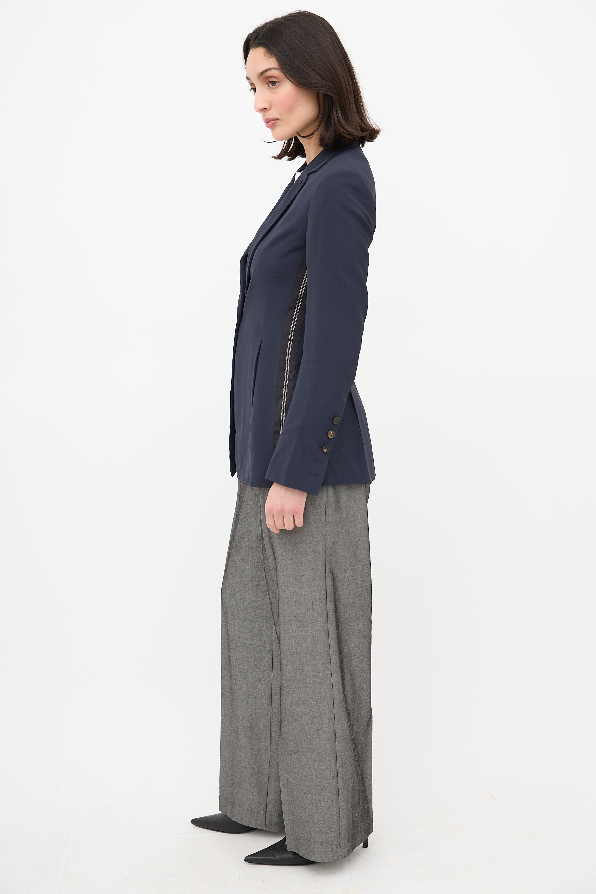 Pre-owned Brunello Cucinelli navy blazer featuring a notched lapel, single button front, two slash pockets at hip, ribbon Monili trim at side, buttoned cuffs, and a double back vent. Lined.