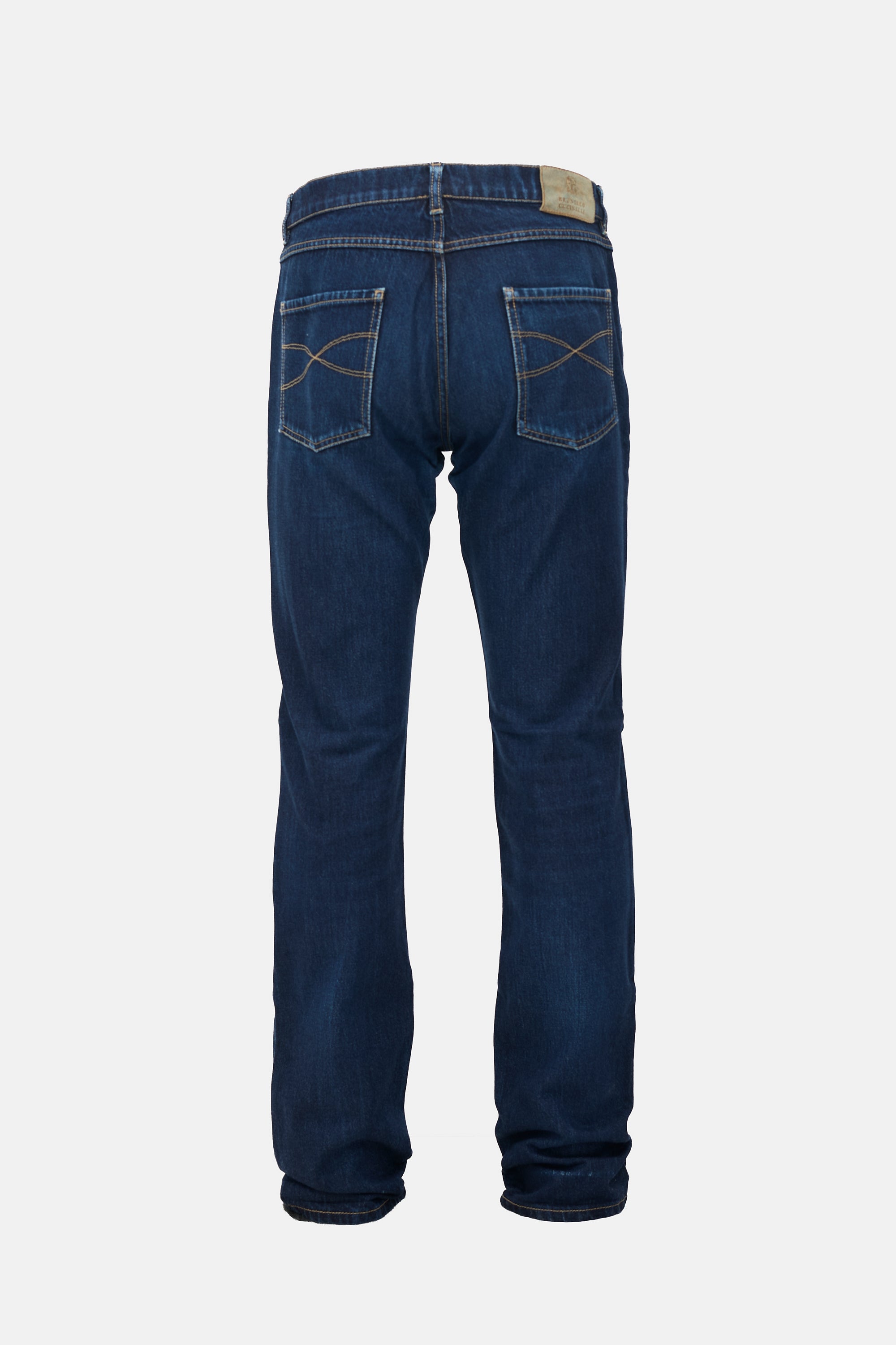 Pre-owned Brunello Cucinelli dark wash jeans featuring belt loops, button fly, five pocket styling with embroidered logo, Jacron patch at back, and slim leg.
