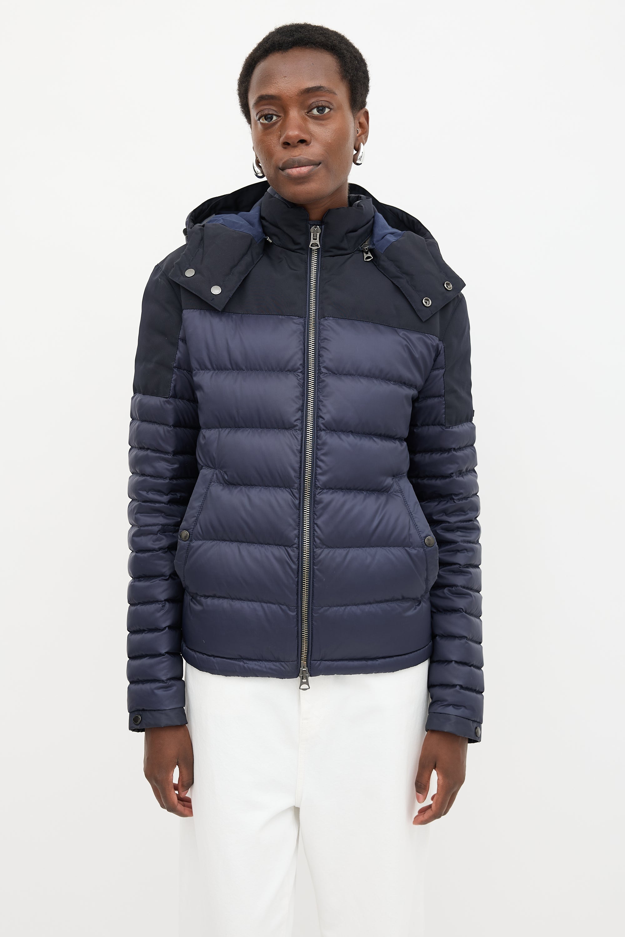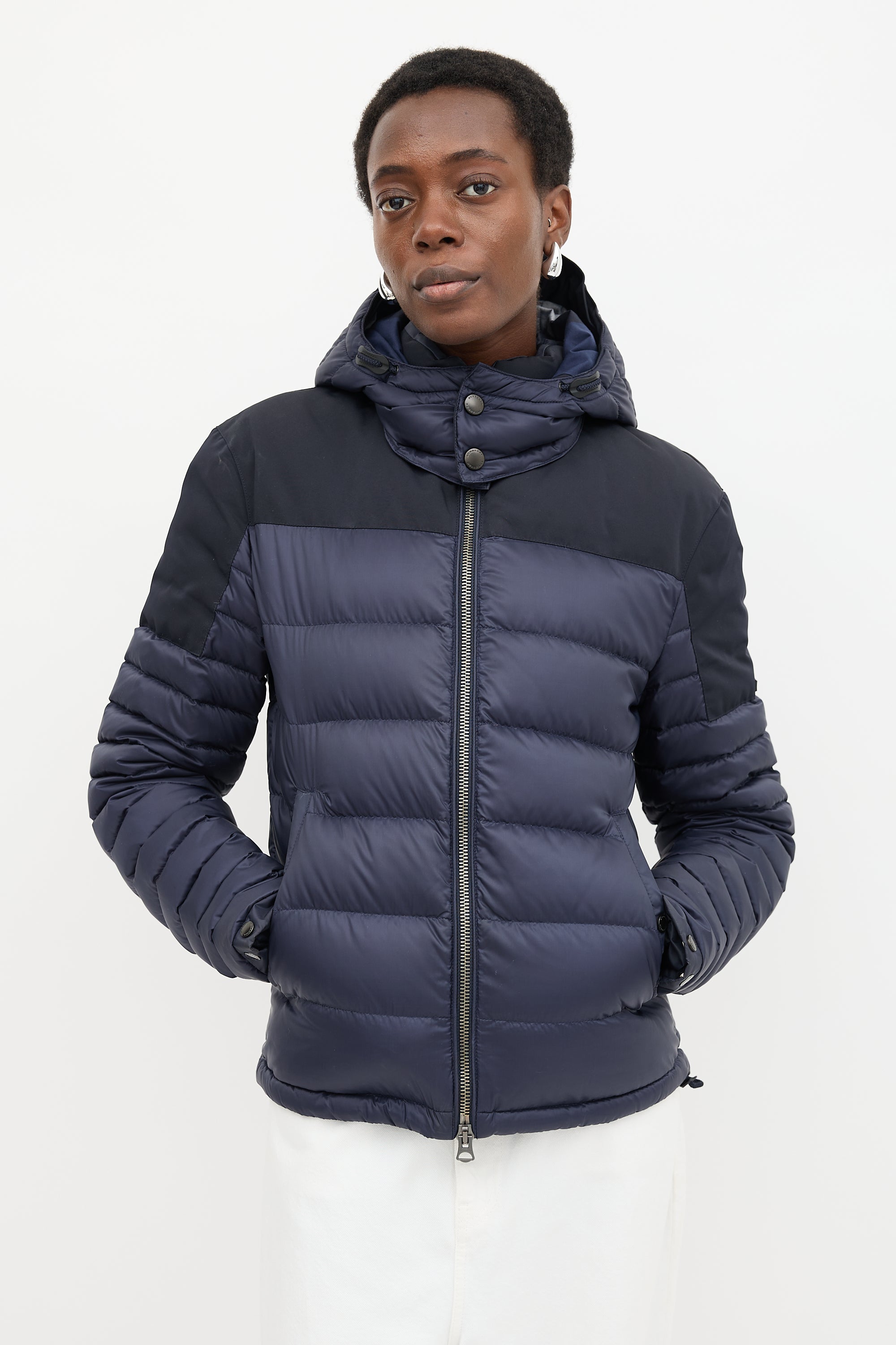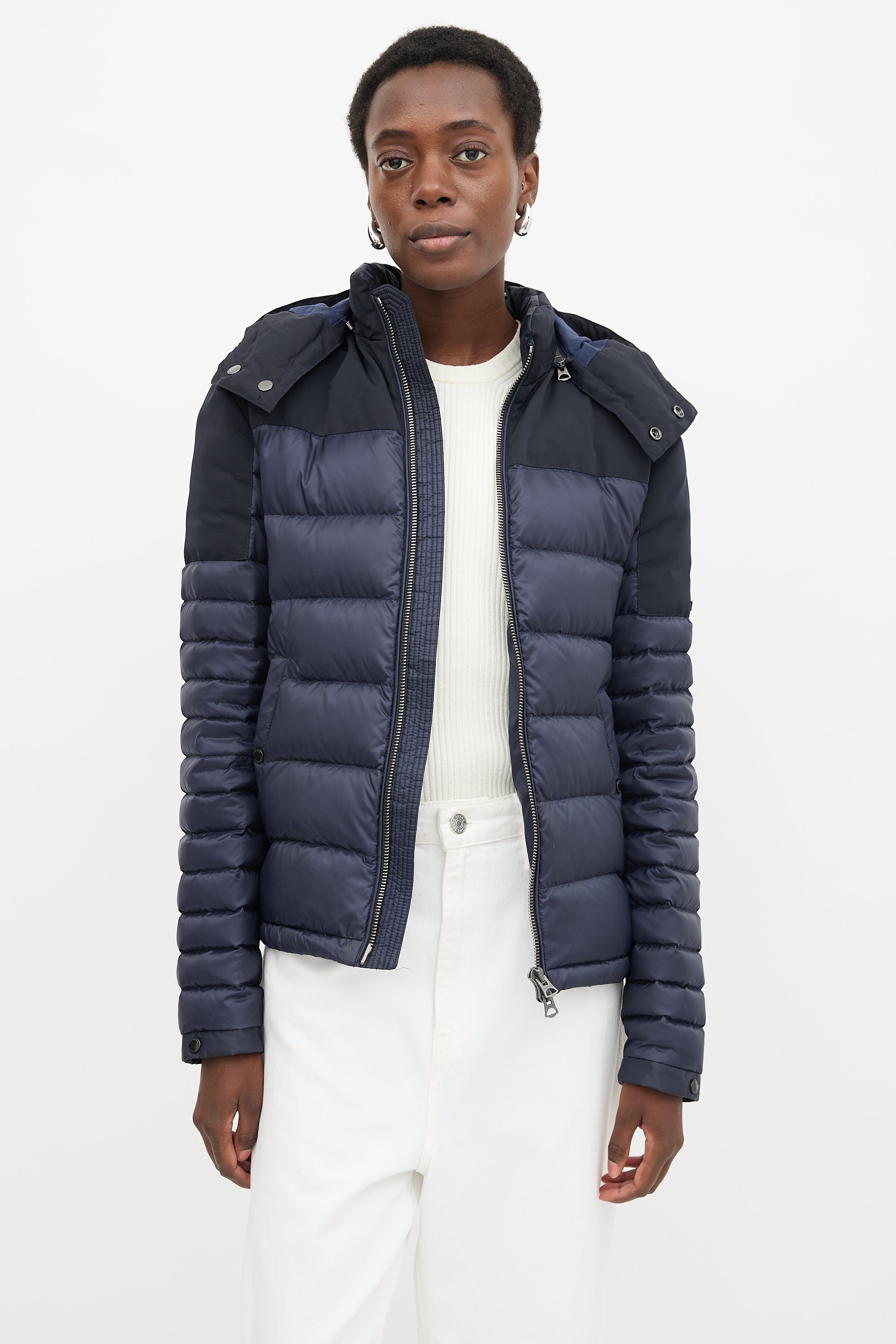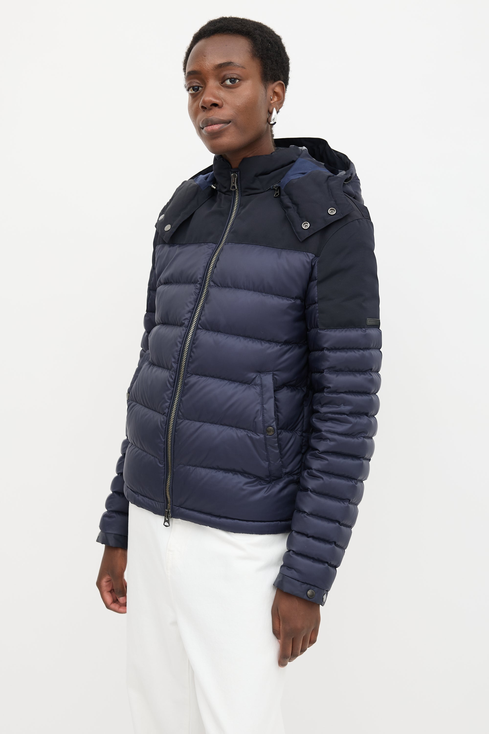 Pre-owned Burberry navy quilted down puffer jacket featuring a funnel collar, removable zip hood with check lining, dual zip front, rubber logo patch at left arm, two buttoned welt pockets, cinchable hem, and buttoned cuffs.