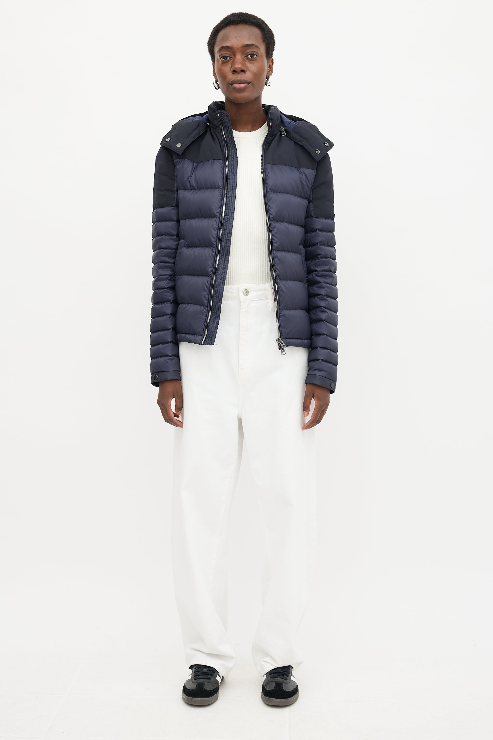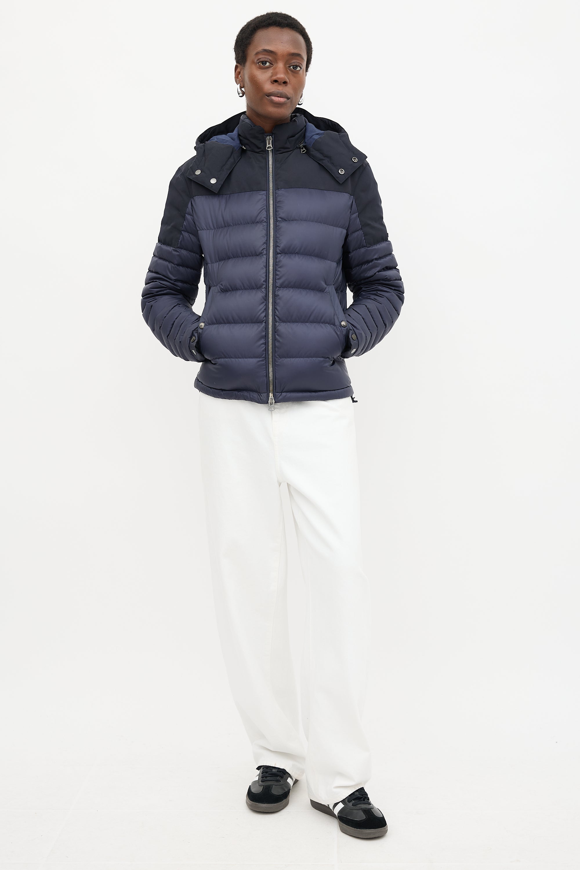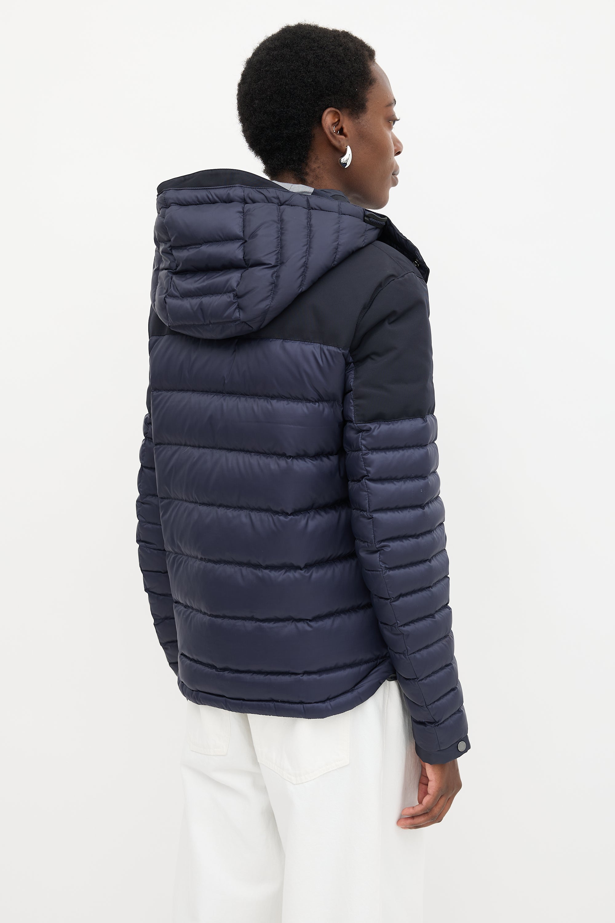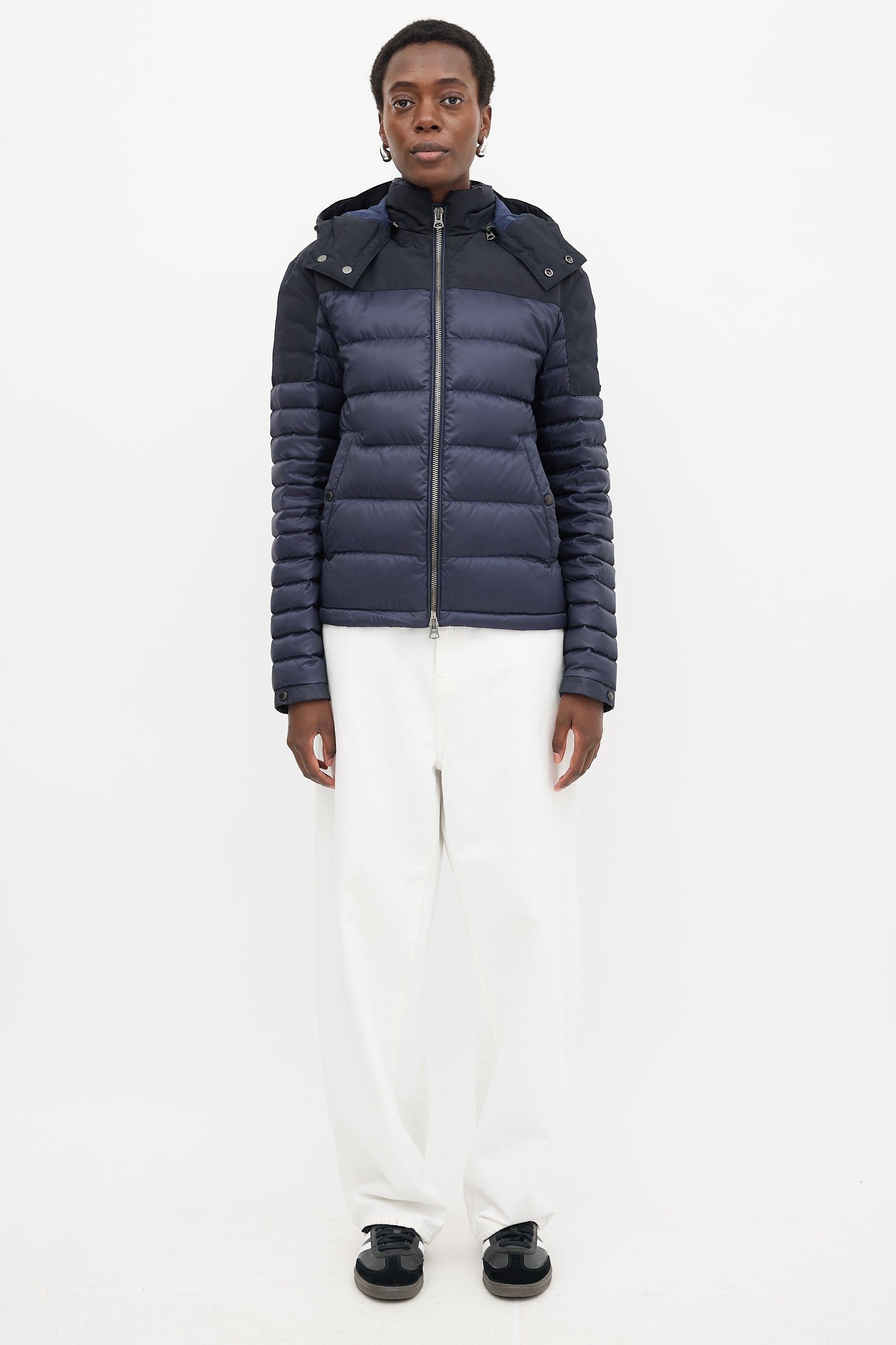 Pre-owned Burberry navy quilted down puffer jacket featuring a funnel collar, removable zip hood with check lining, dual zip front, rubber logo patch at left arm, two buttoned welt pockets, cinchable hem, and buttoned cuffs.
