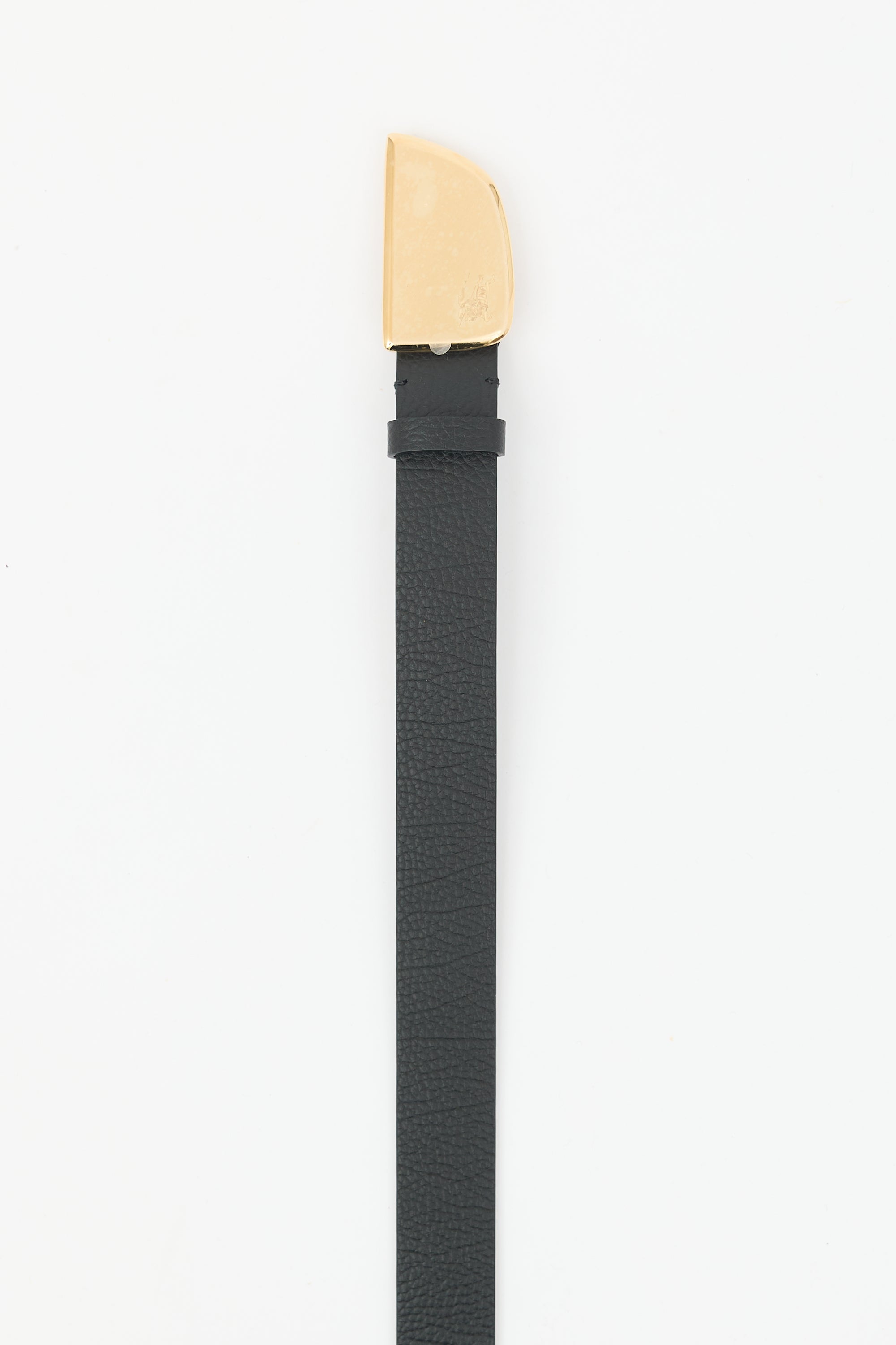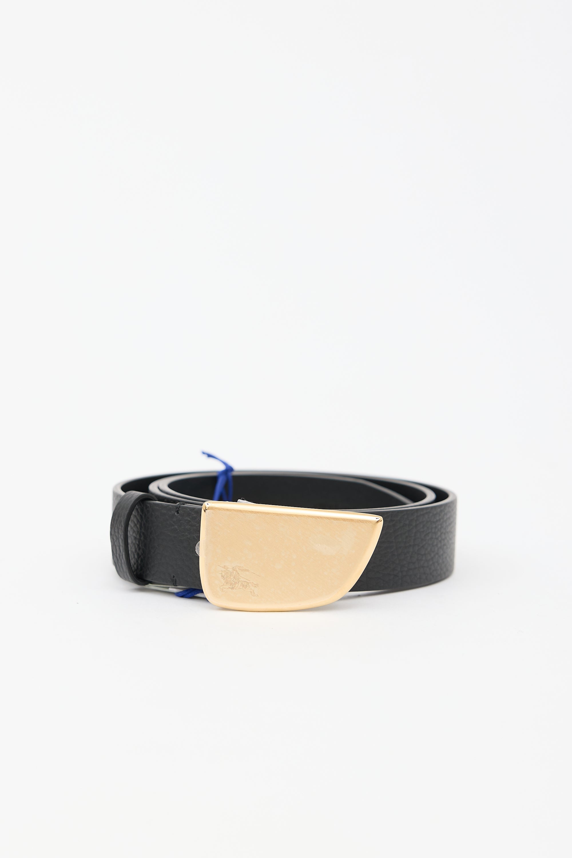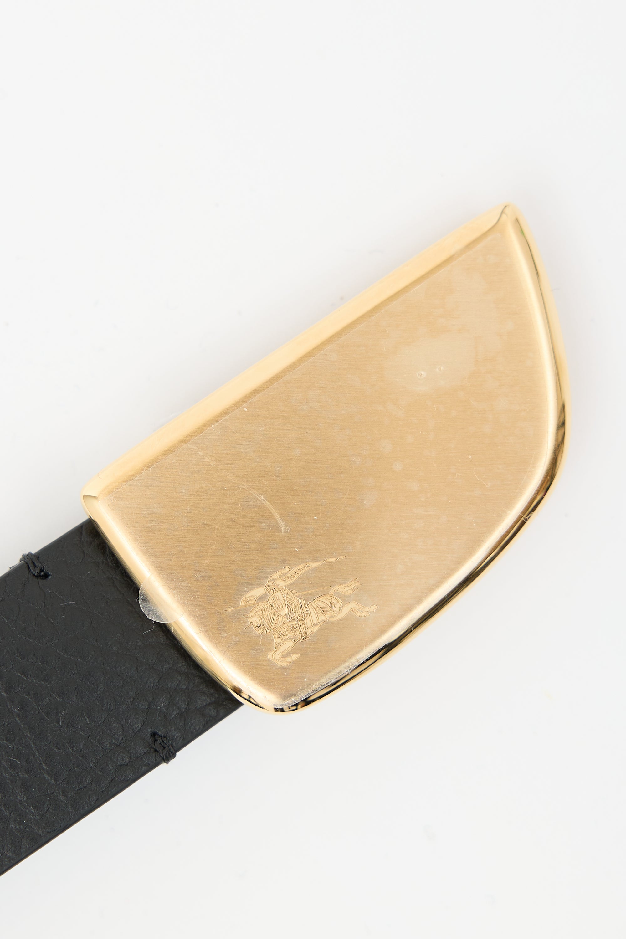 Burberry black leather belt featuring gold tone buckle with etched EKD logo. Includes original dust bag.