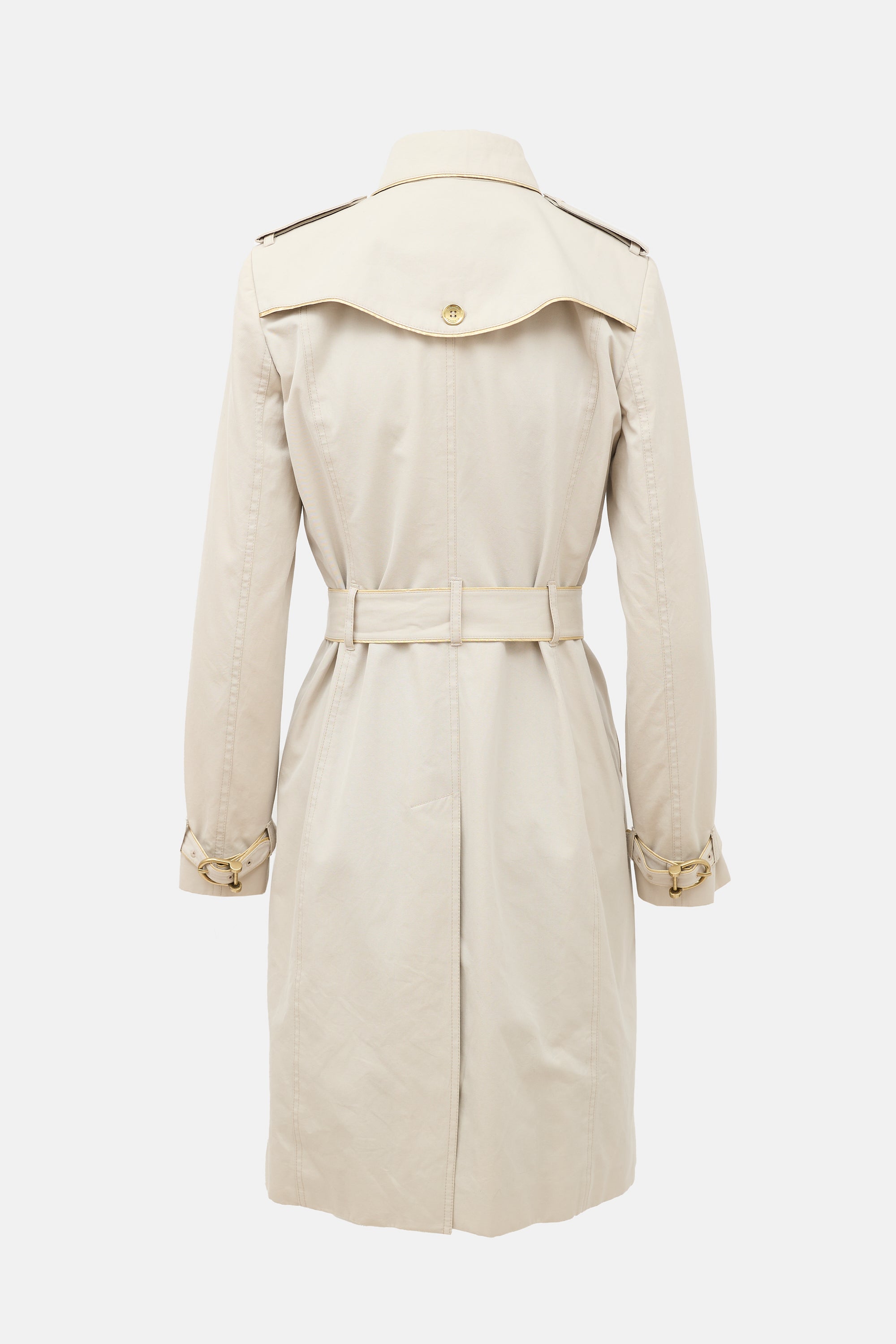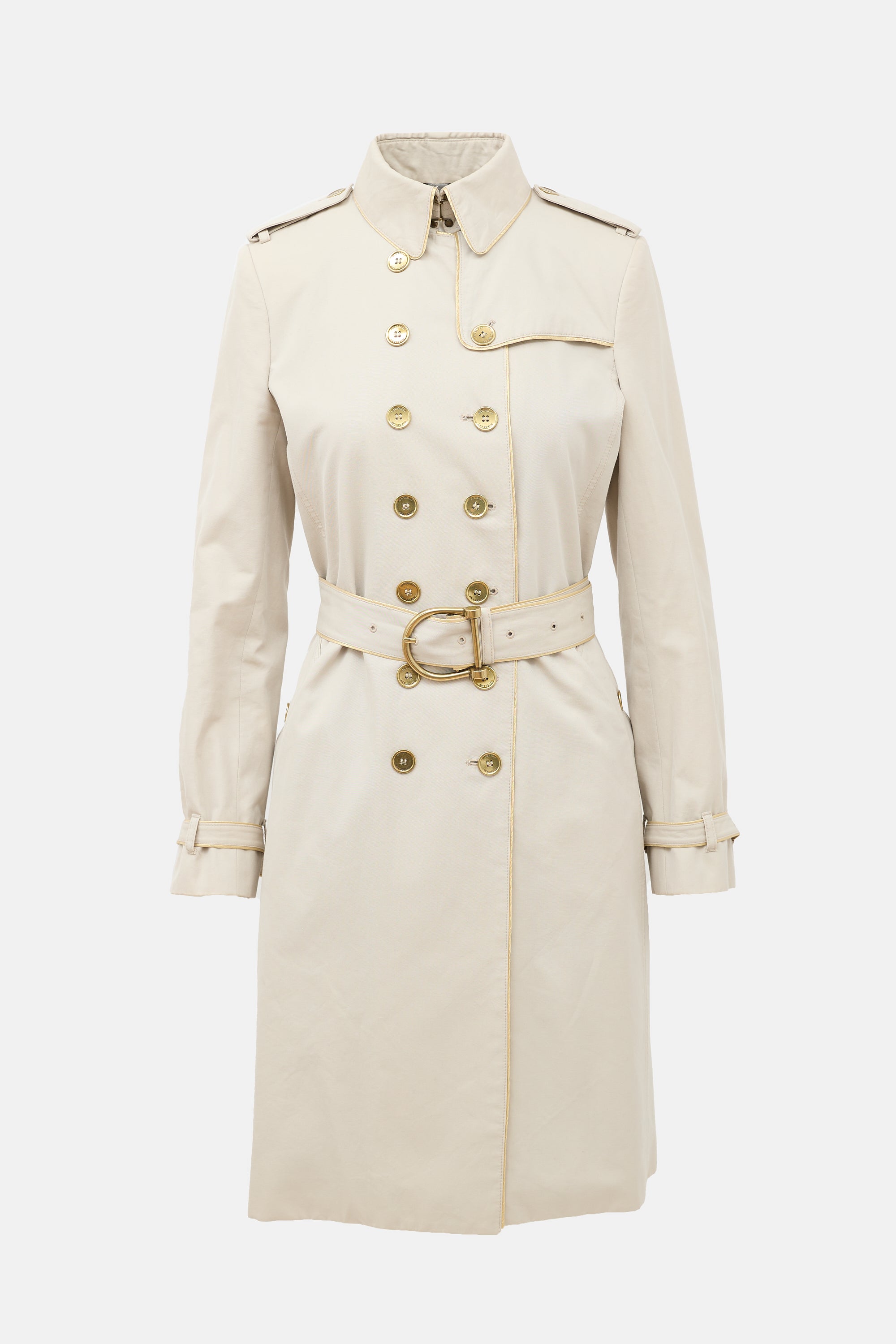 Pre-owned Burberry beige trench coat featuring gold piped trim, epaulettes, storm flap and shield, button front, adjustable belt, welt pockets, back vent, and check lining.