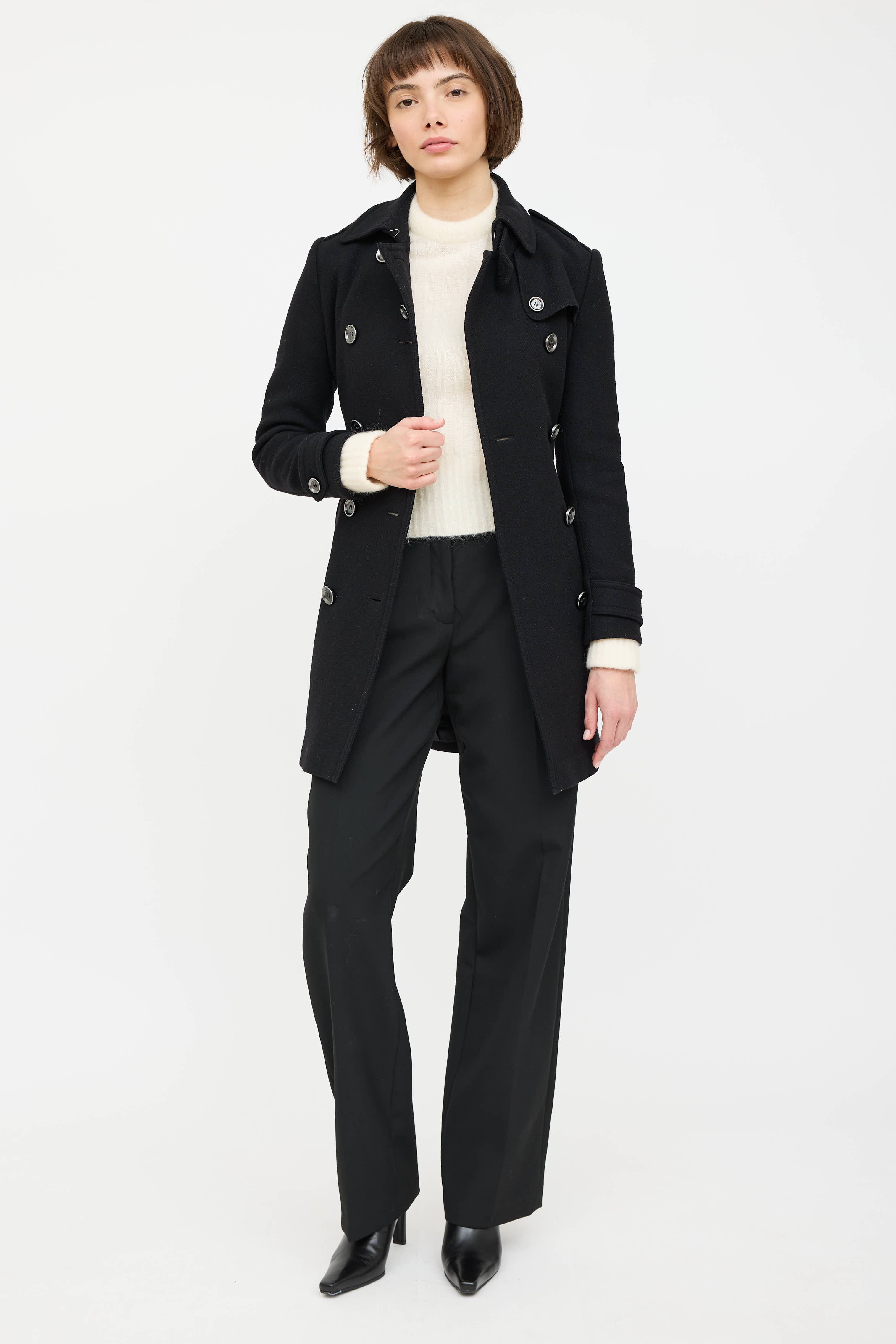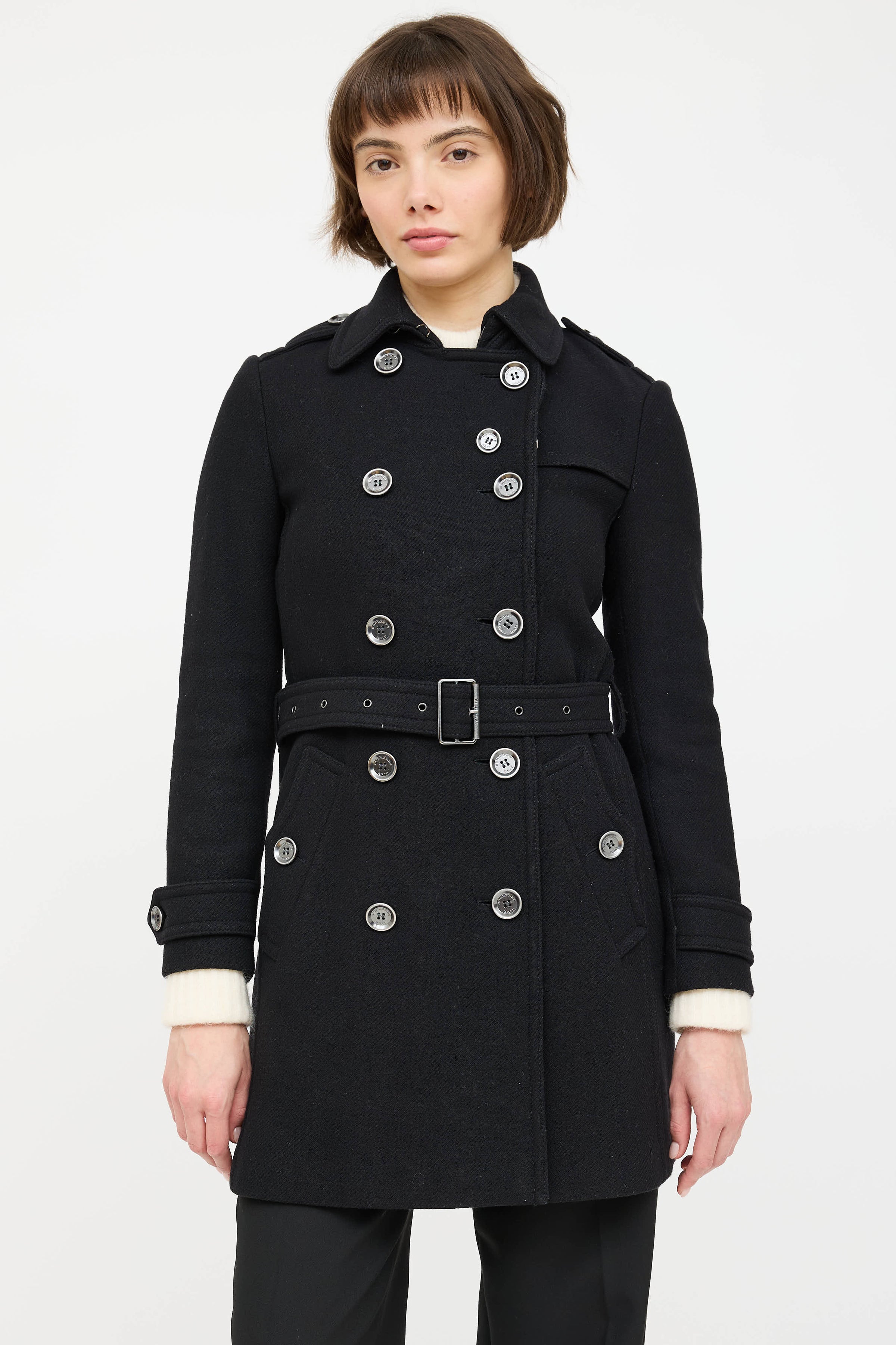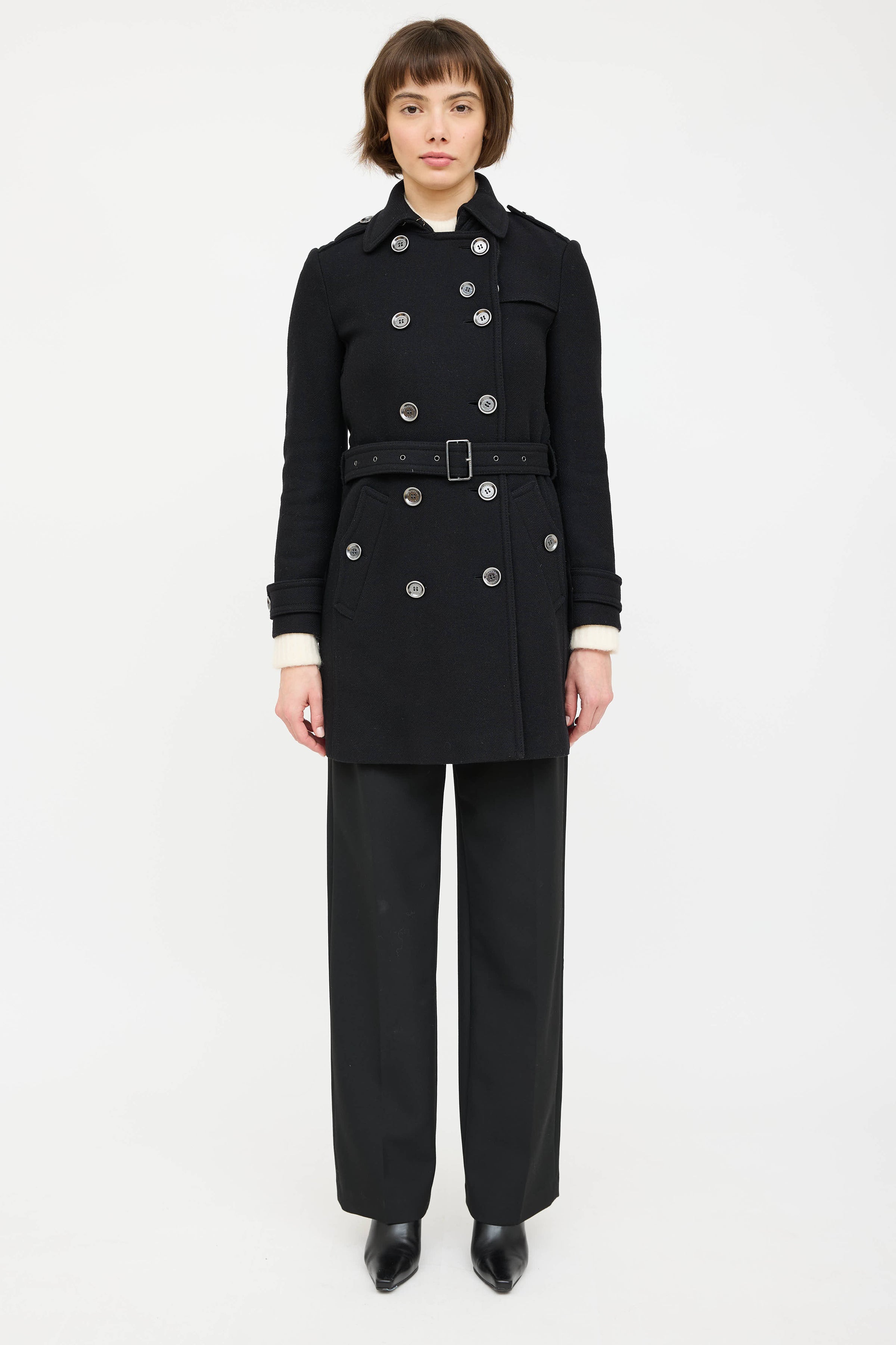 Pre-owned Burberry black wool trench coat featuring a pointed collar, shoulder epaulets, long sleeves with buttoned cuffs, two slip pockets at hip, adjustable belt at waist, and double breasted button closure. Lined.