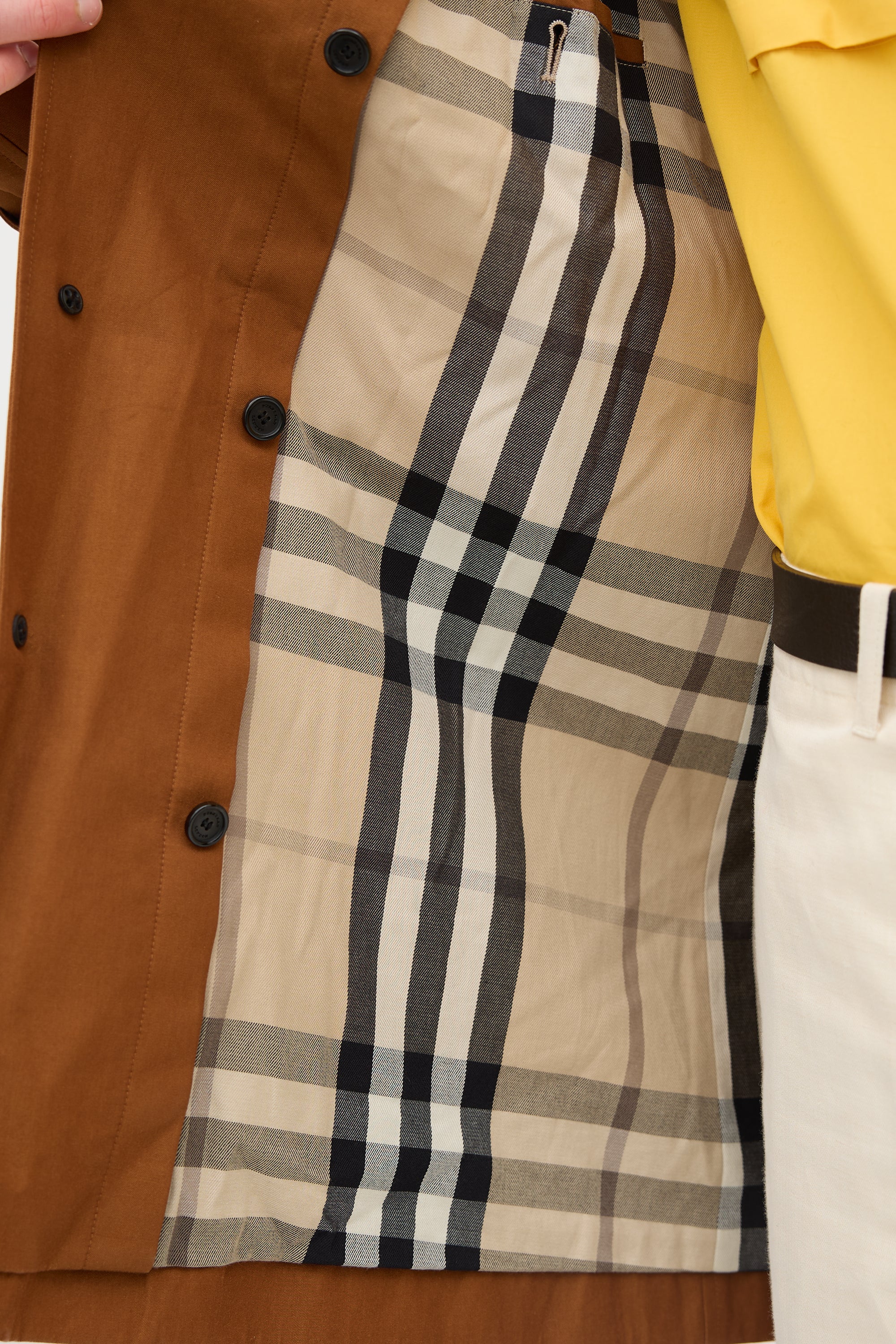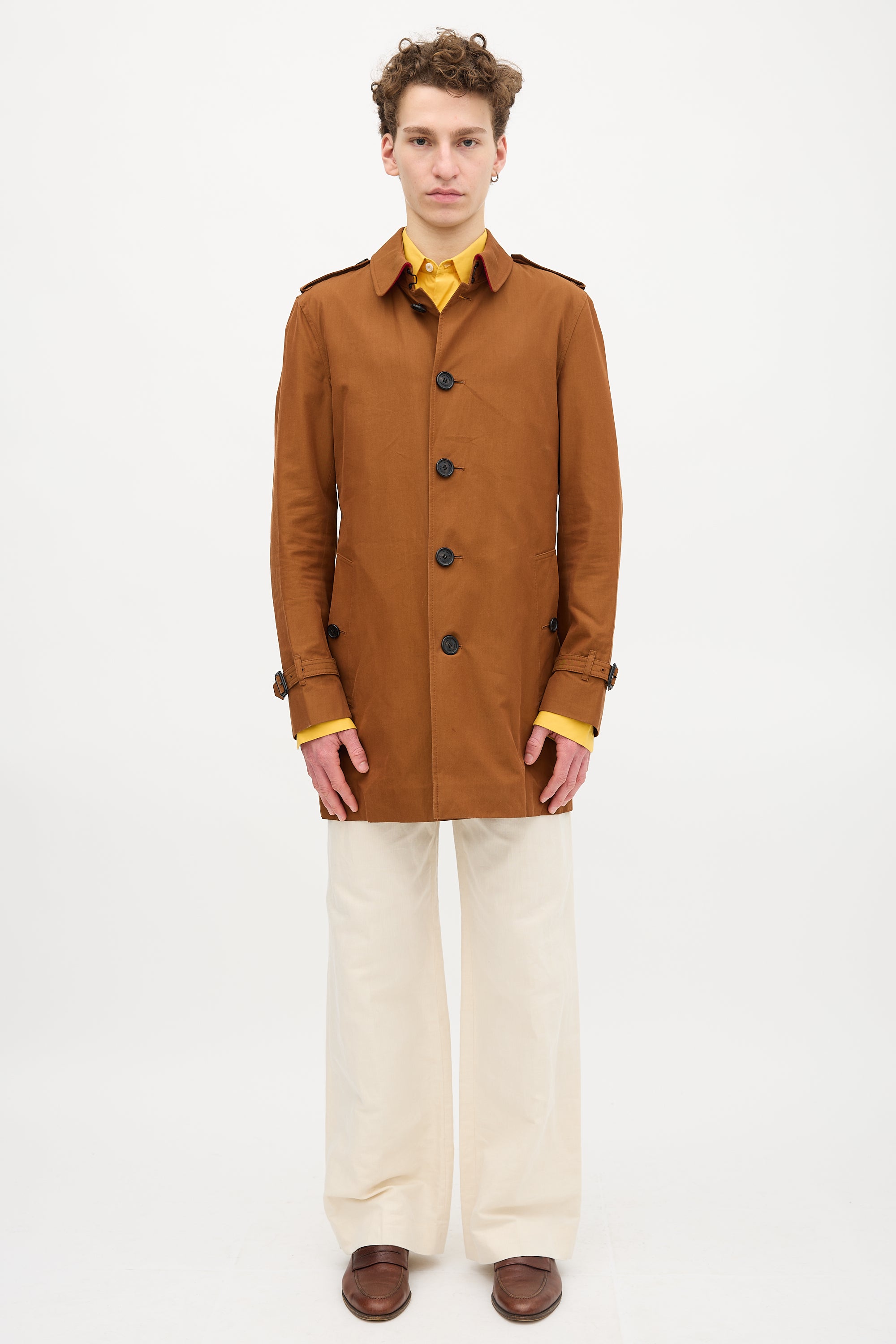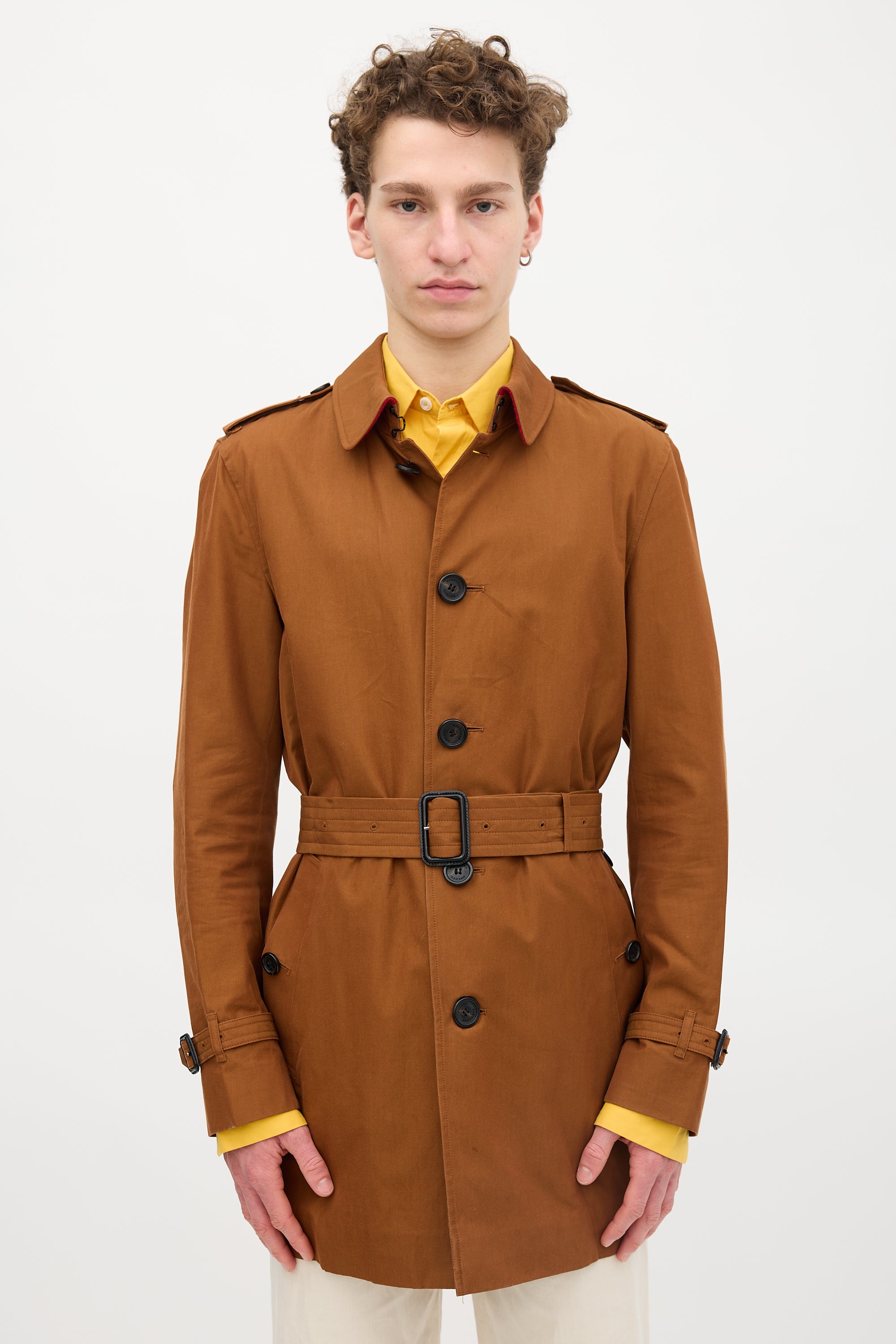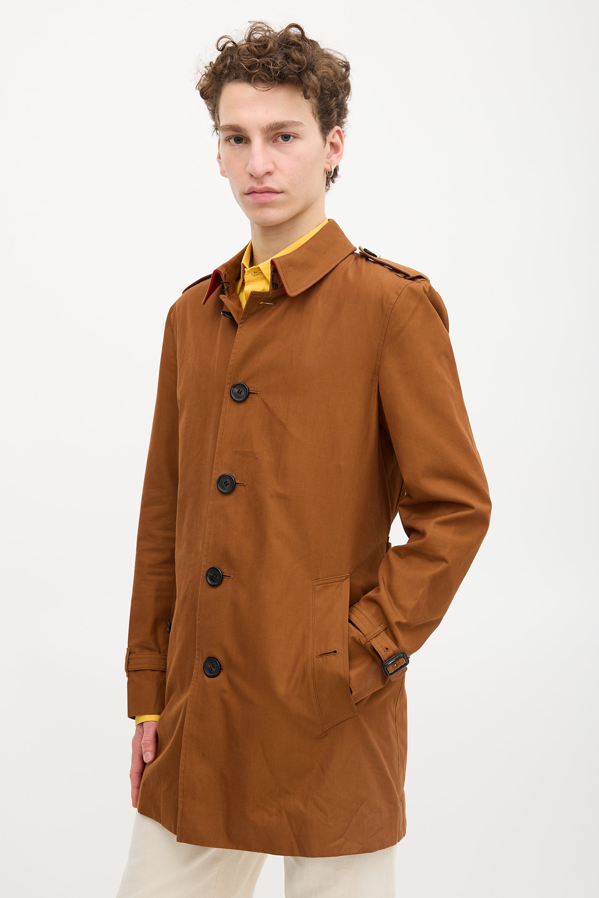 Pre-owned Burberry brown trench coat featuring a point collar, epaulettes, button front, two buttoned welt pockets at hip, storm guard, pin buckle belt at waist, kick pleat at back hem, belted cuffs, and removable felted wool vest liner.