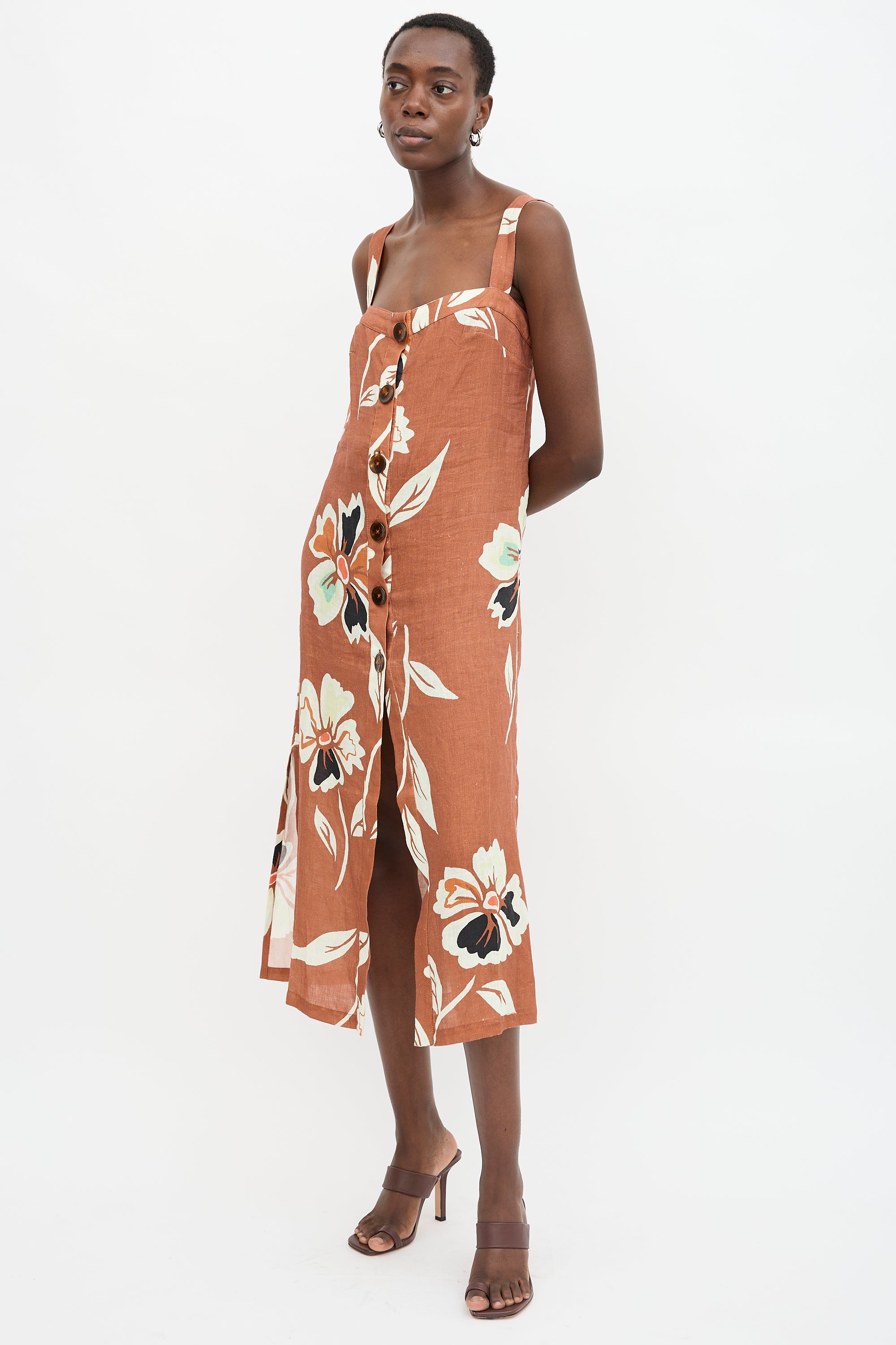 Pre-owned Cala de la Cruz brown linen Tamara dress featuring multicolour floral print, square neckline, button front, and side vents.