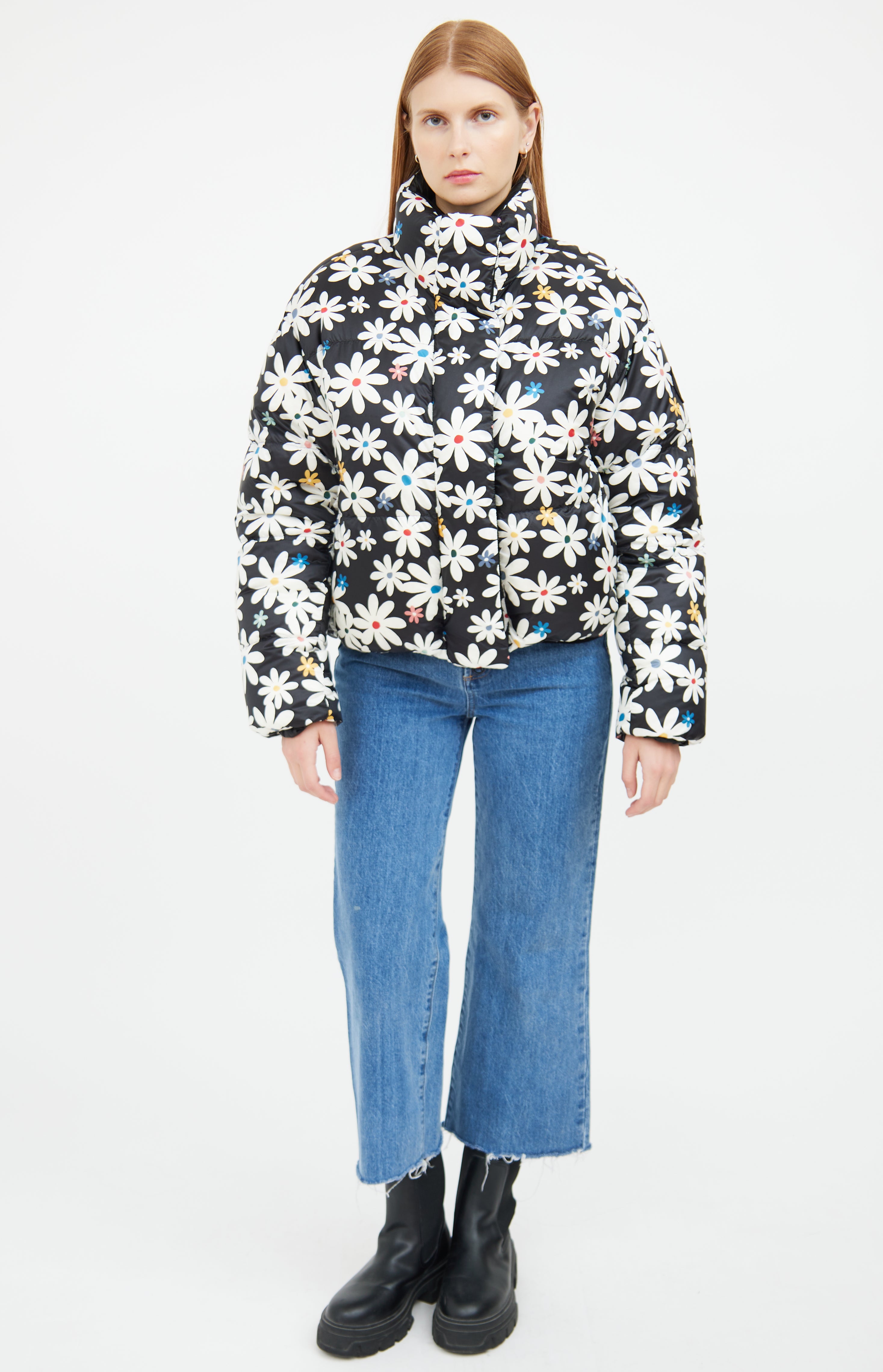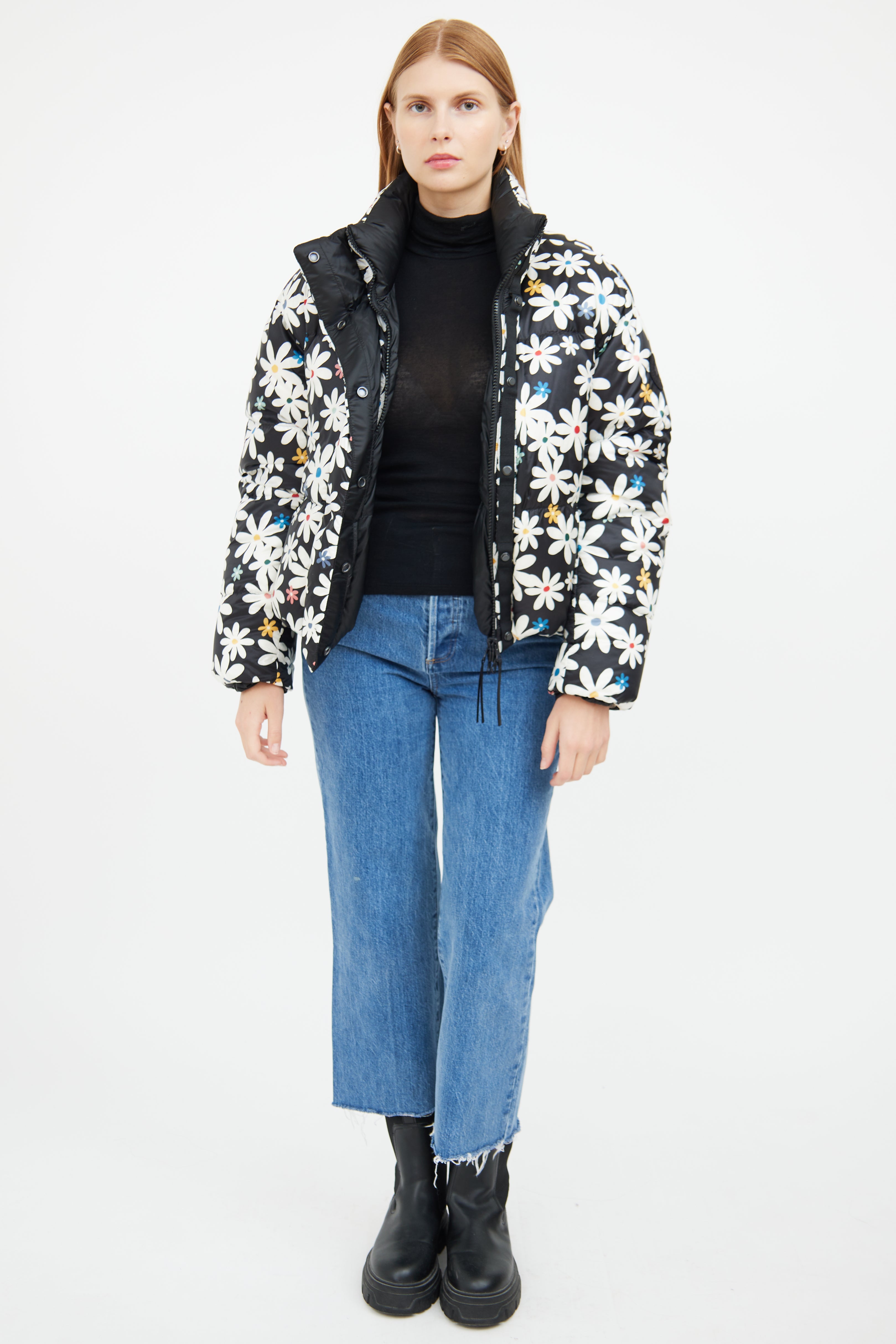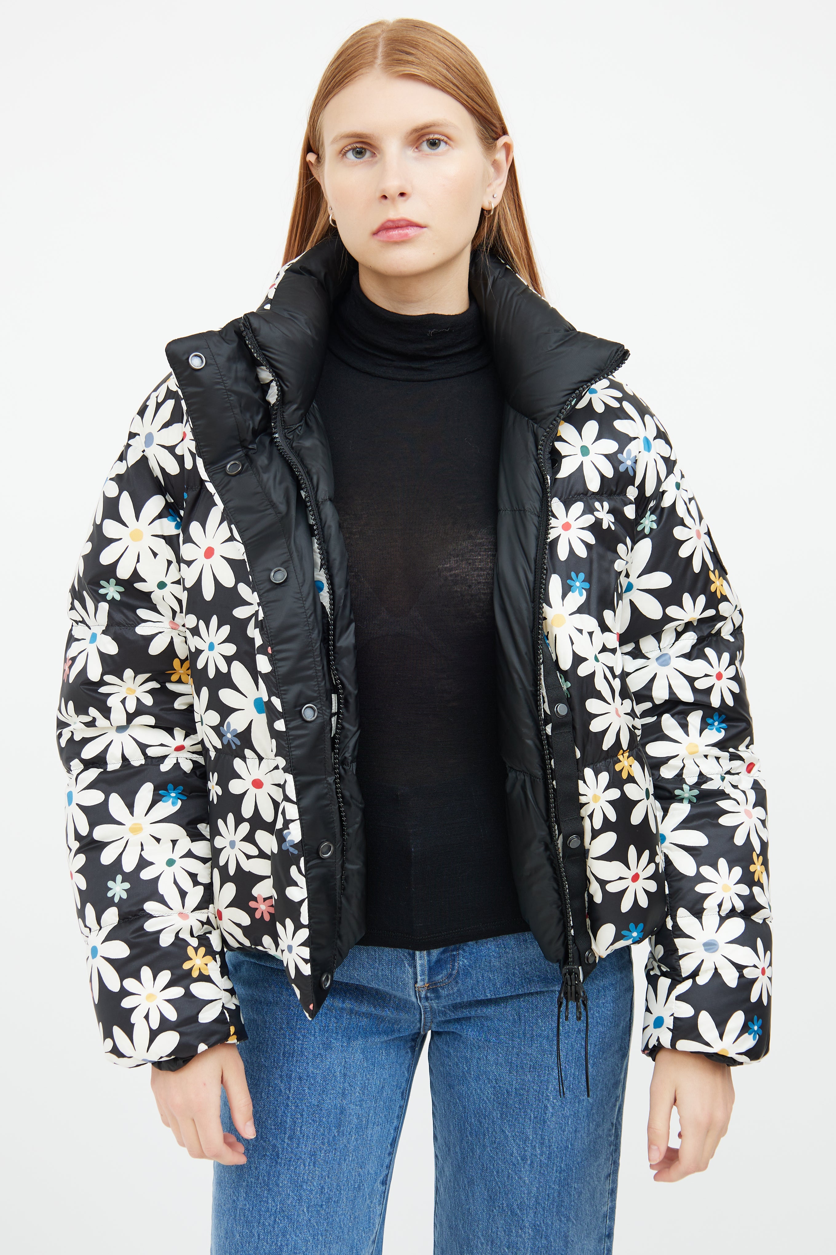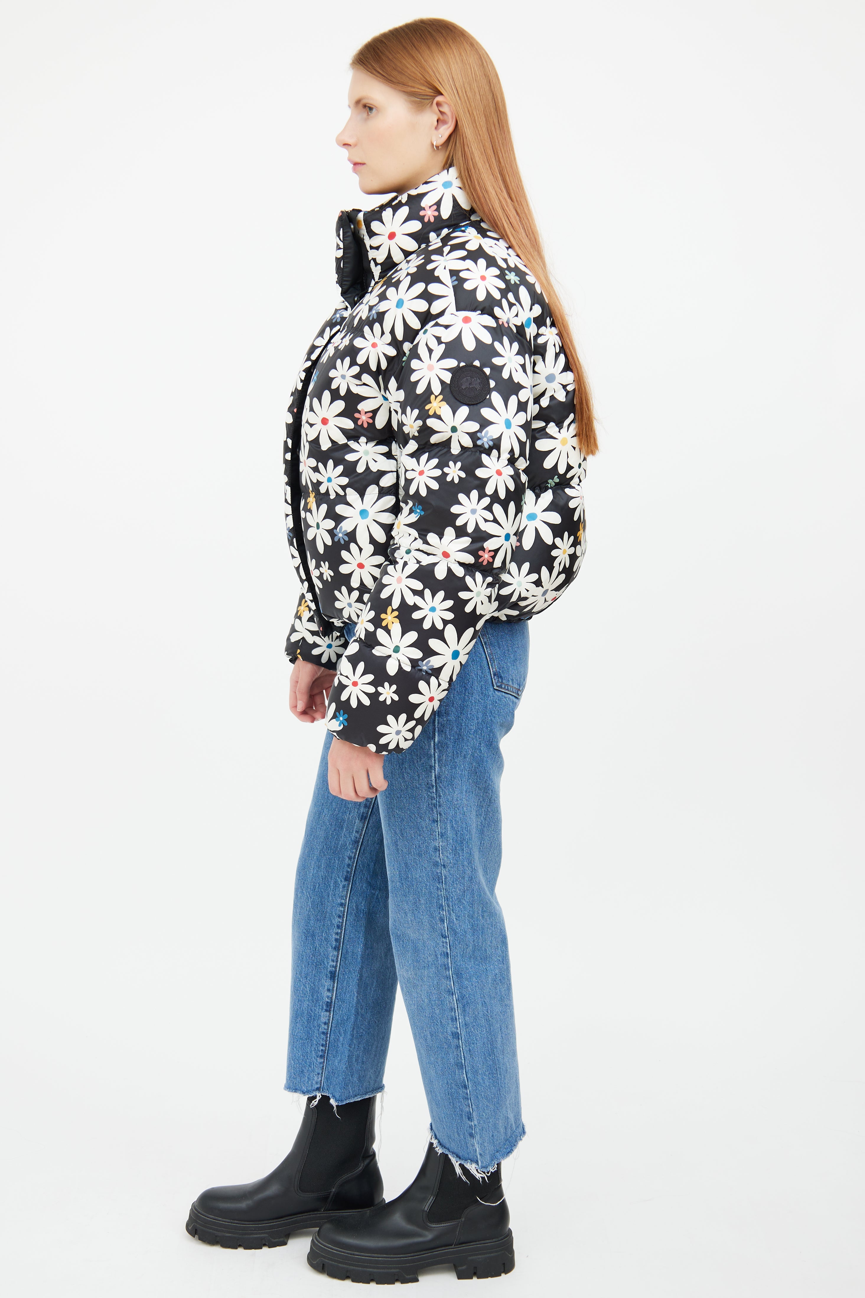 Pre-owned Canada Goose x Reformation black reversible down puffer jacket featuring white and multicolour floral pattern on one side, funnel neck collar, two zip pockets at hip, embroidered logo patch at shoulder, snap button and zip closure.