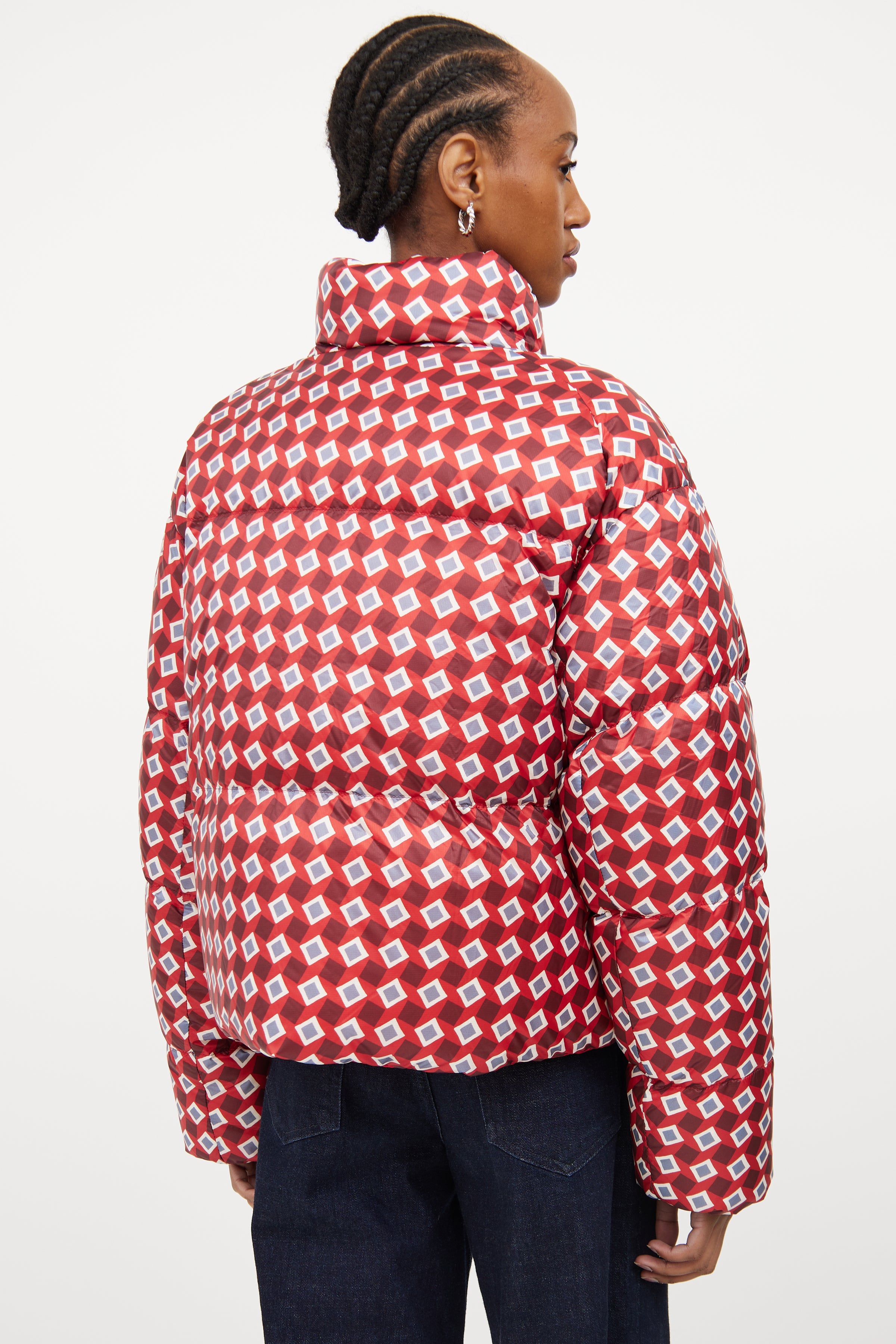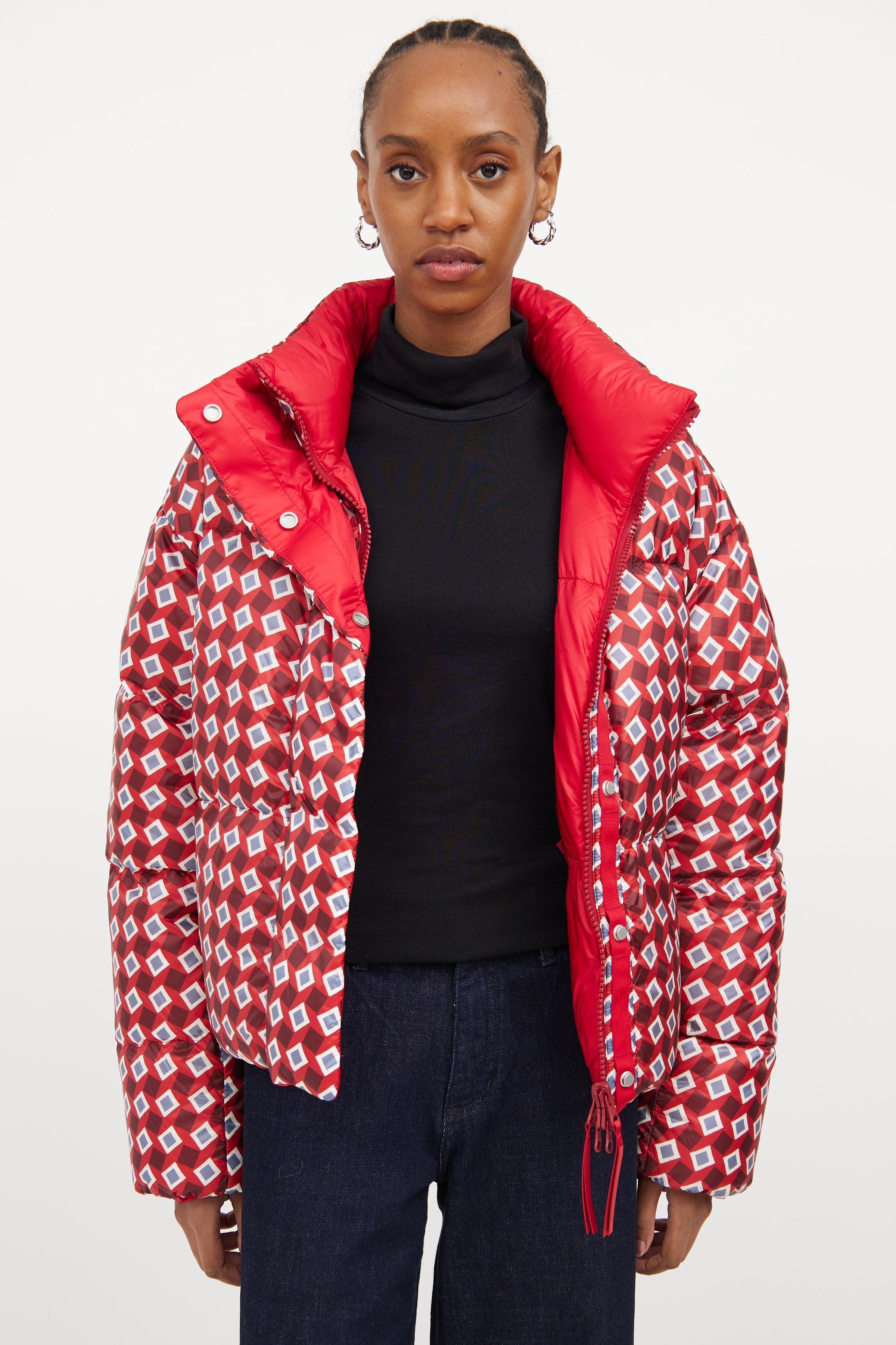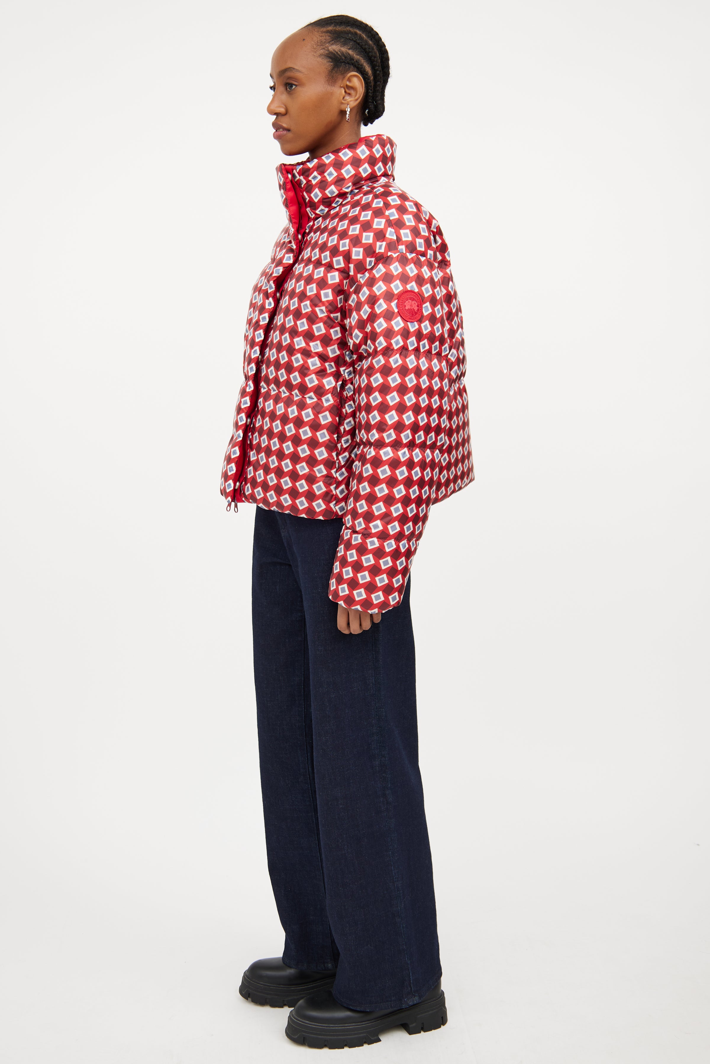 Pre-owned Canada Goose x Reformation red down jacket featuring a multicolour geometric pattern throughout, funnel neck collar, long sleeves, two zip pockets at hip, embroidered logo patch at shoulder, cropped fit, and zip closure. Lined.