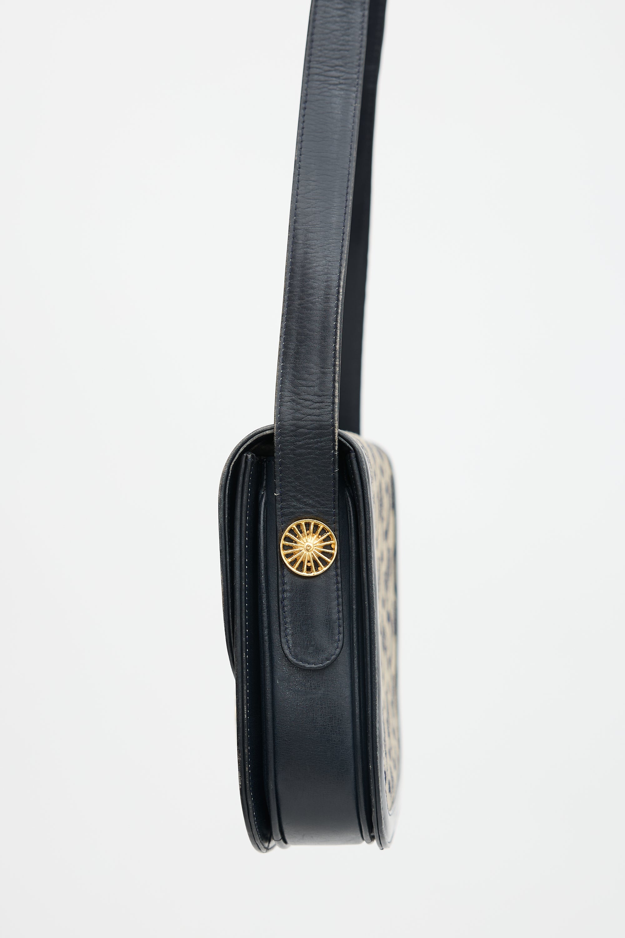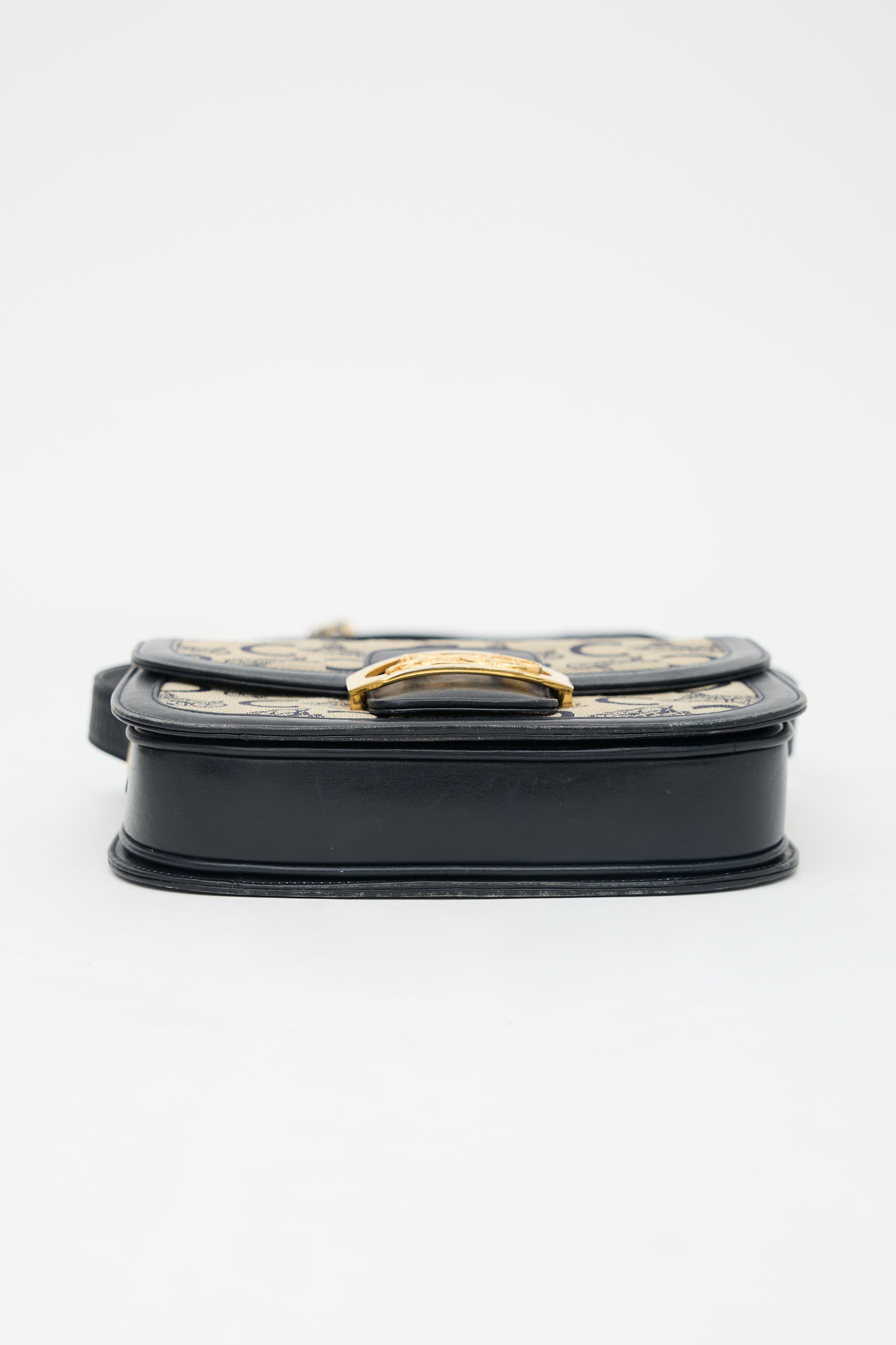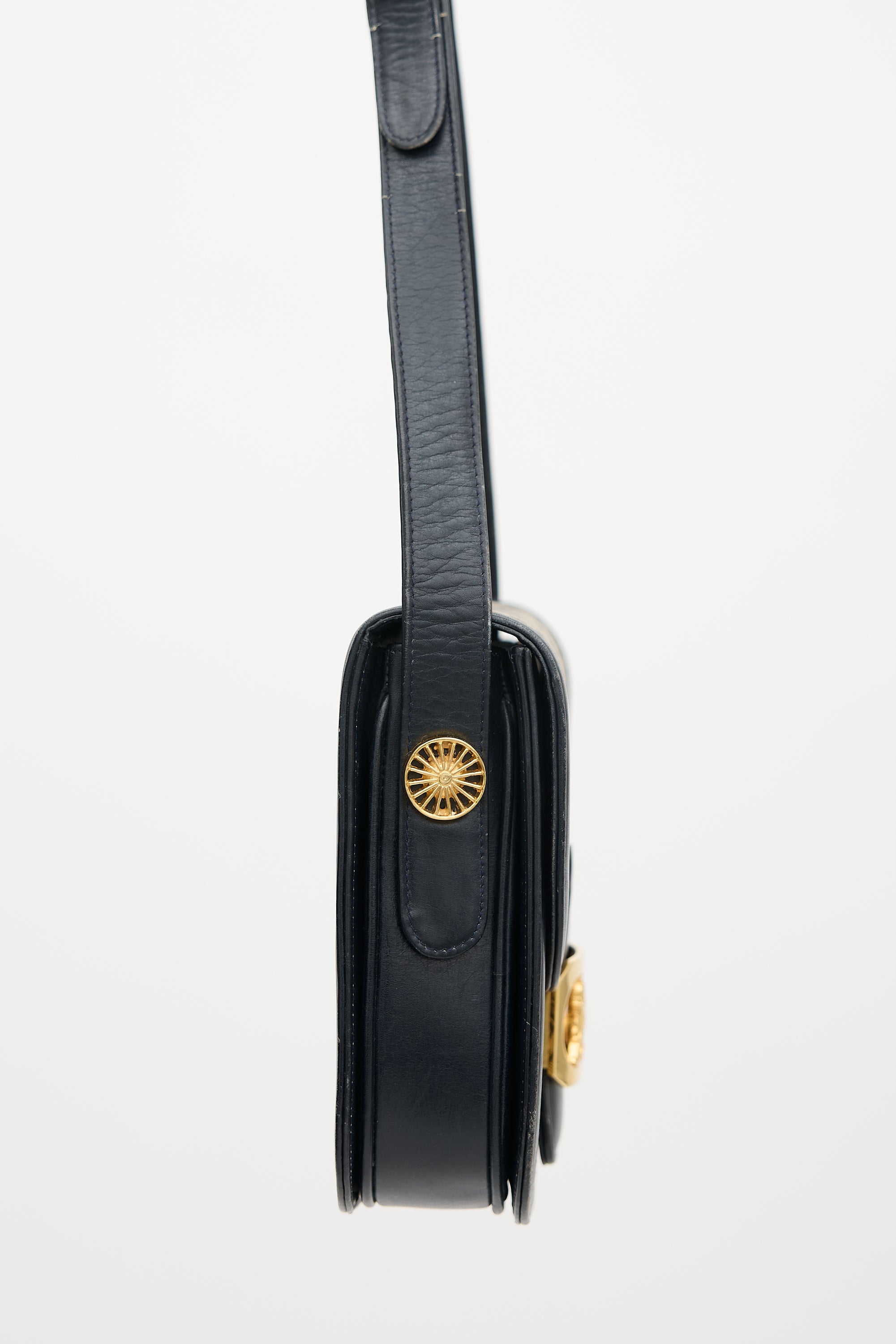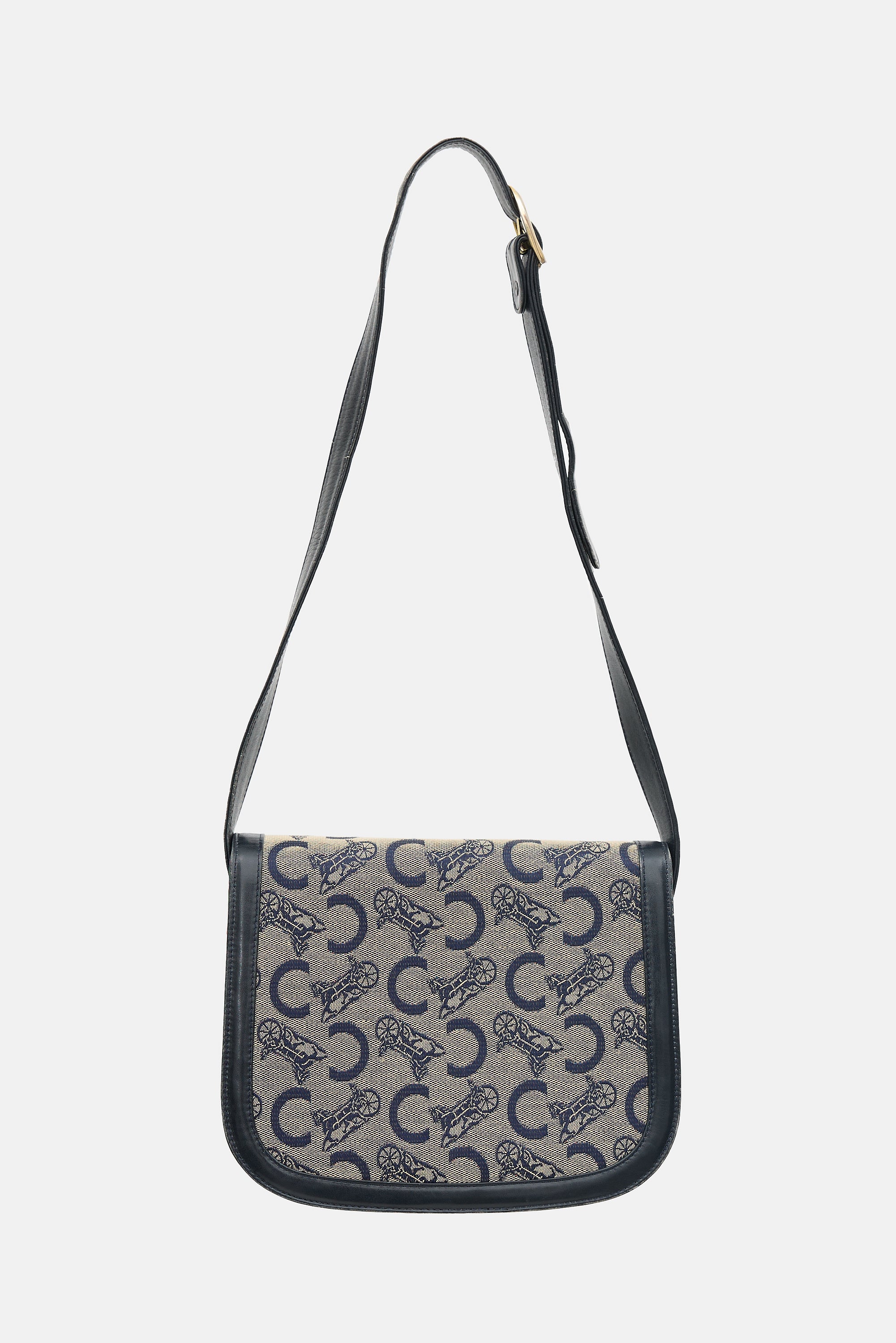 Pre-owned Celine 1970s navy leather and canvas C Sulky bag featuring C and horse carriage monogram, gold tone hardware, horse carriage buckle at front, adjustable shoulder strap, top flap closure, and interior compartment includes three main compartments, two slip pockets and one zip pocket. Includes original dust bag. Céline Vipiana era design.