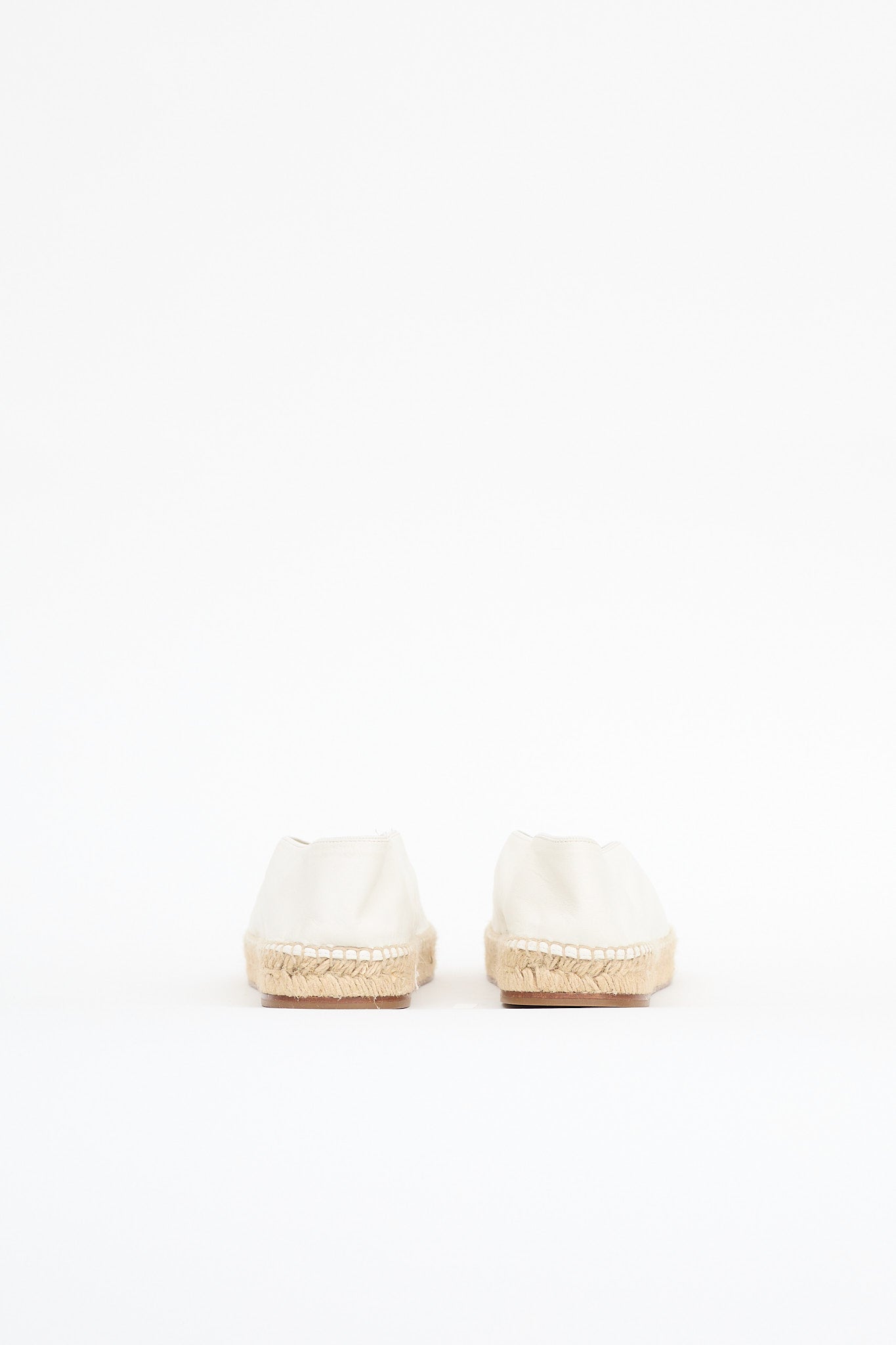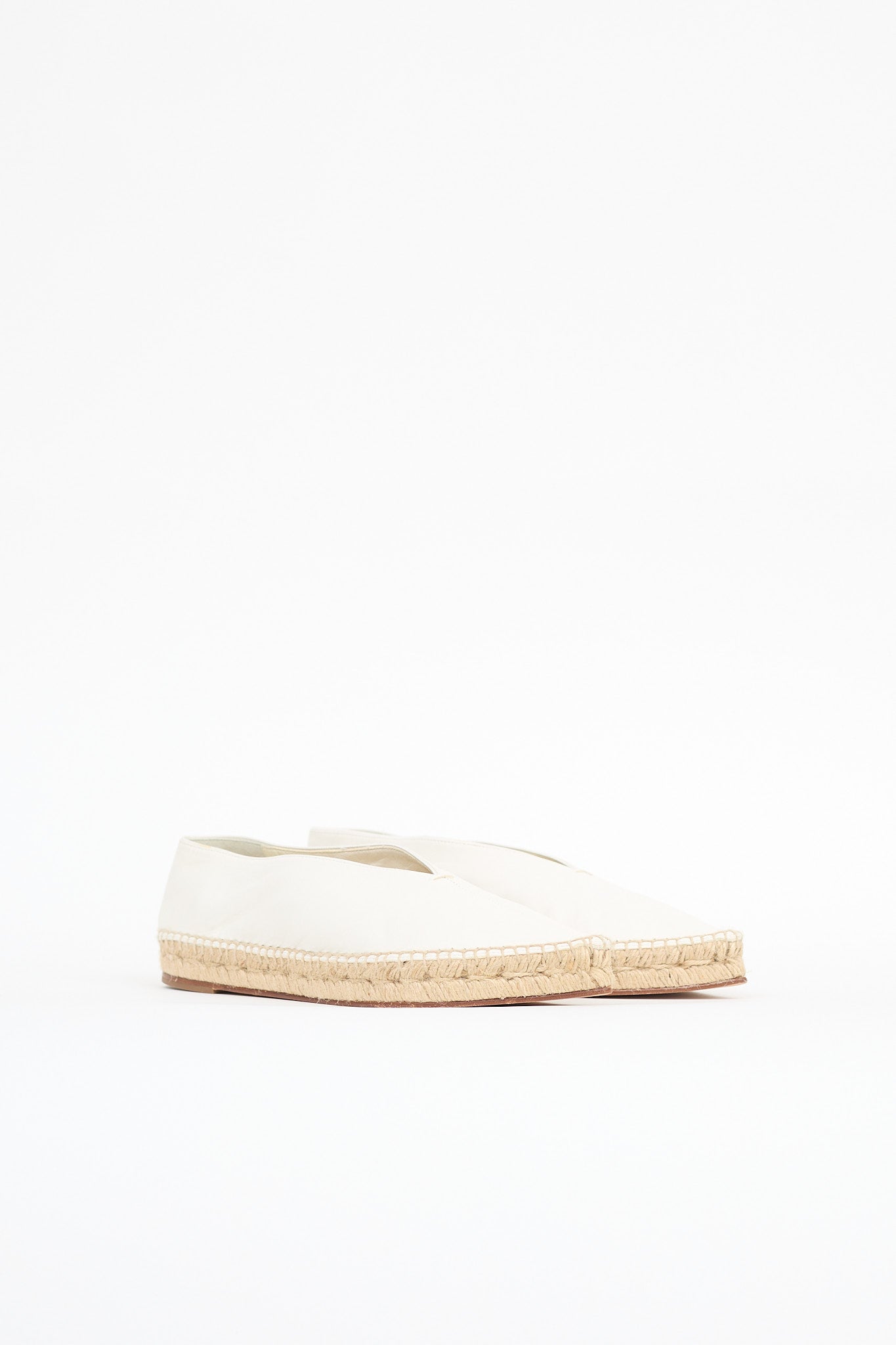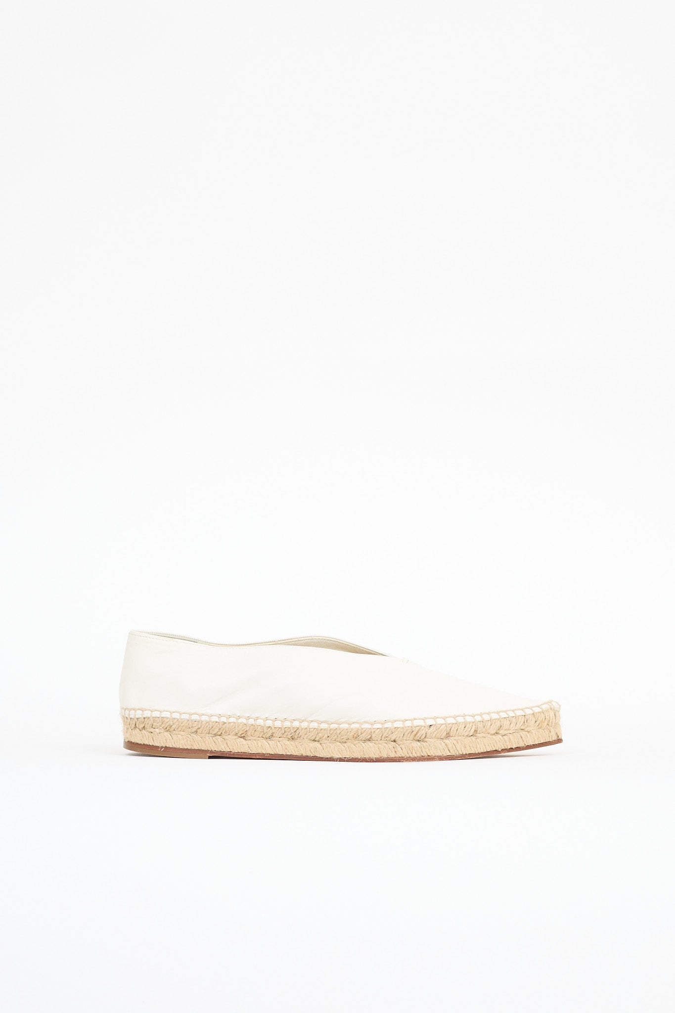 Pre-owned Celine white leather Babouche espadrilles featuring pointed toe, jute midsole, and V topline.