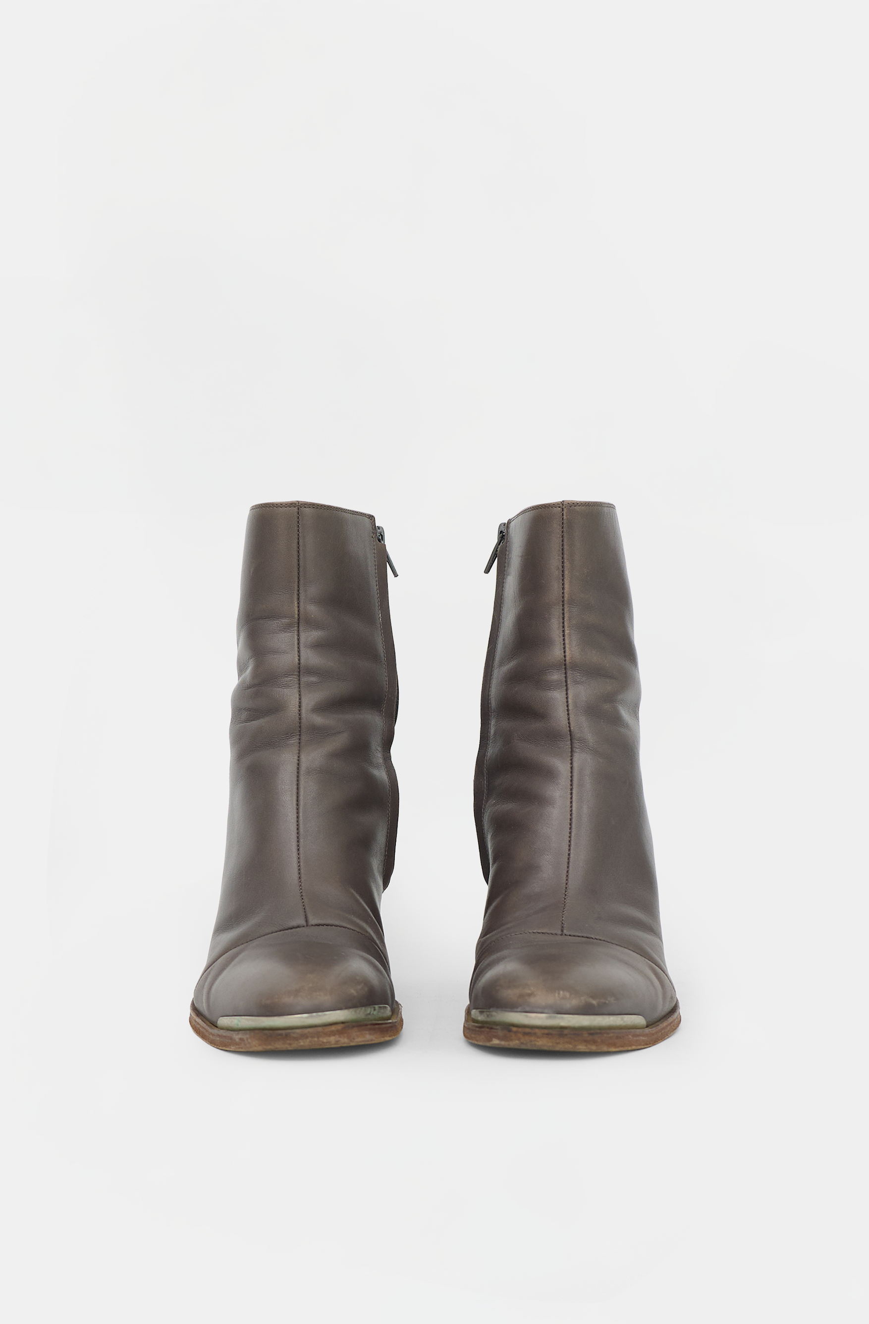 Pre-owned Celine brown leather ankle boots featuring rounded toe with silver tone metal accent, inner side zip closure, and brown block heel.
