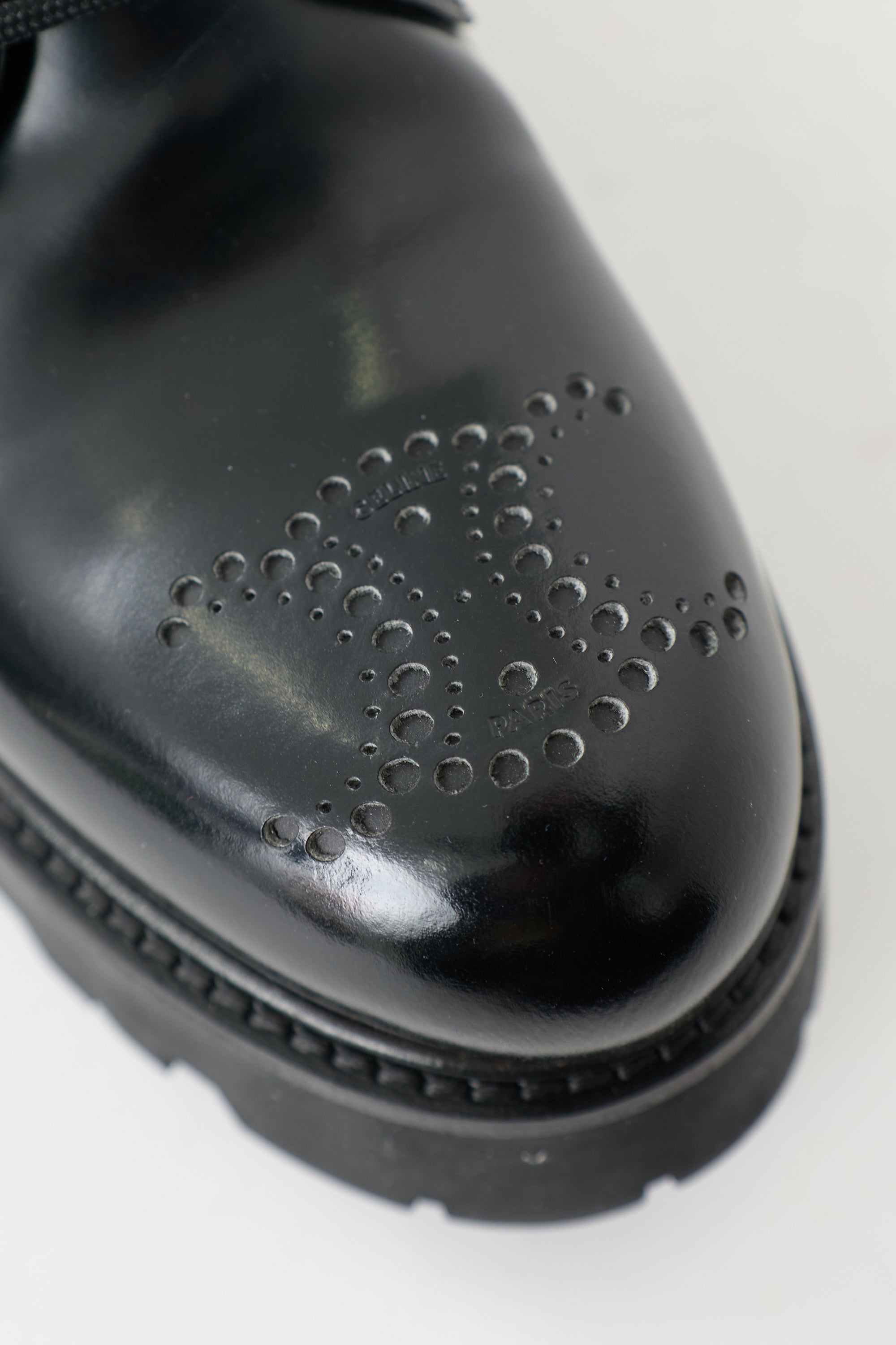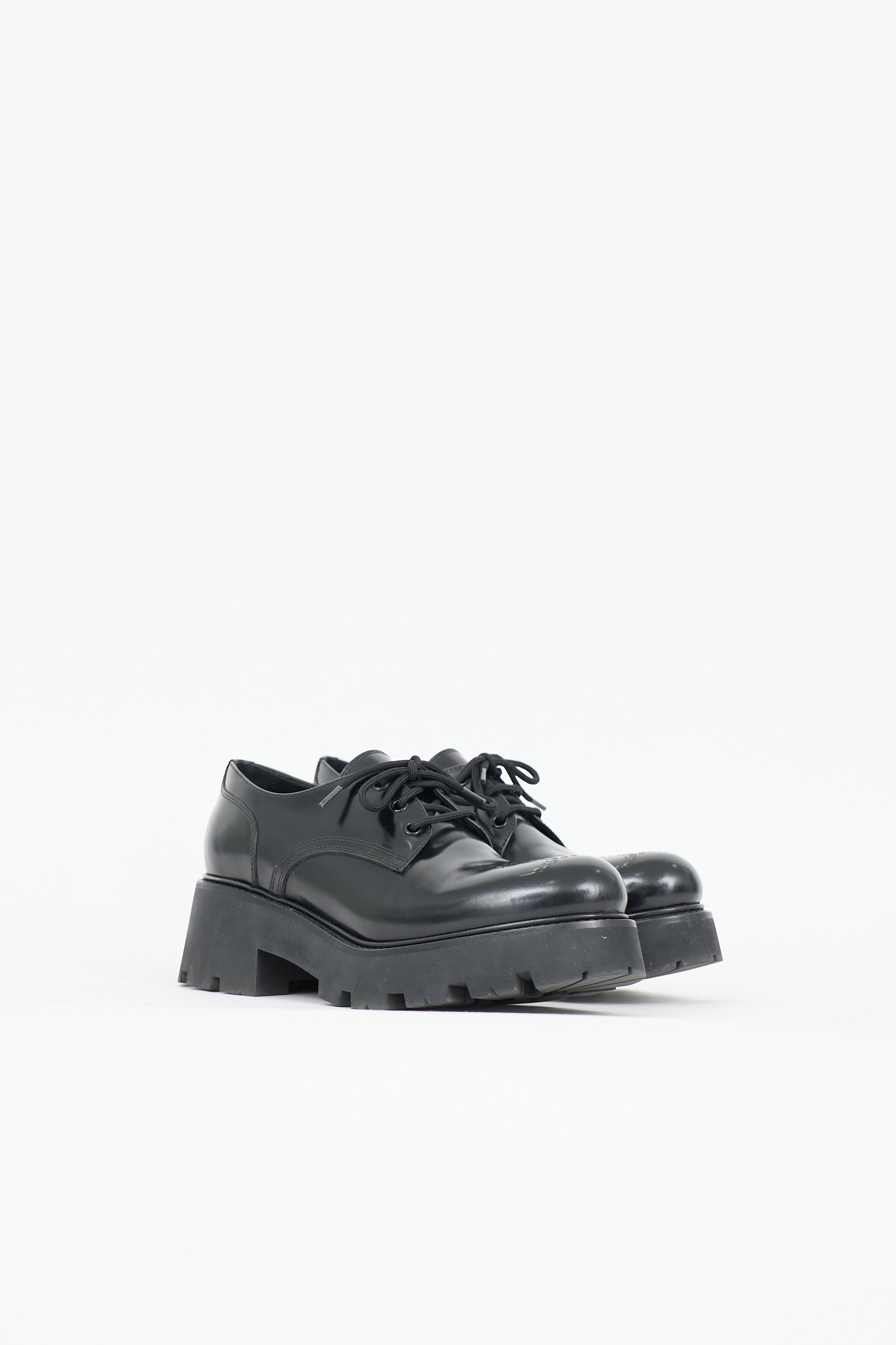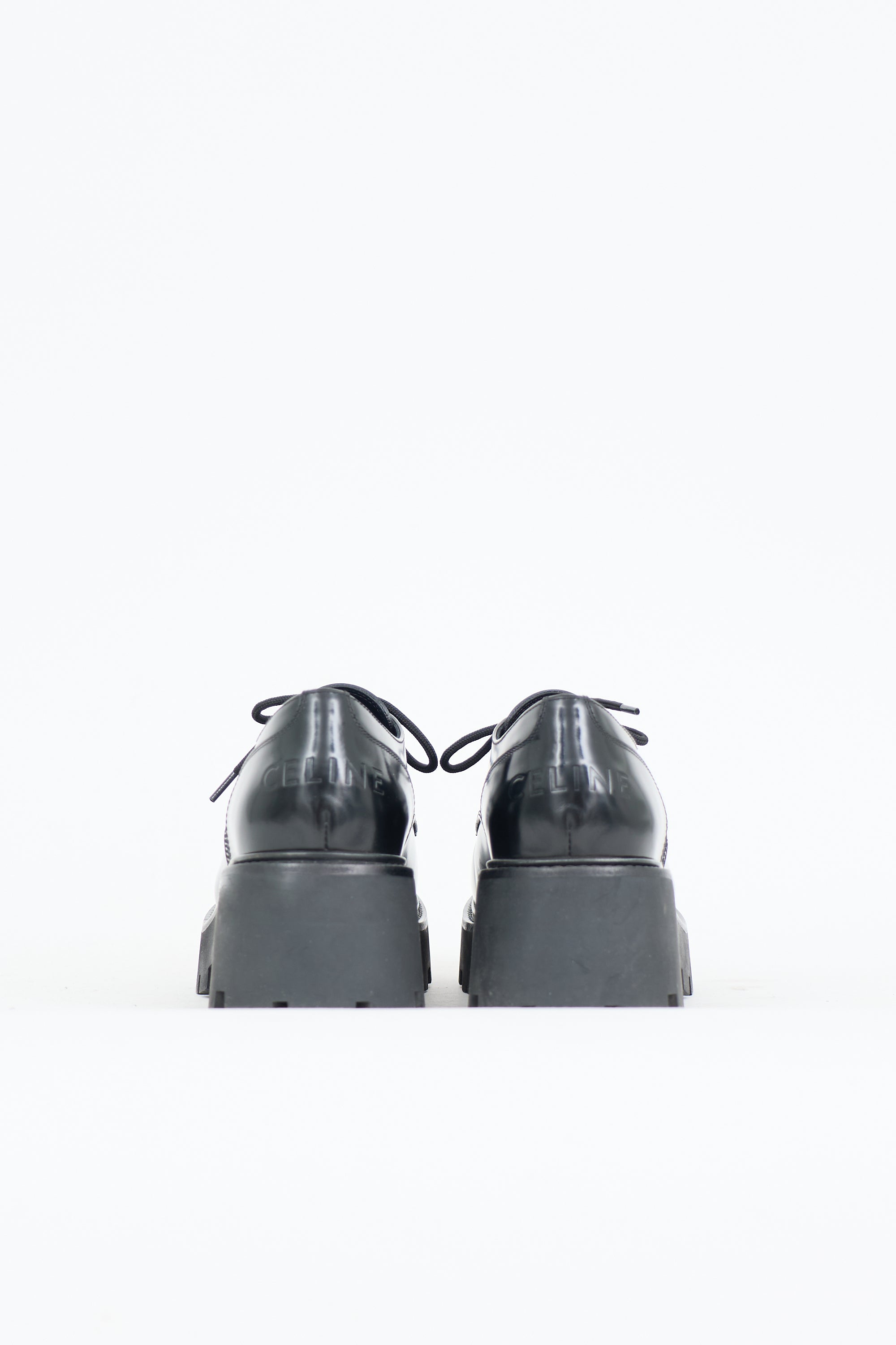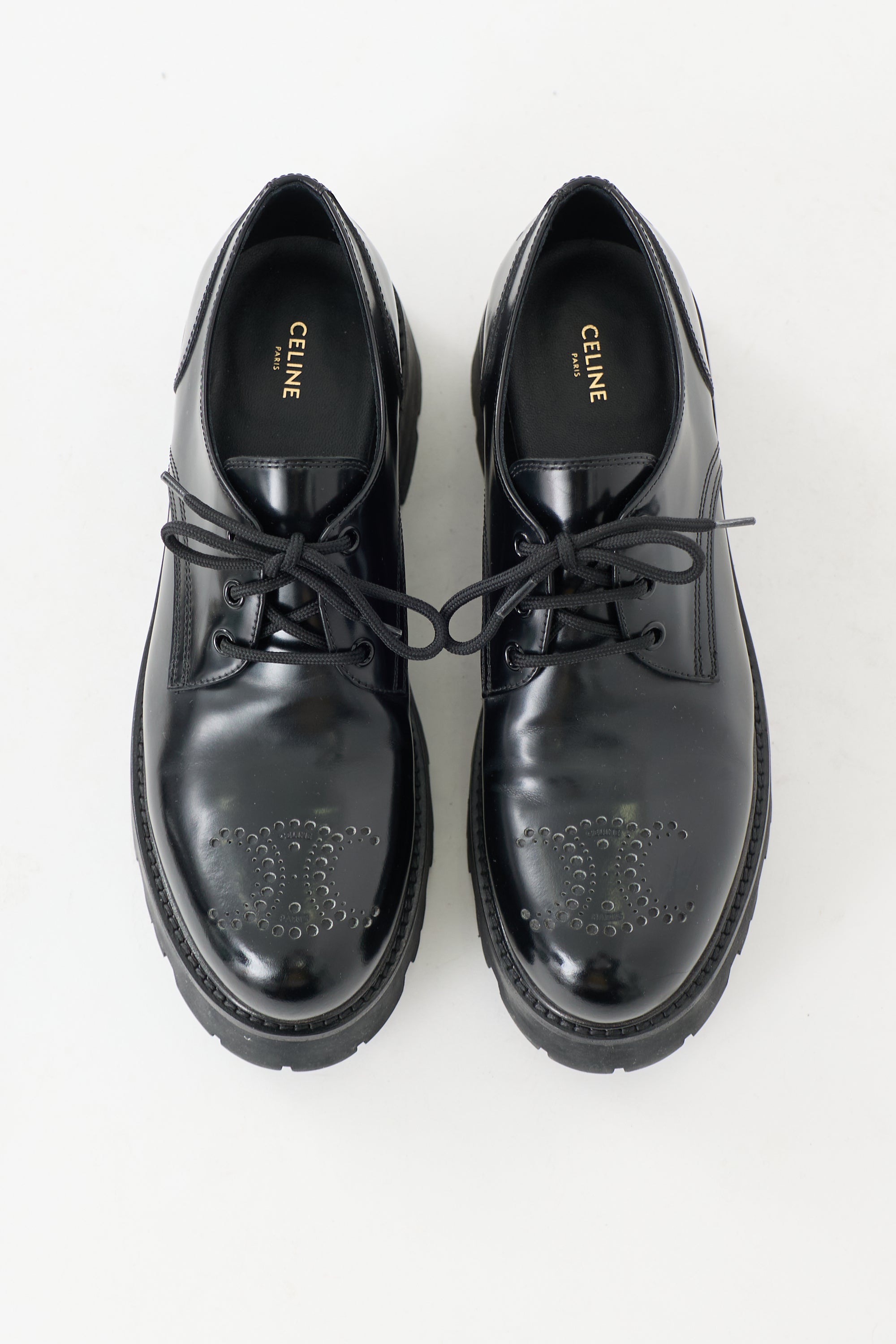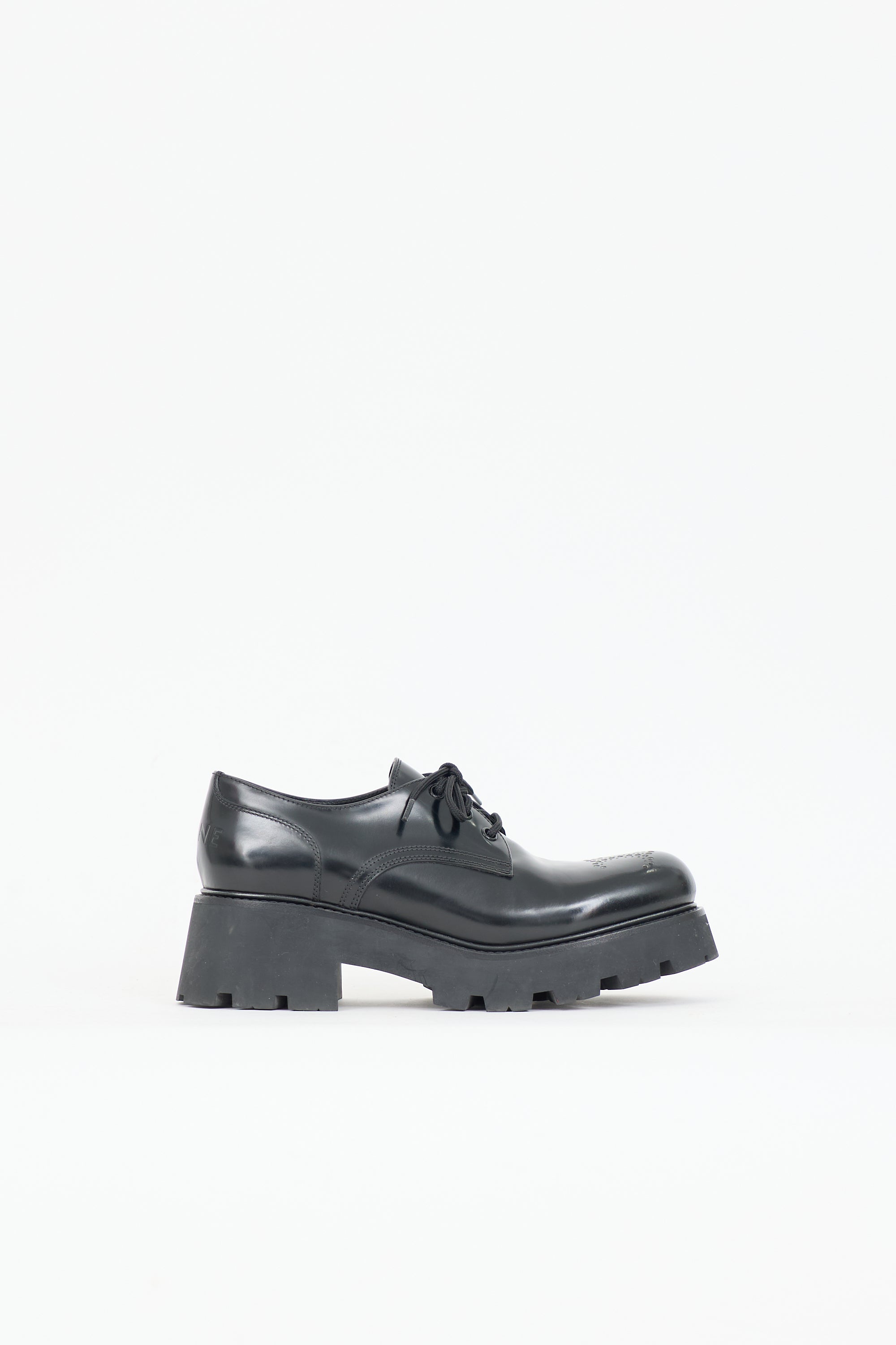 Pre-owned Celine black leather Ranger derbys featuring a rounded toe with perforated Triomphe logo, lace up front, debossed logo at counter, platform midsole, block heel, and rubber lug sole. Comes with original dust bags.