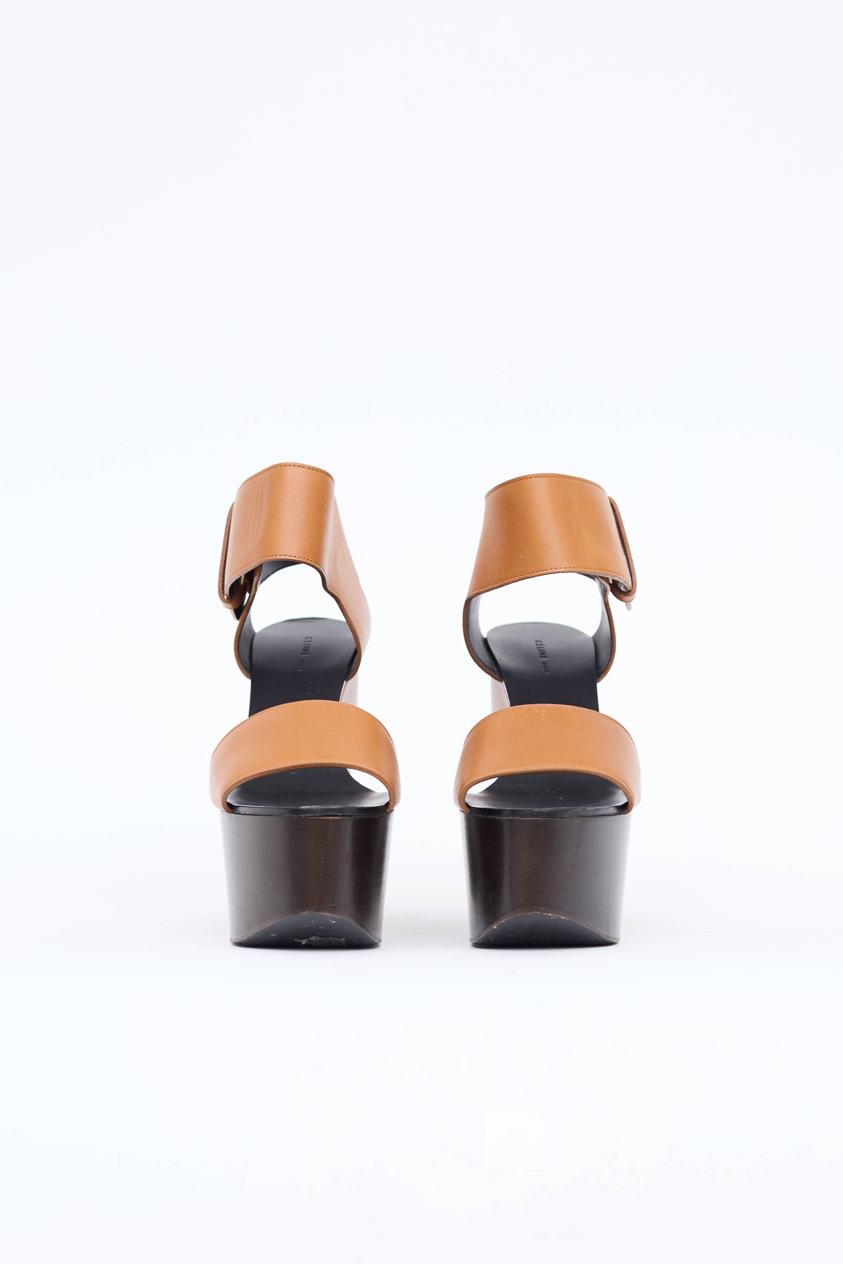 Pre-owned Celine brown sandals featuring an almond open toe, leather uppers, adjustable ankle strap with gold toned buckle, and a leather and wood paneled platform midsole with a block heel.