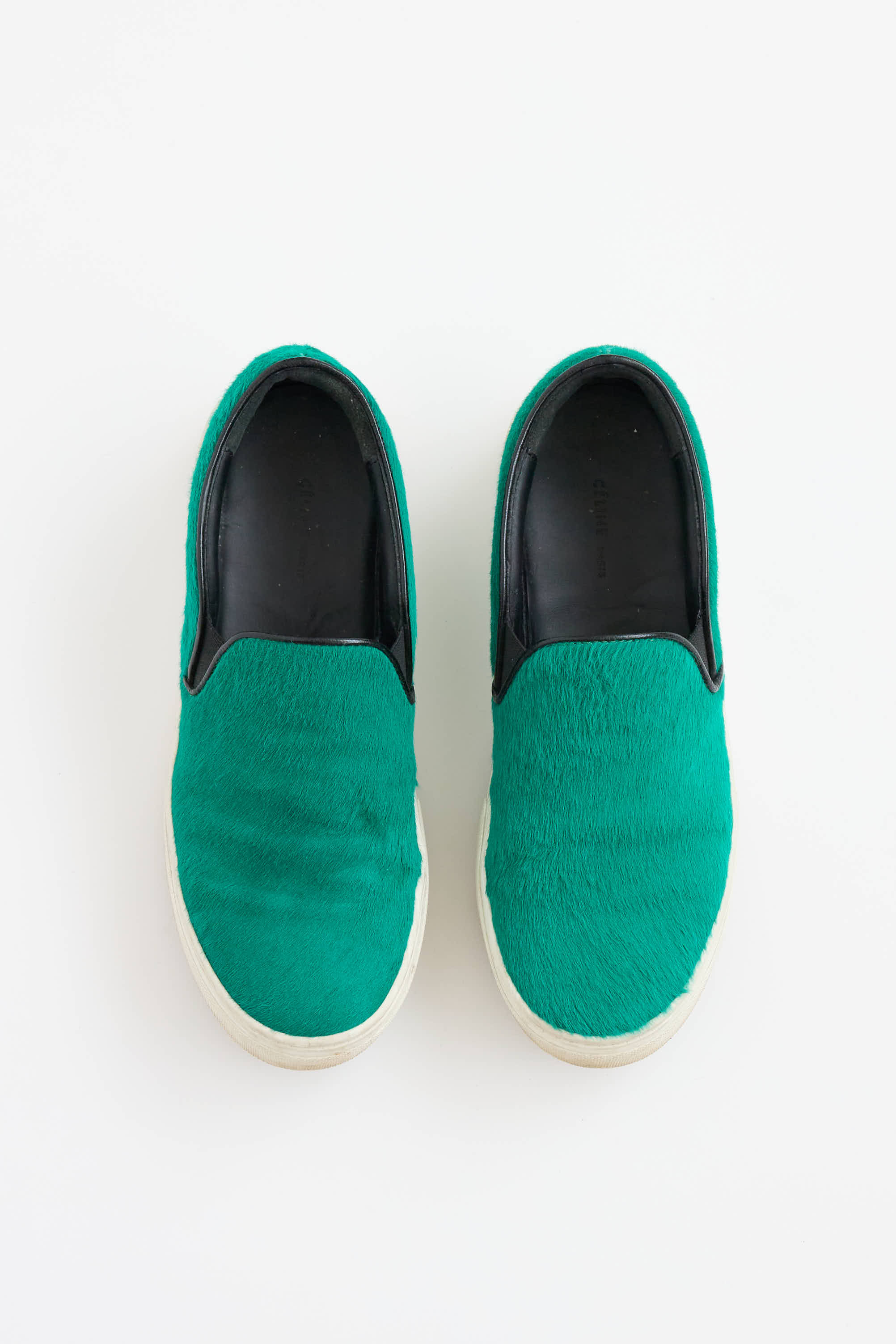 Pre-owned Celine emerald slip on sneaker featuring rounded toe, pony hair upper, and rubber outsole with debossed logo at heel.