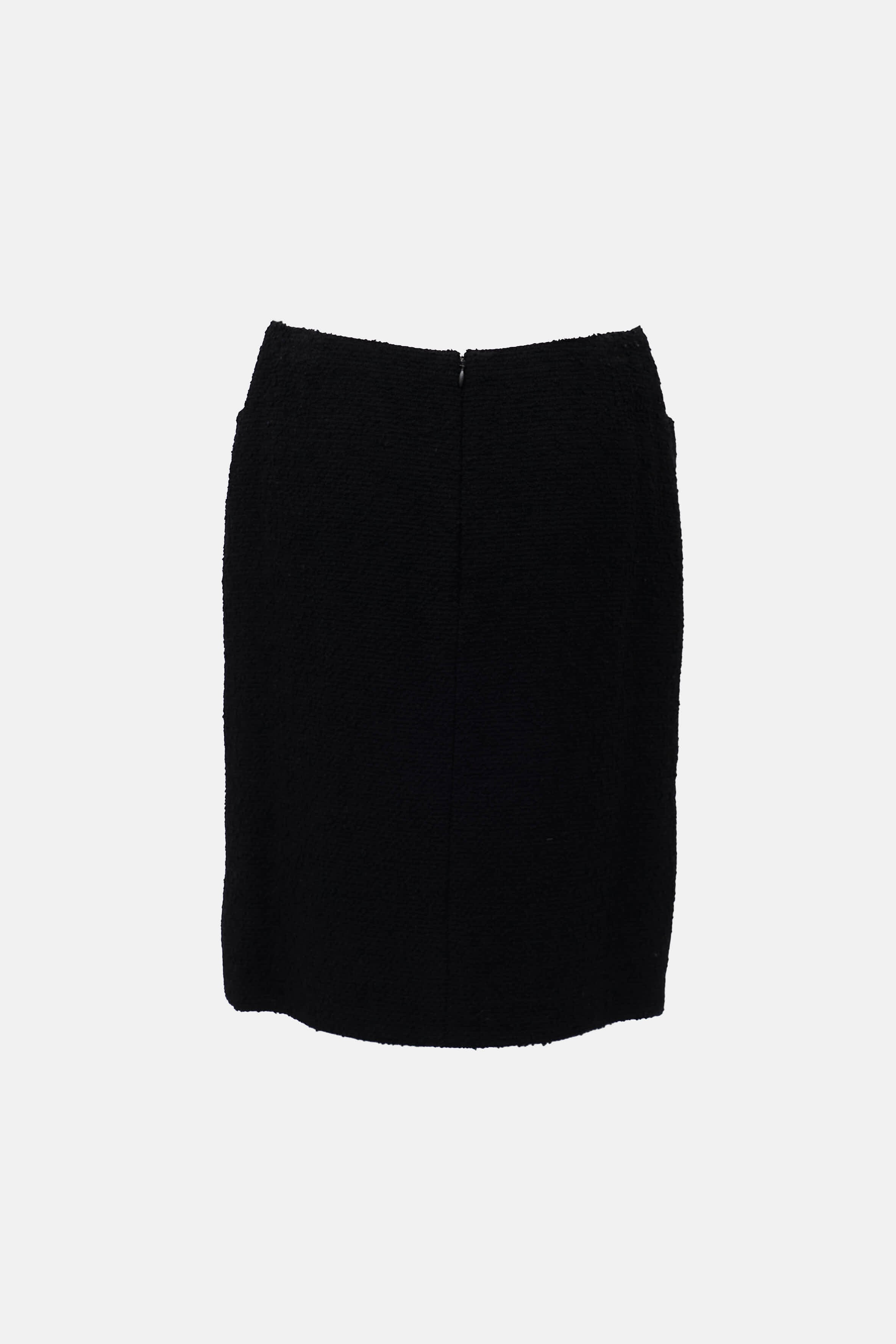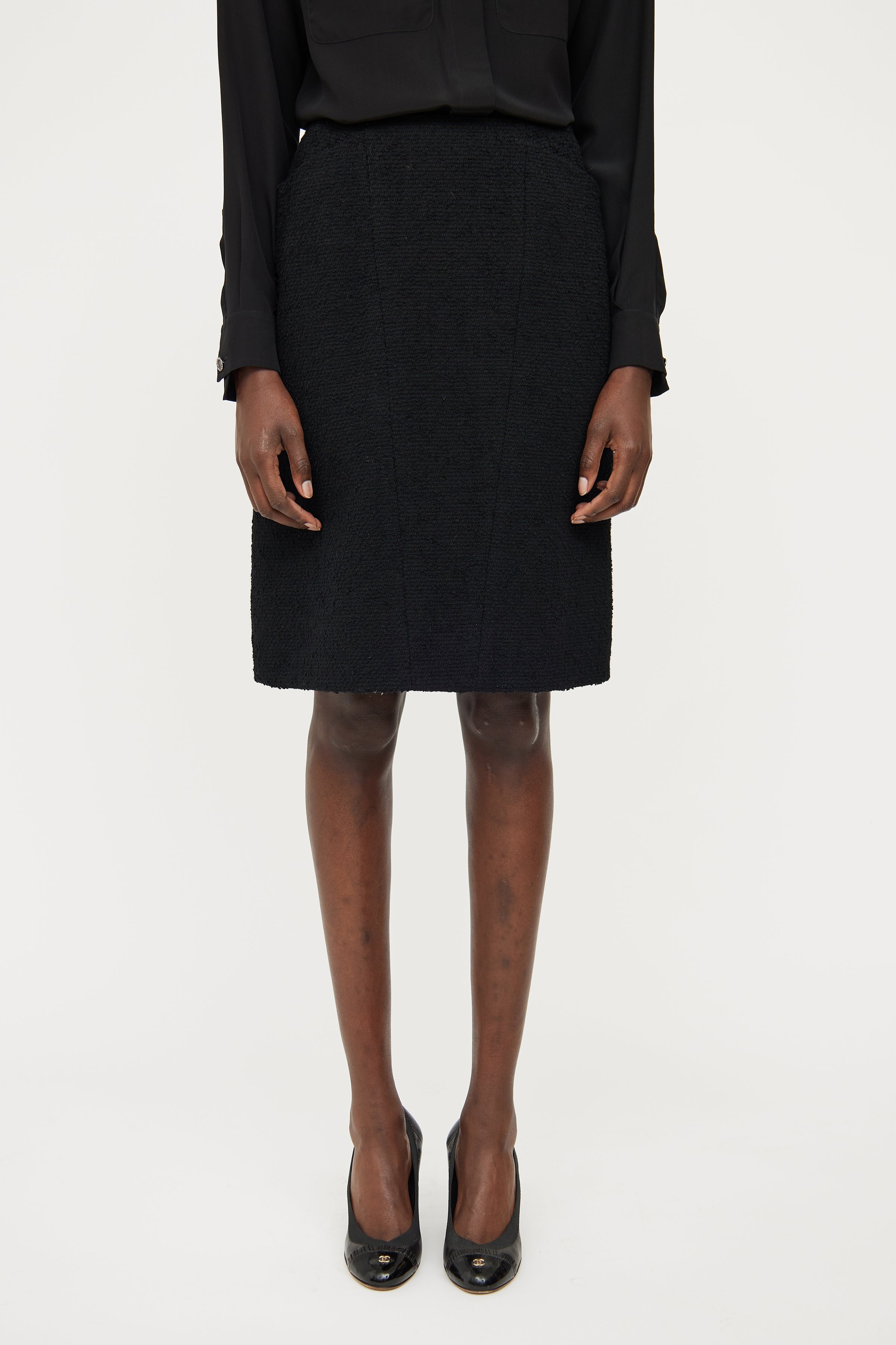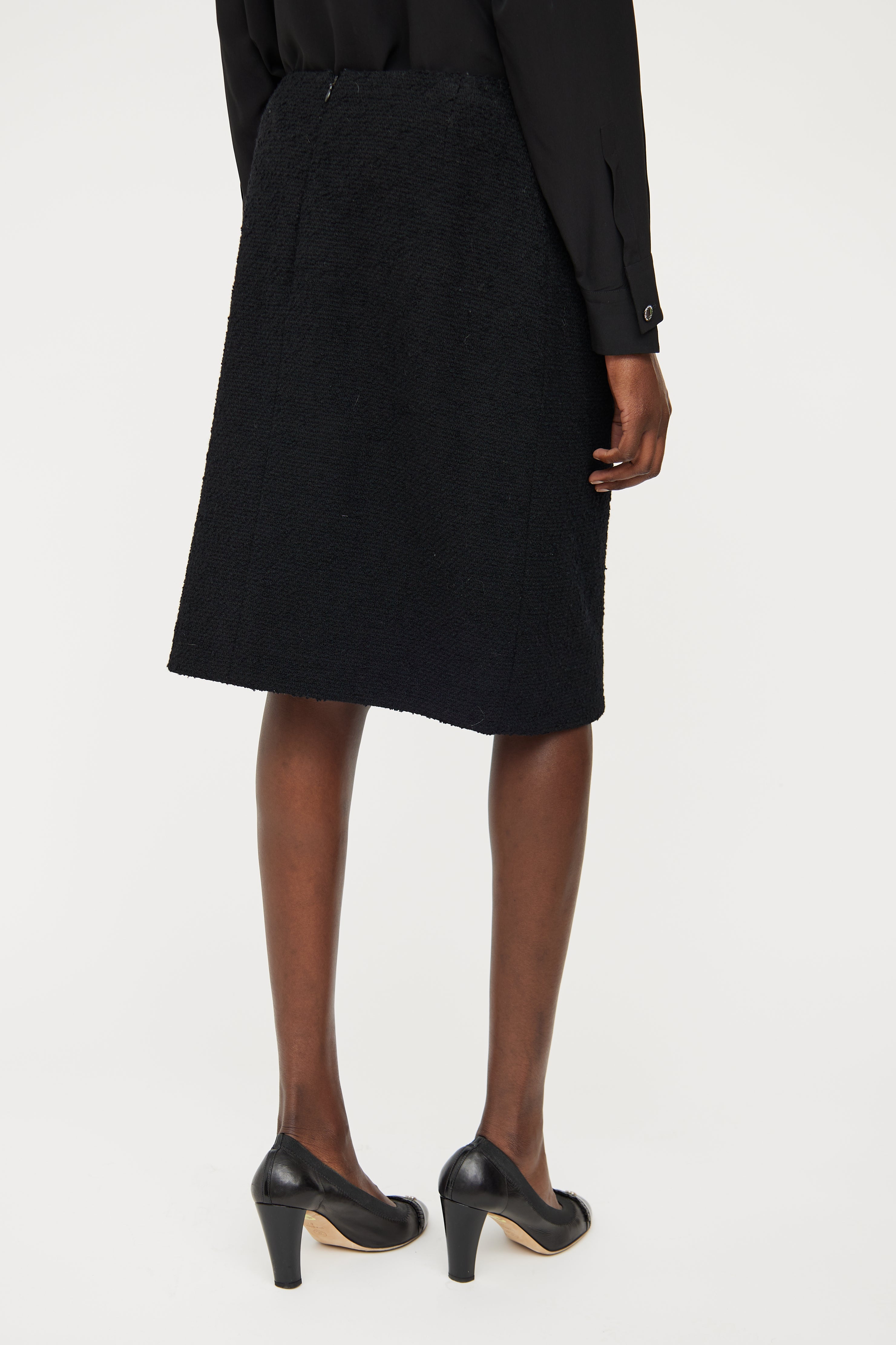 Pre-owned Chanel 1997 Fall/Winter black boucle skirt featuring slip pockets at hip and concealed zip at back. Lined. From the 1997 Fall/Winter Collection by Karl Lagerfeld.