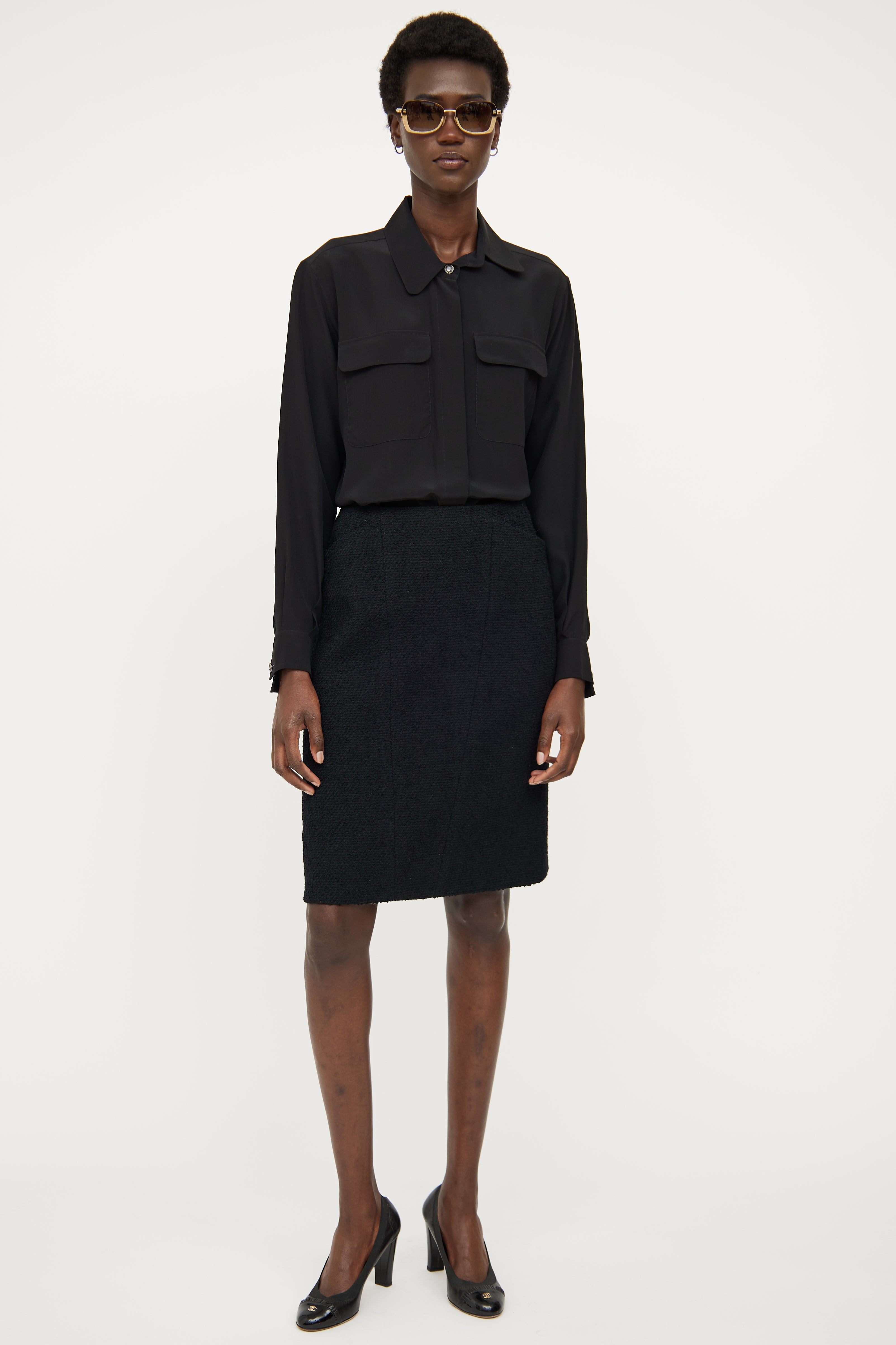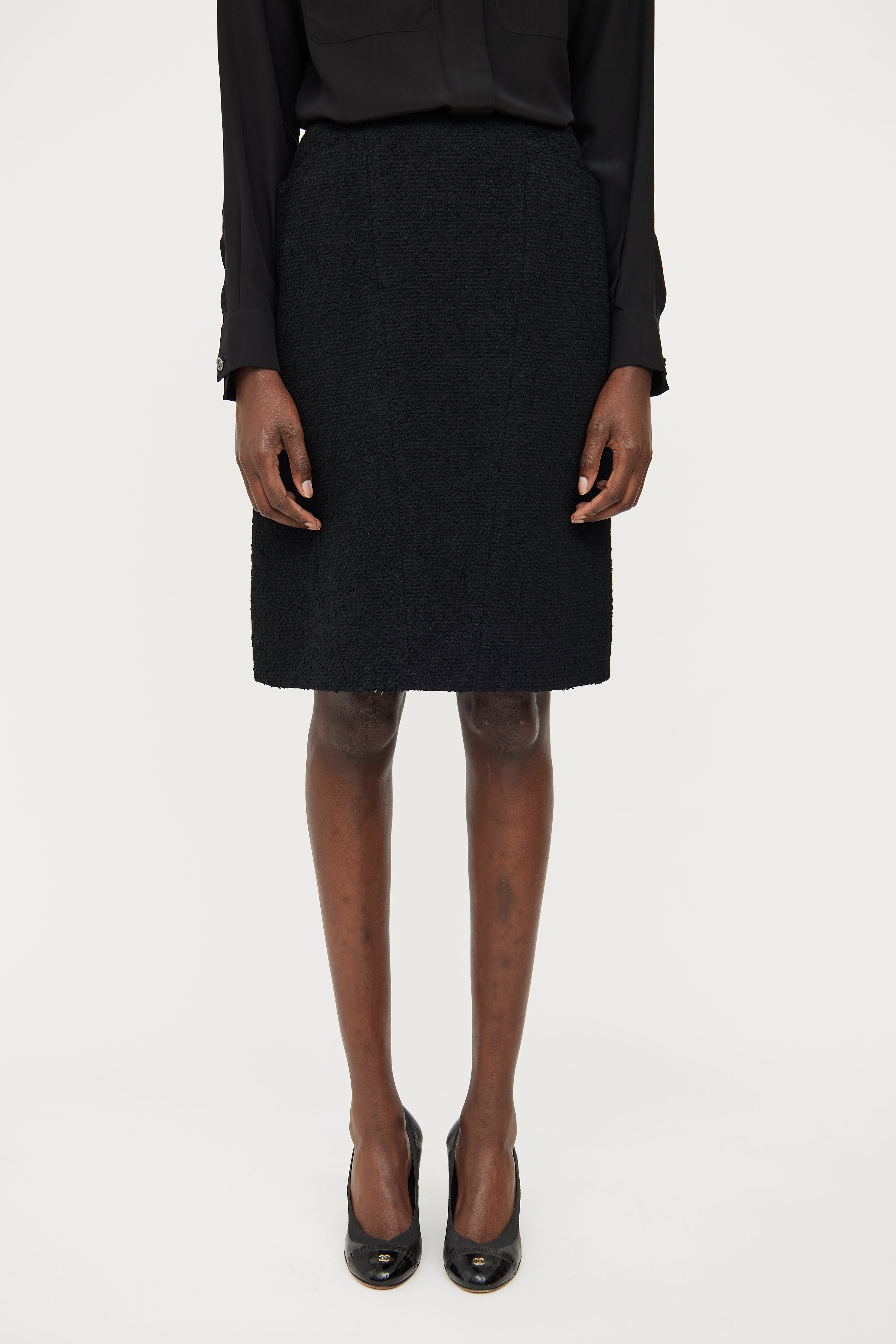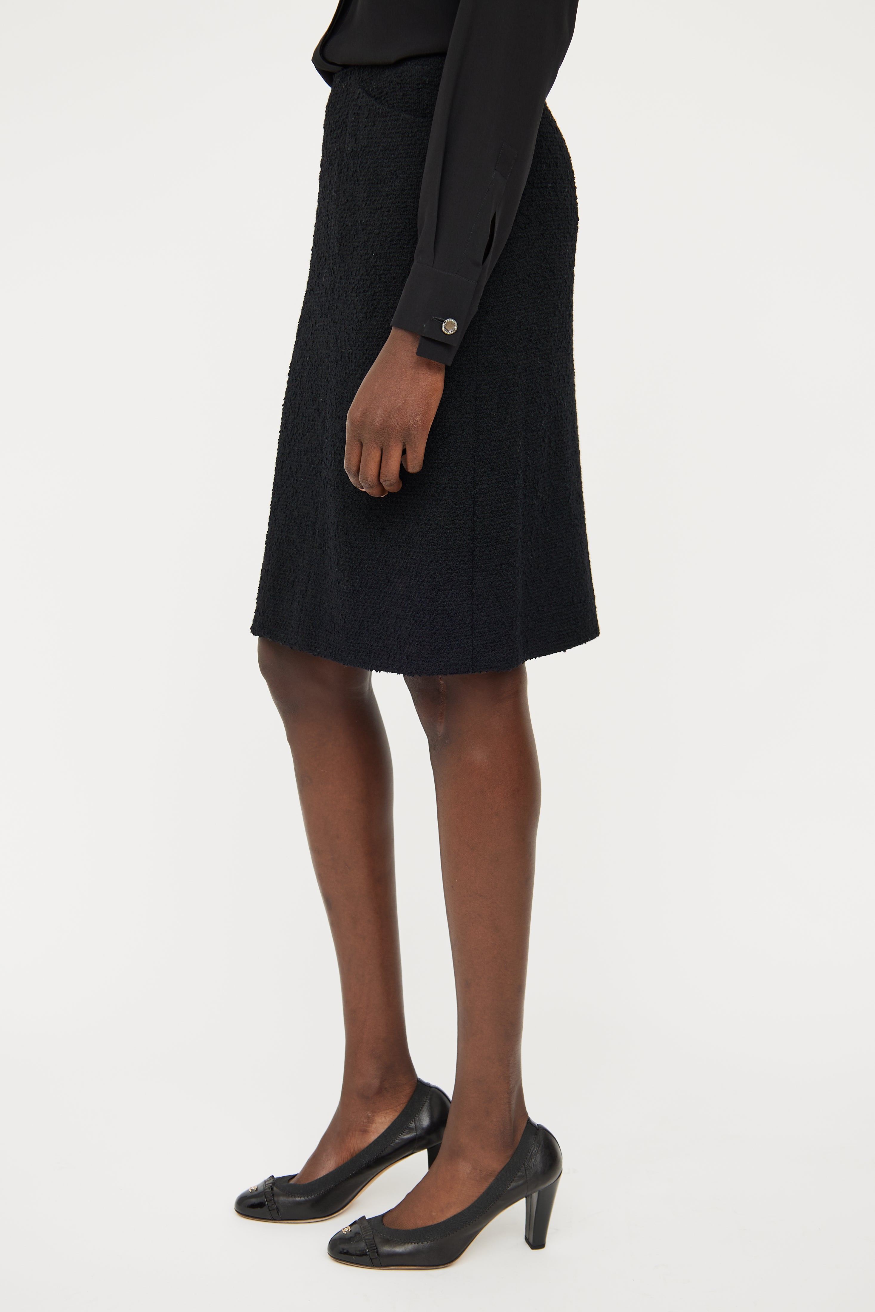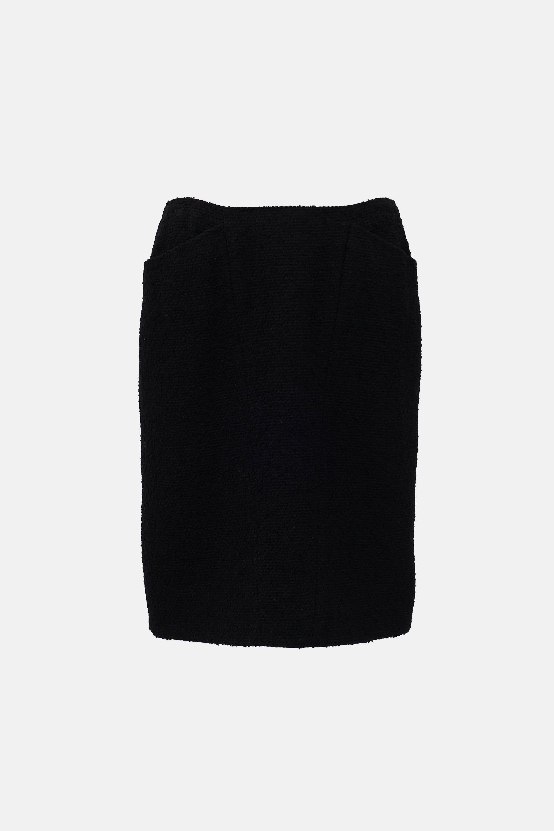Pre-owned Chanel 1997 Fall/Winter black boucle skirt featuring slip pockets at hip and concealed zip at back. Lined. From the 1997 Fall/Winter Collection by Karl Lagerfeld.