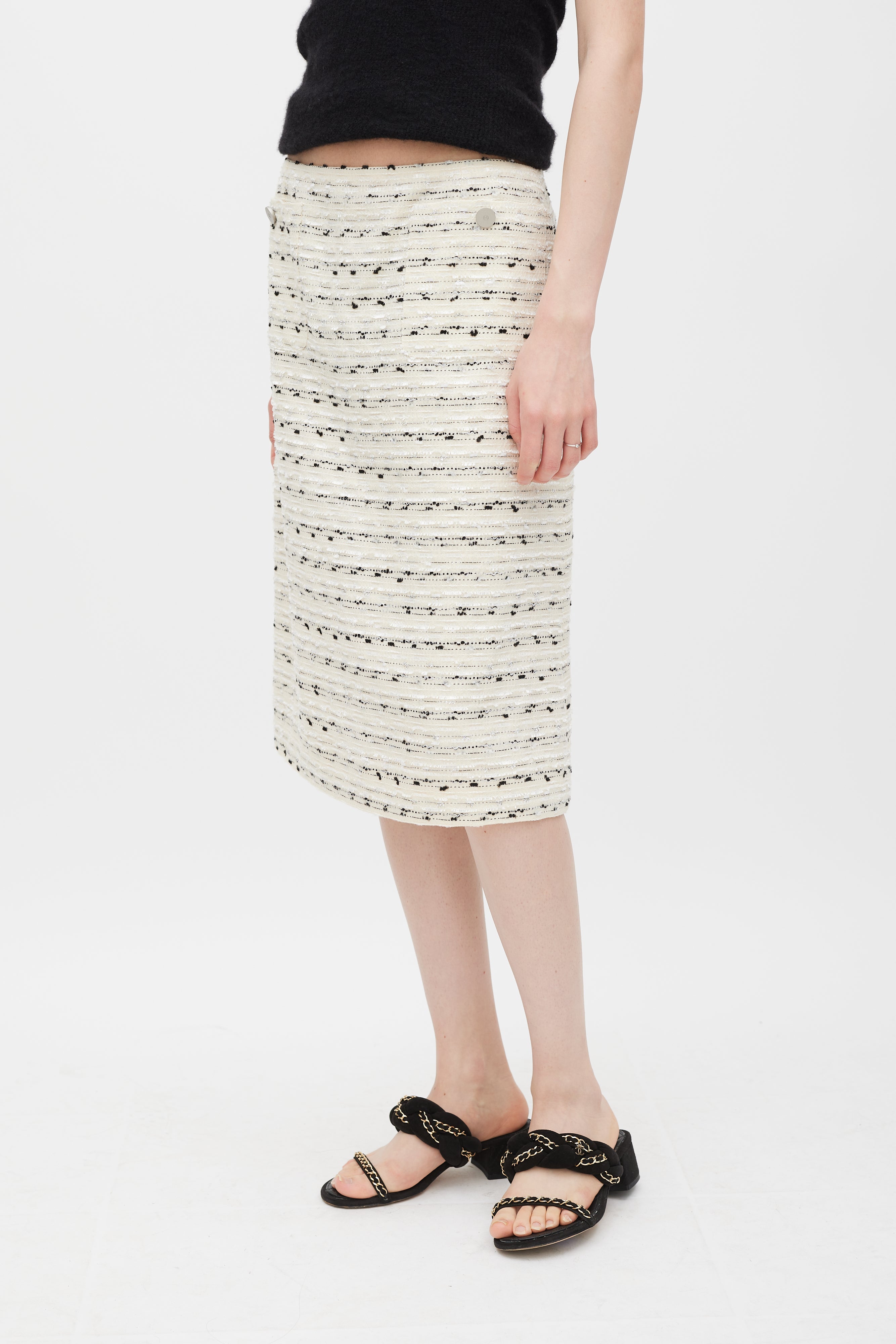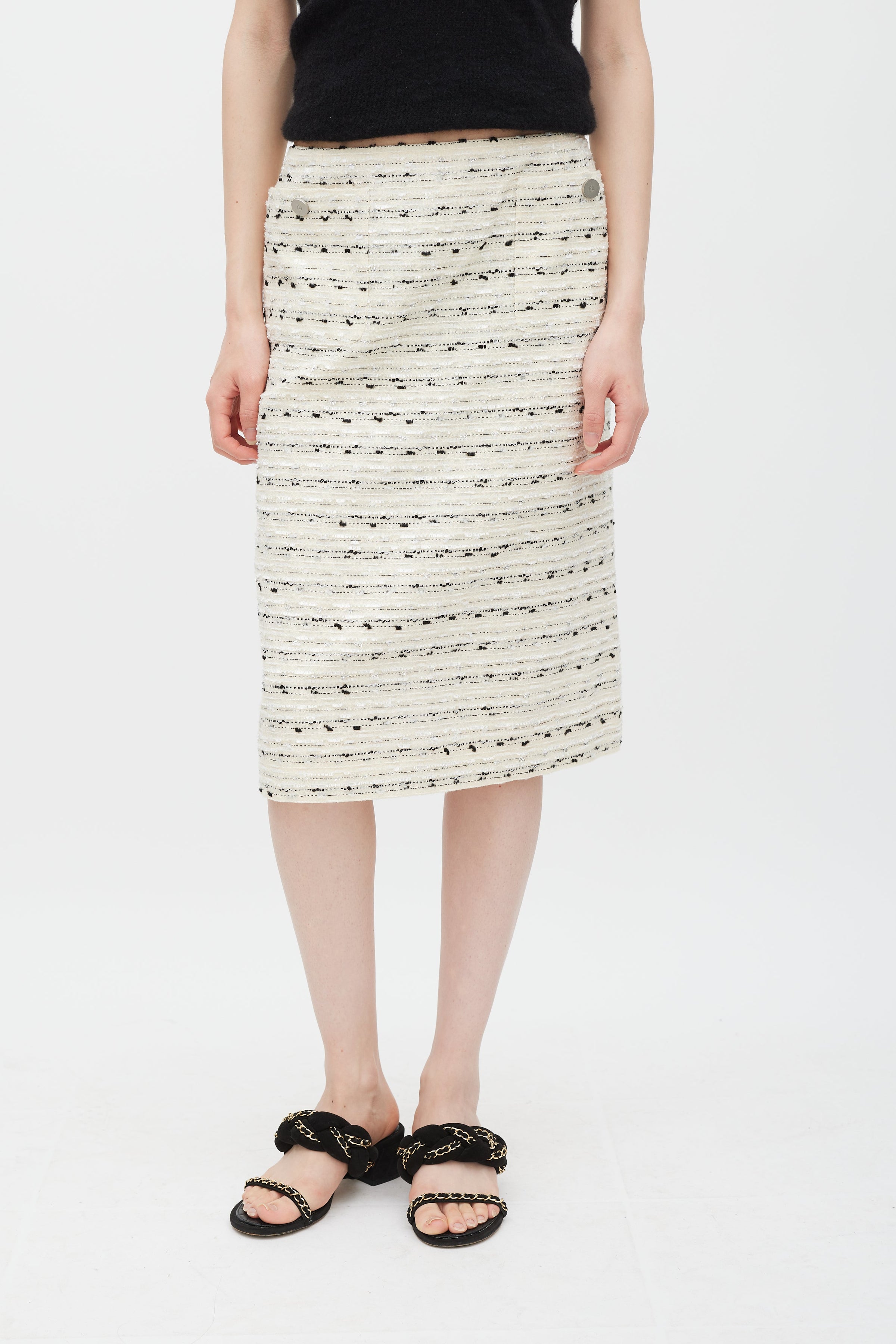 Pre-owned Chanel 1999 cream wool tweed skirt featuring black and grey stripes, two pockets at hips with CC button closure, and concealed zip closure at back. Lined.