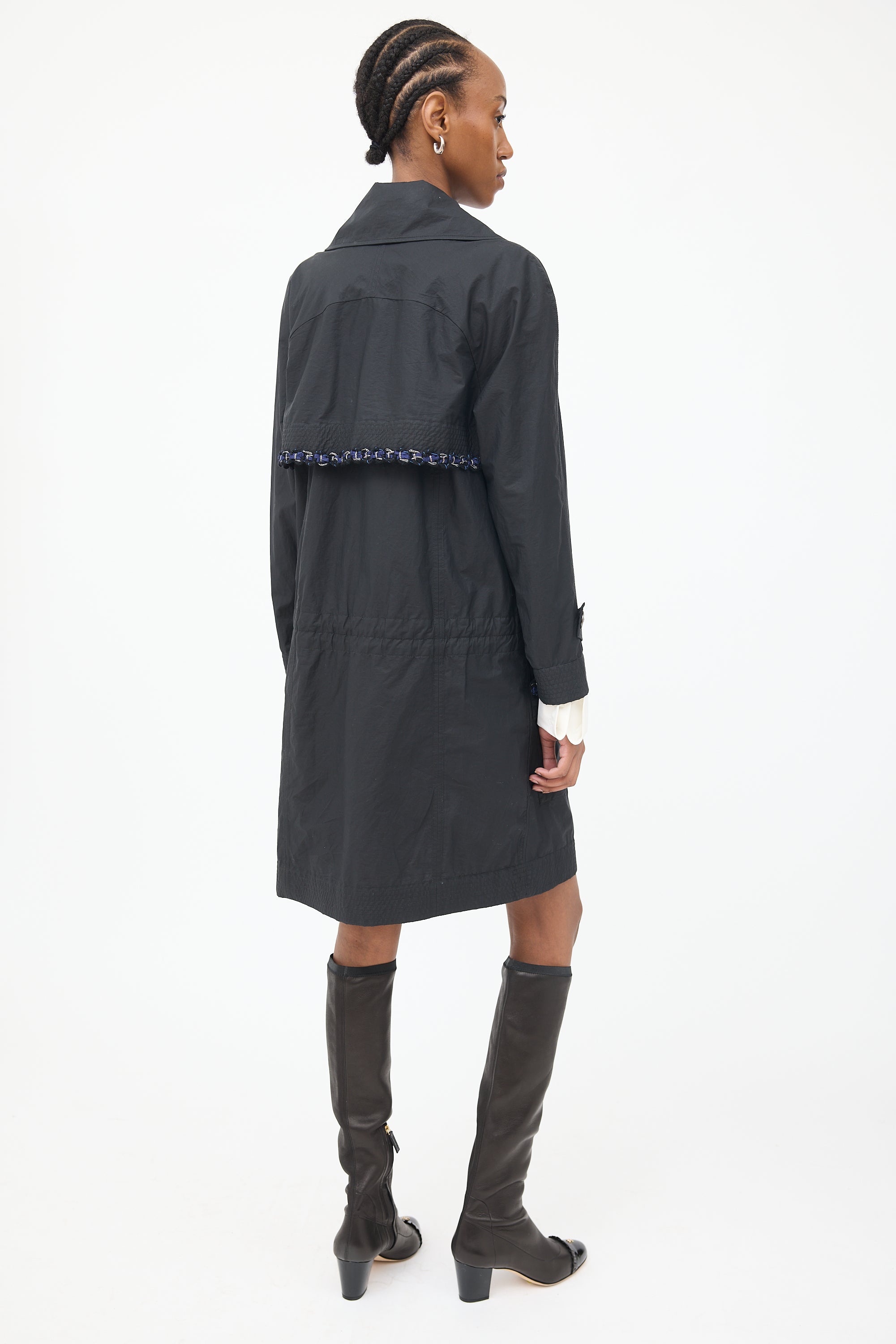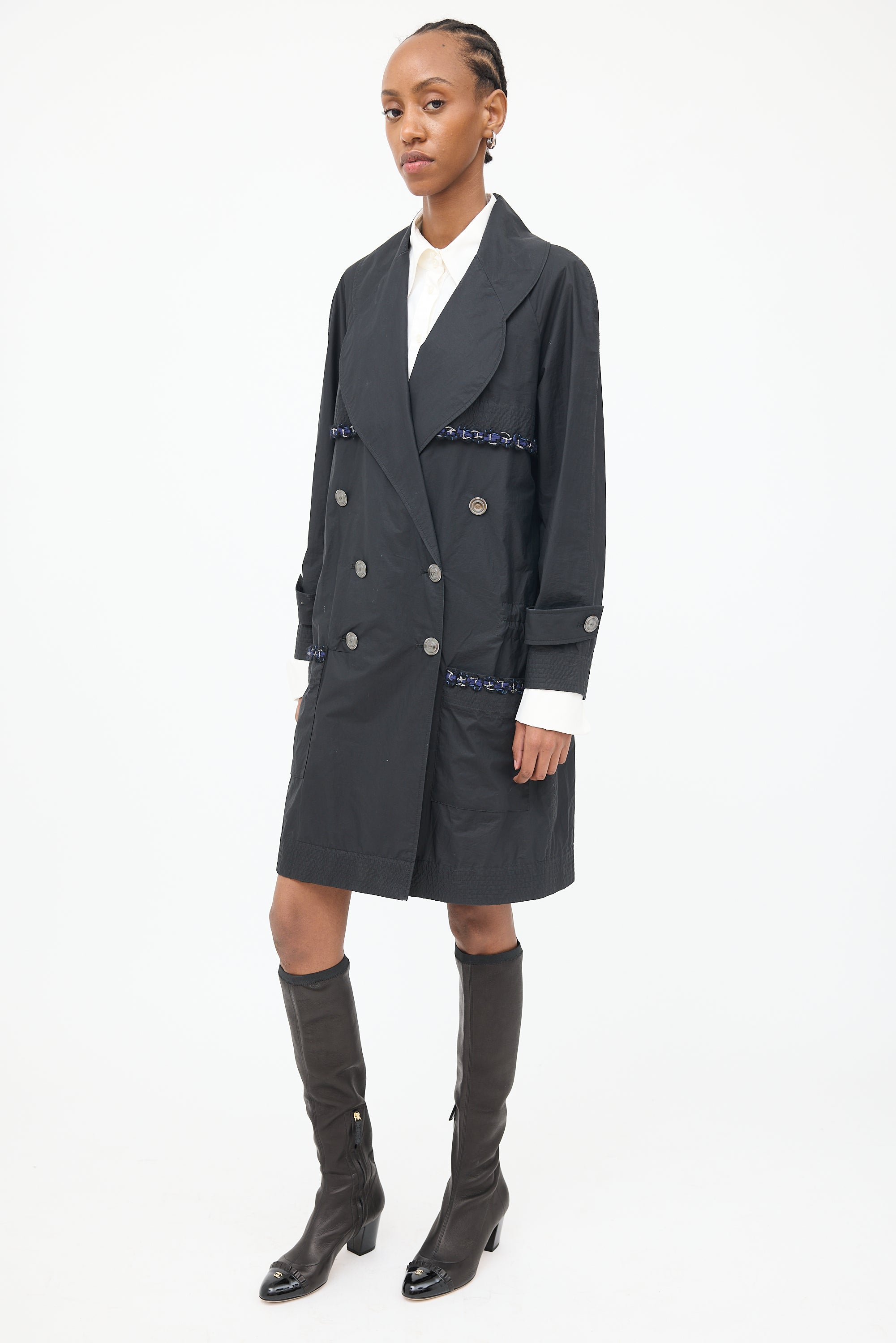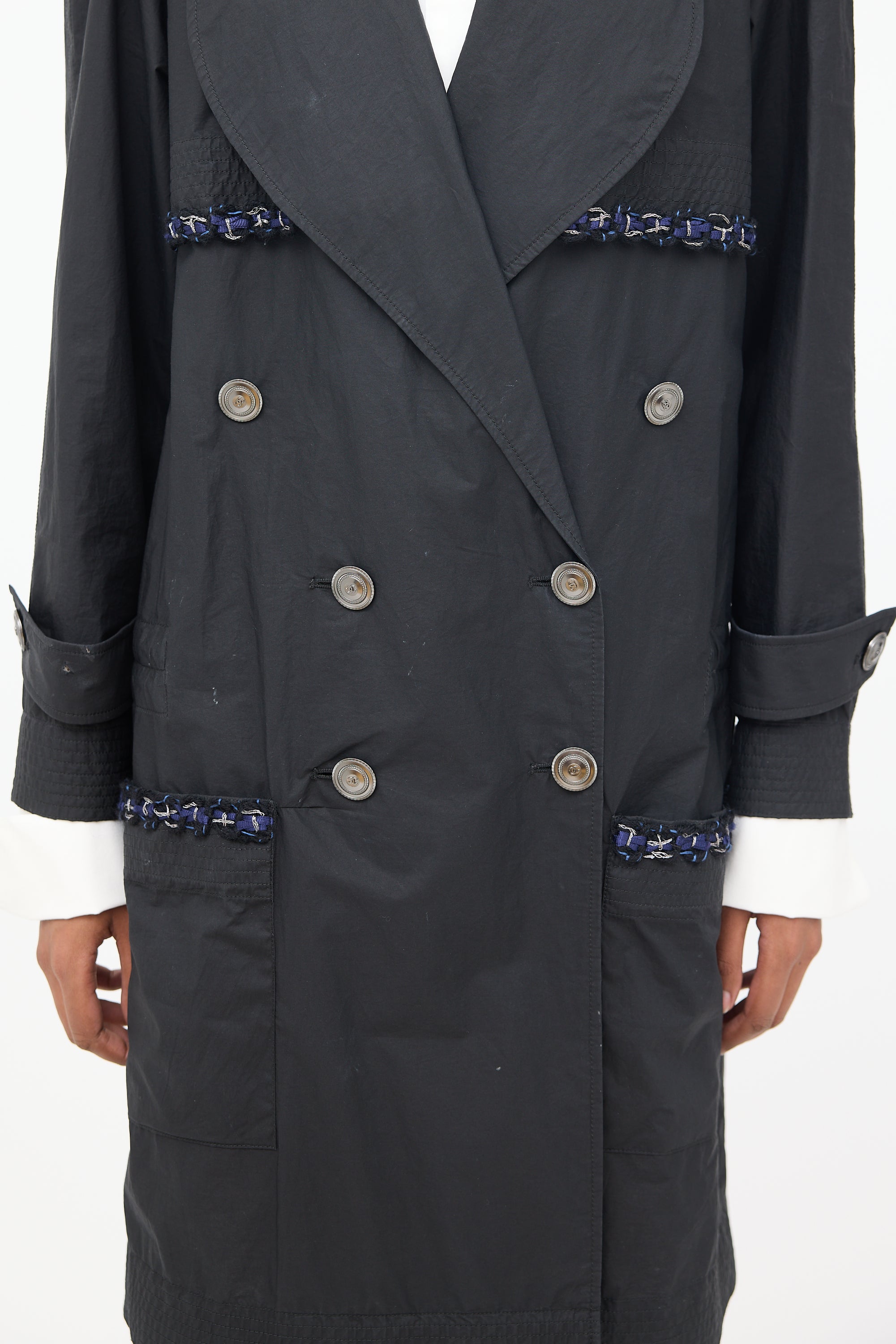 Pre-owned Chanel black 2014 trench featuring rounded lapel collar, double breasted button front closure, long raglan sleeves with shirred cuffs and belt detail, storm flap with navy and blue braided trim, large patch pockets at side, inside pocket, cinch detail at inner waist and shirred hem.