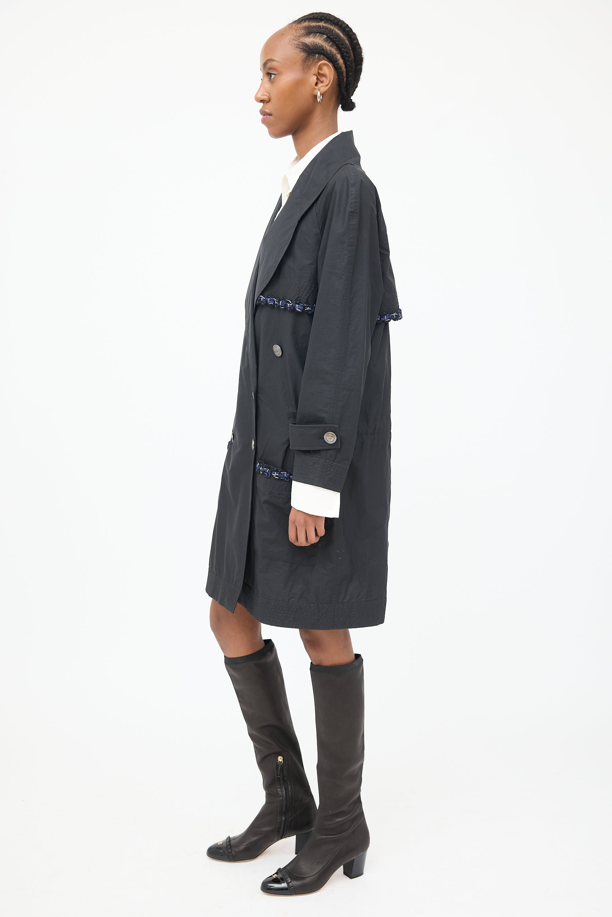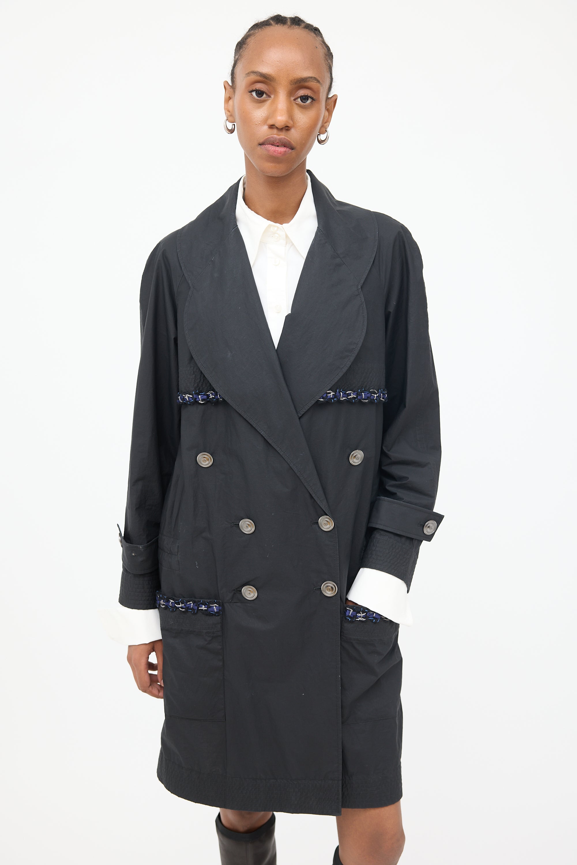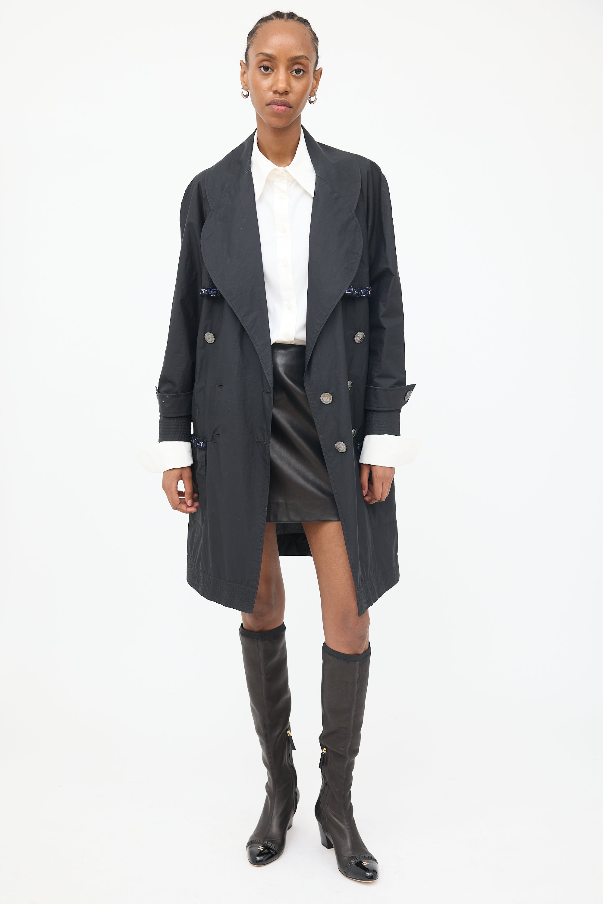 Pre-owned Chanel black 2014 trench featuring rounded lapel collar, double breasted button front closure, long raglan sleeves with shirred cuffs and belt detail, storm flap with navy and blue braided trim, large patch pockets at side, inside pocket, cinch detail at inner waist and shirred hem.