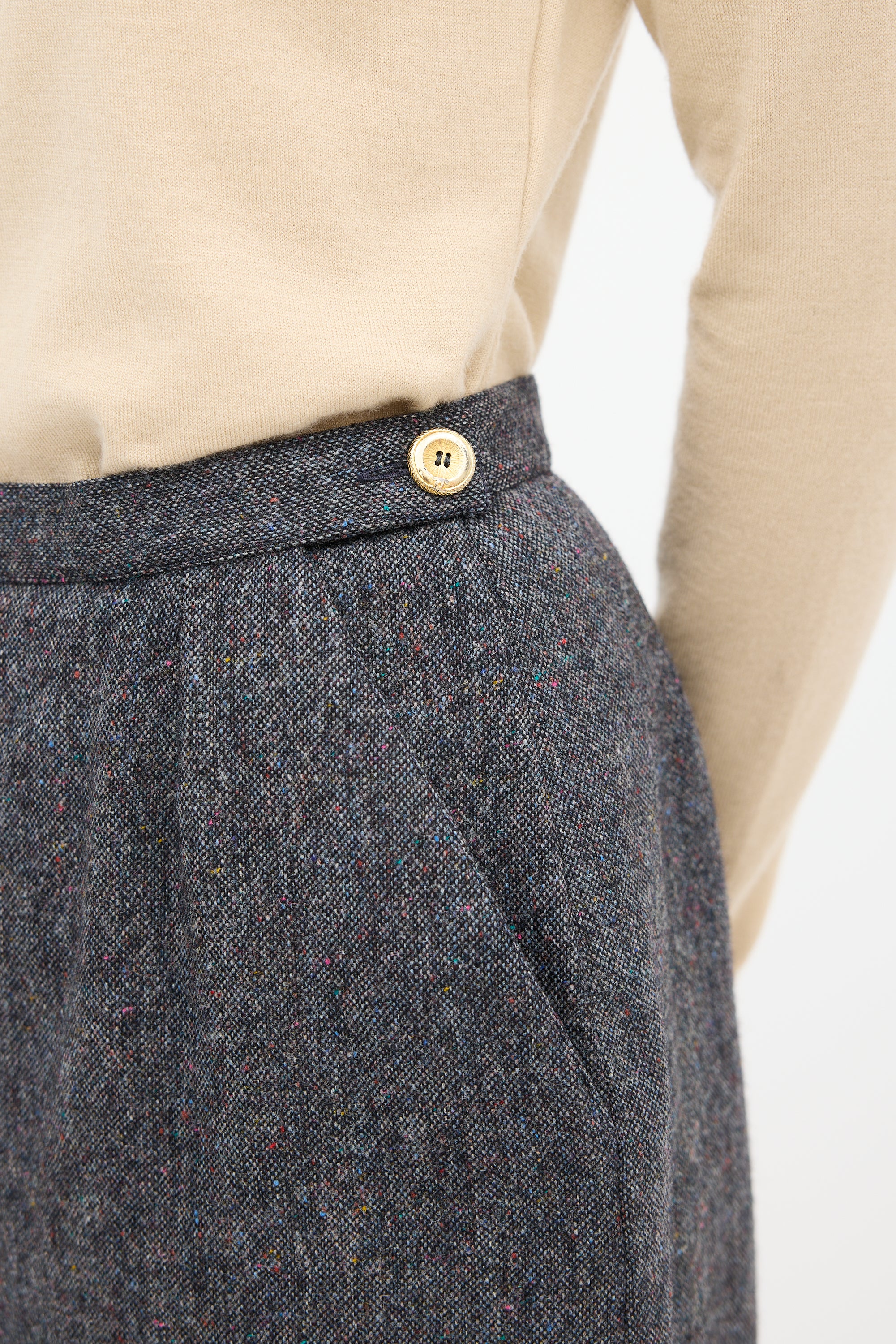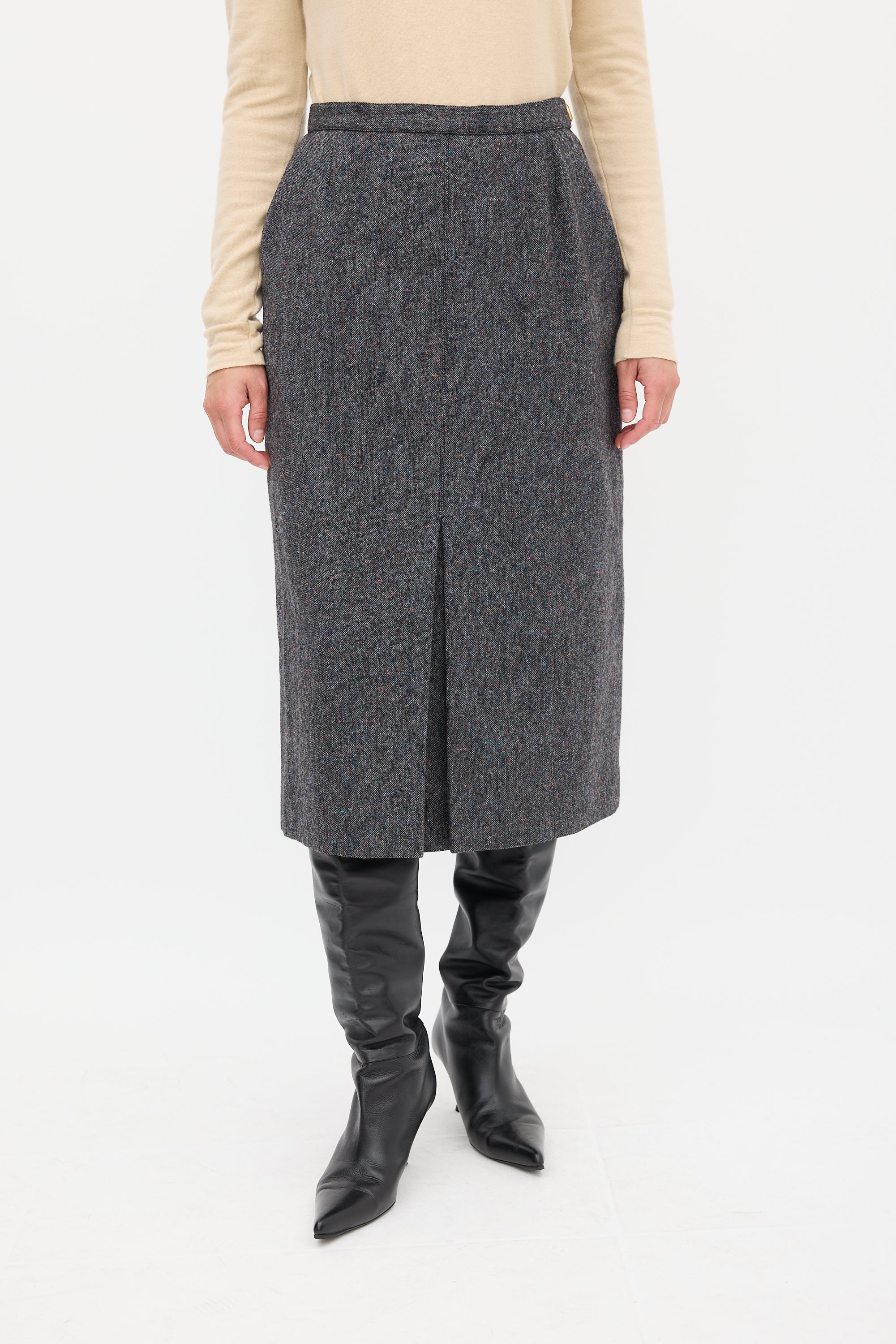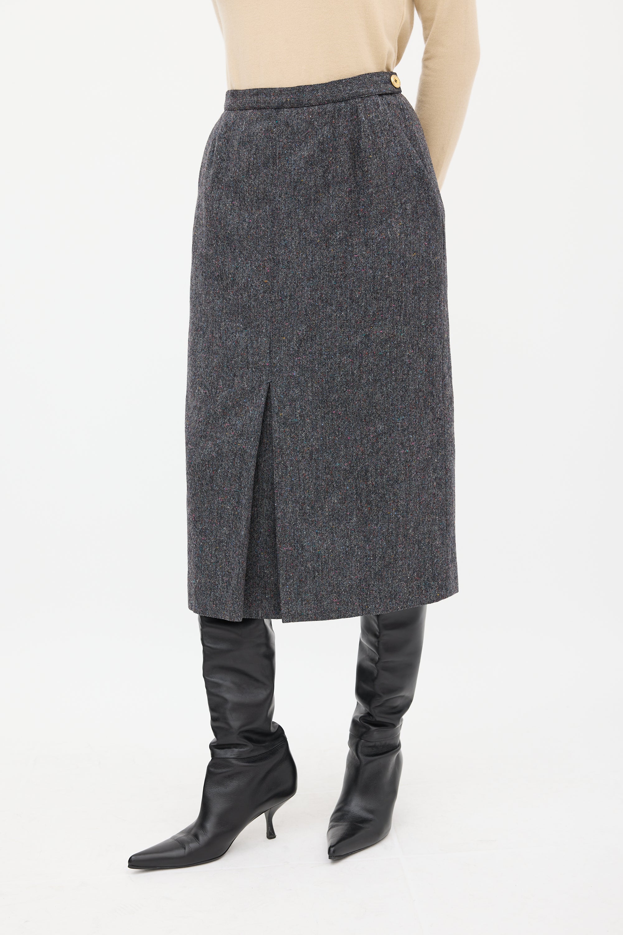 Pre-owned Chanel grey marbled wool skirt featuring a darted front, godet pleat at hem, two slip pockets at hip, and zip at side with gold tone logo button closure. Lined.