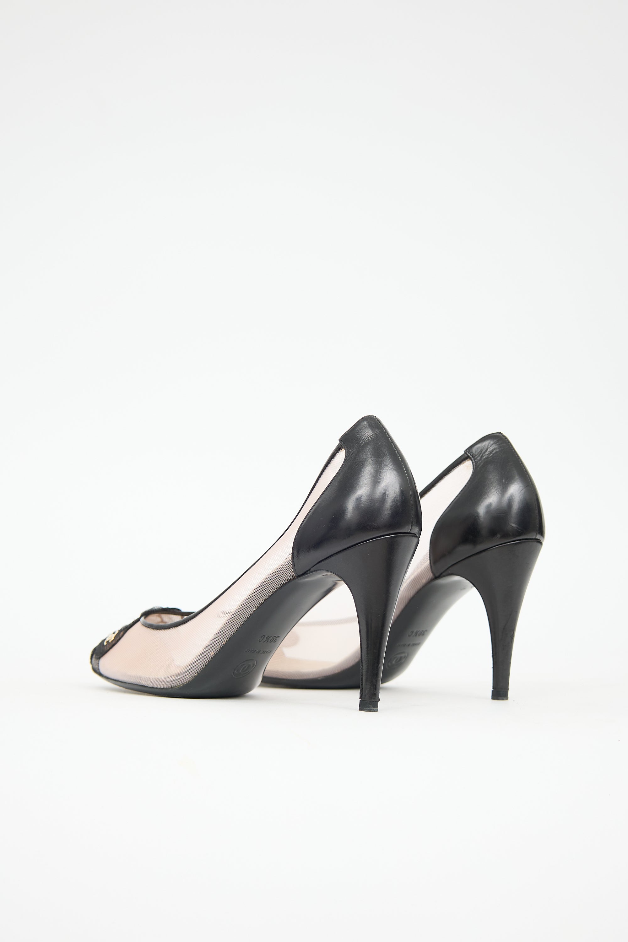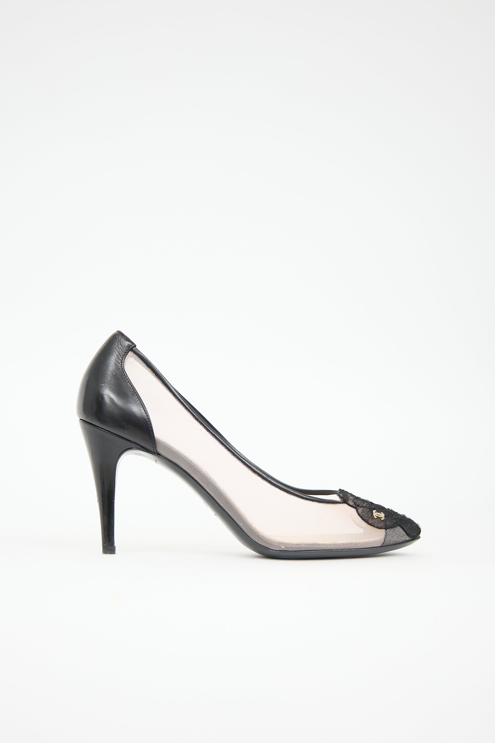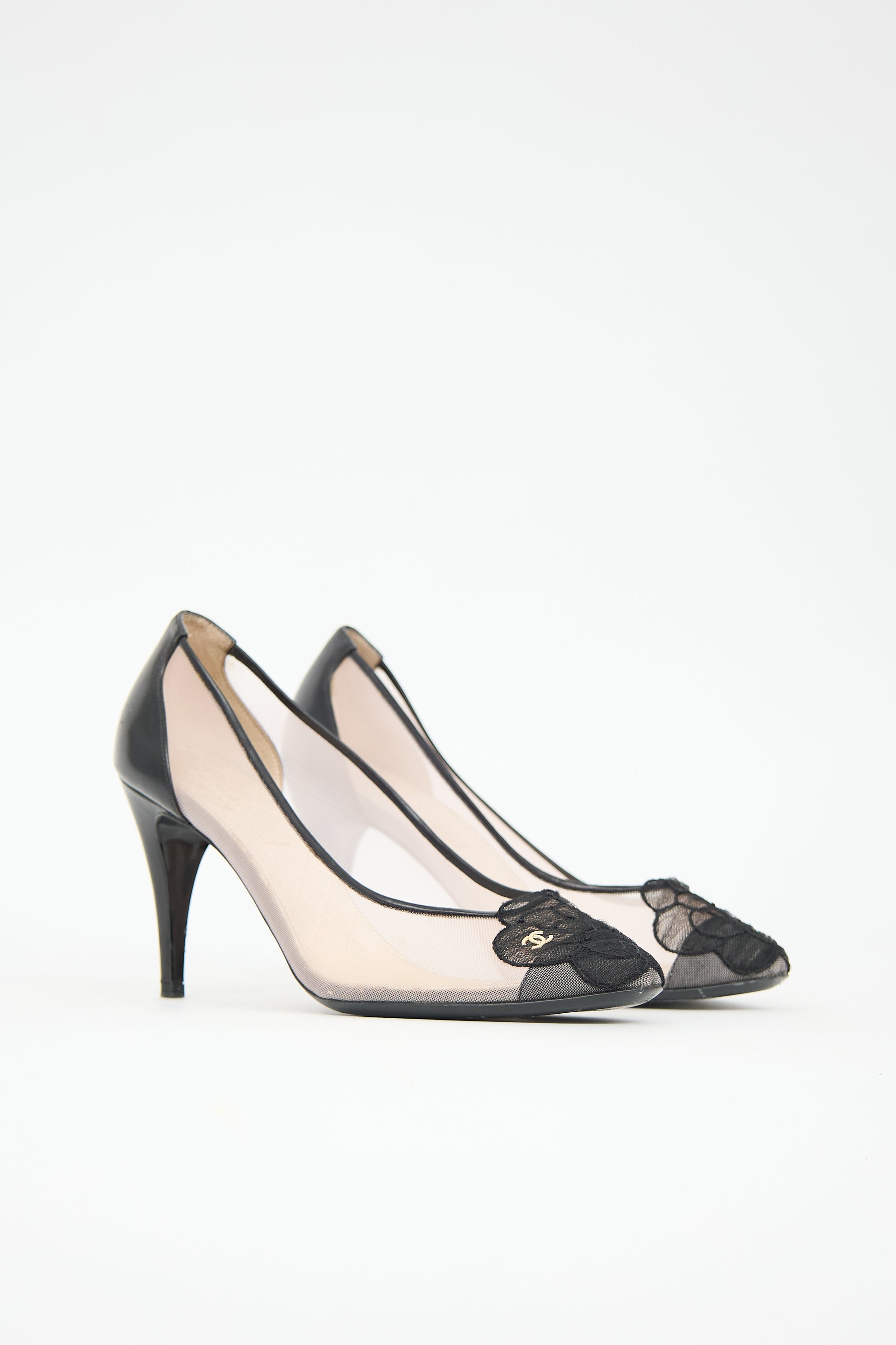 Pre-owned Chanel beige and black mesh pumps featuring almond toe, lace camellia applique with interlocking CC embellishment at vamp, leather trim and counter panel, and covered stiletto heel. Comes with original box and dust bags.