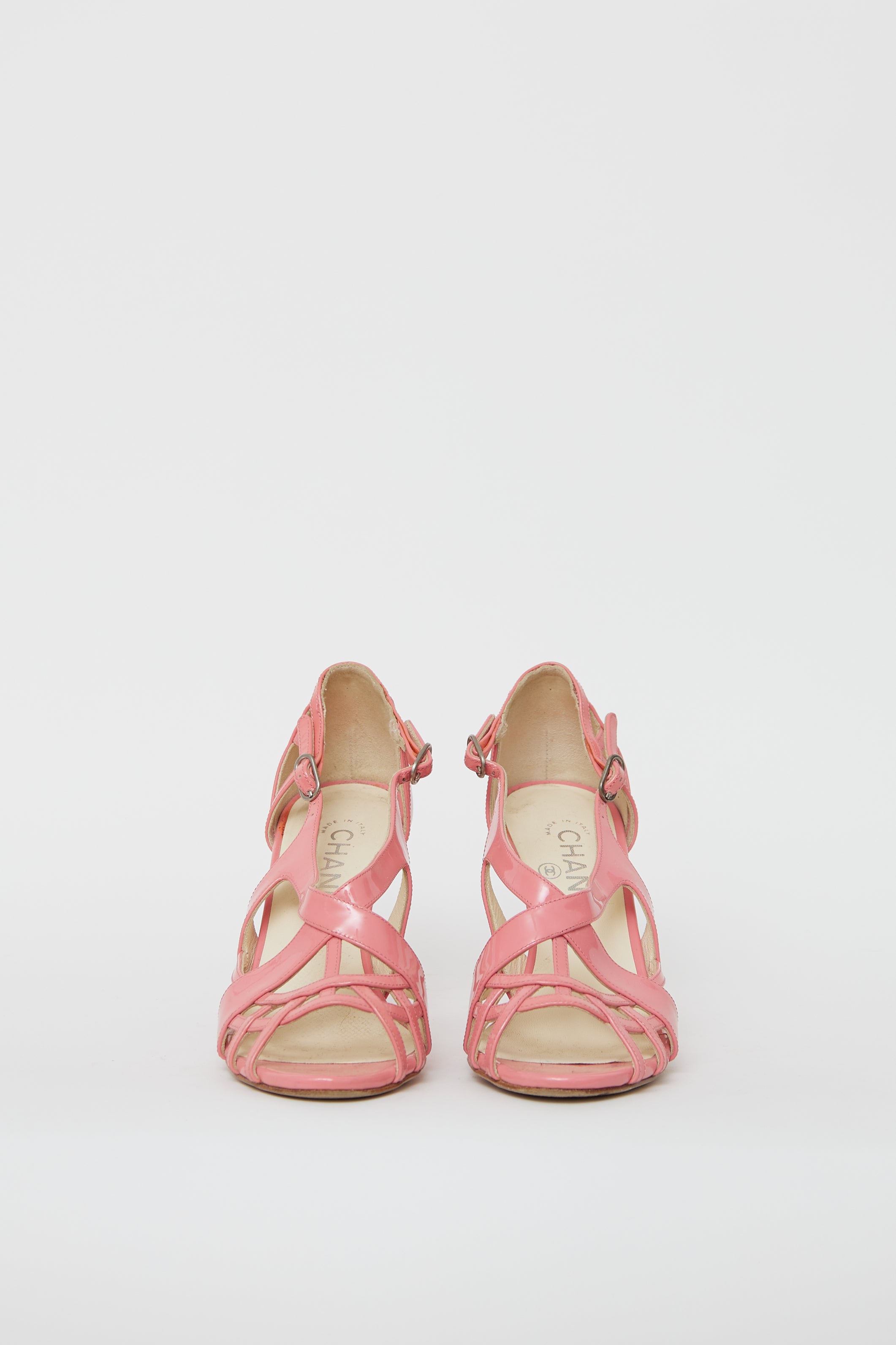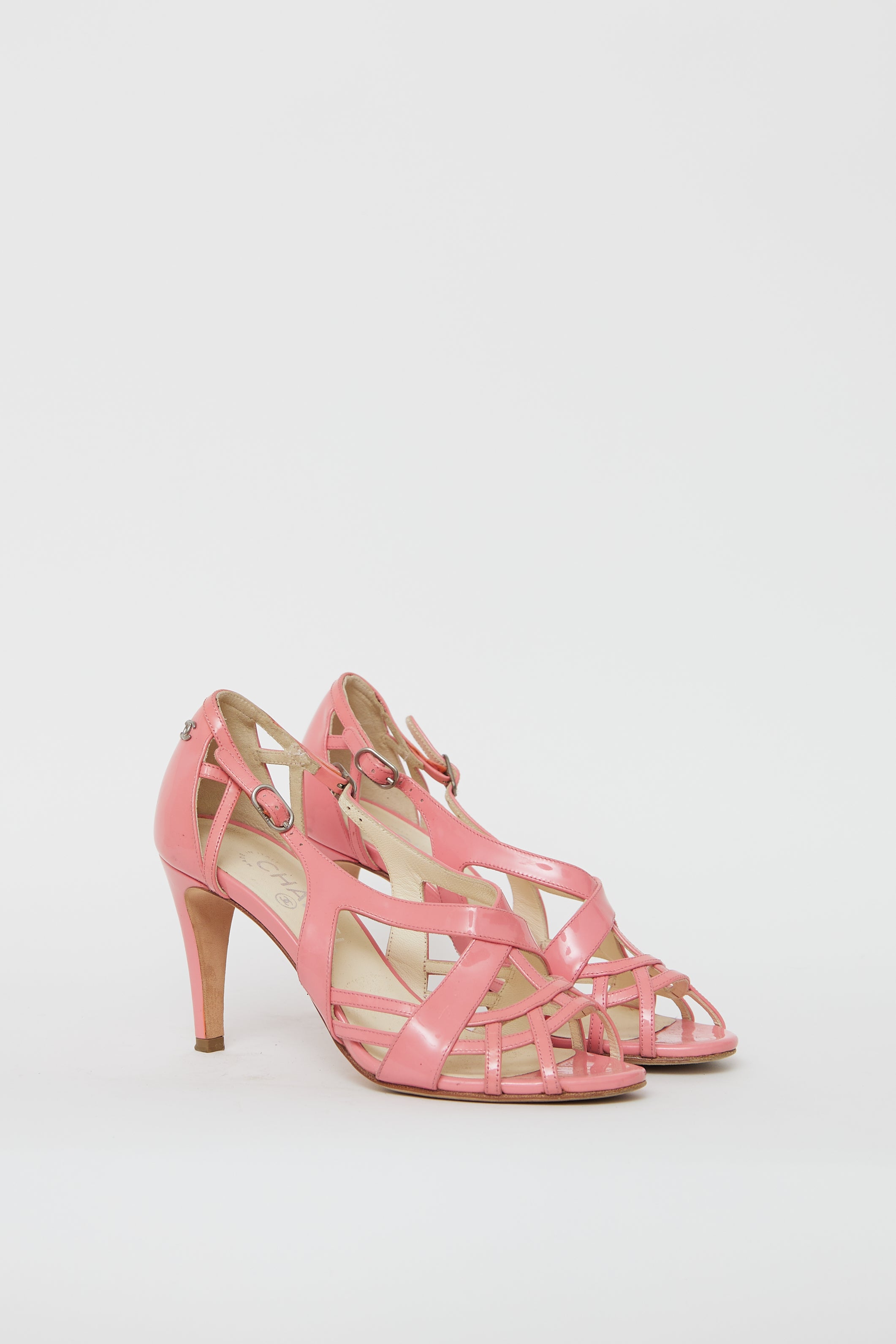 Pre-owned Chanel pink patent leather sandals featuring an open peep toe, strappy cage upper, wrapped stiletto heel, silver tone CC logo hardware at counter, and dual adjustable strap at ankle.