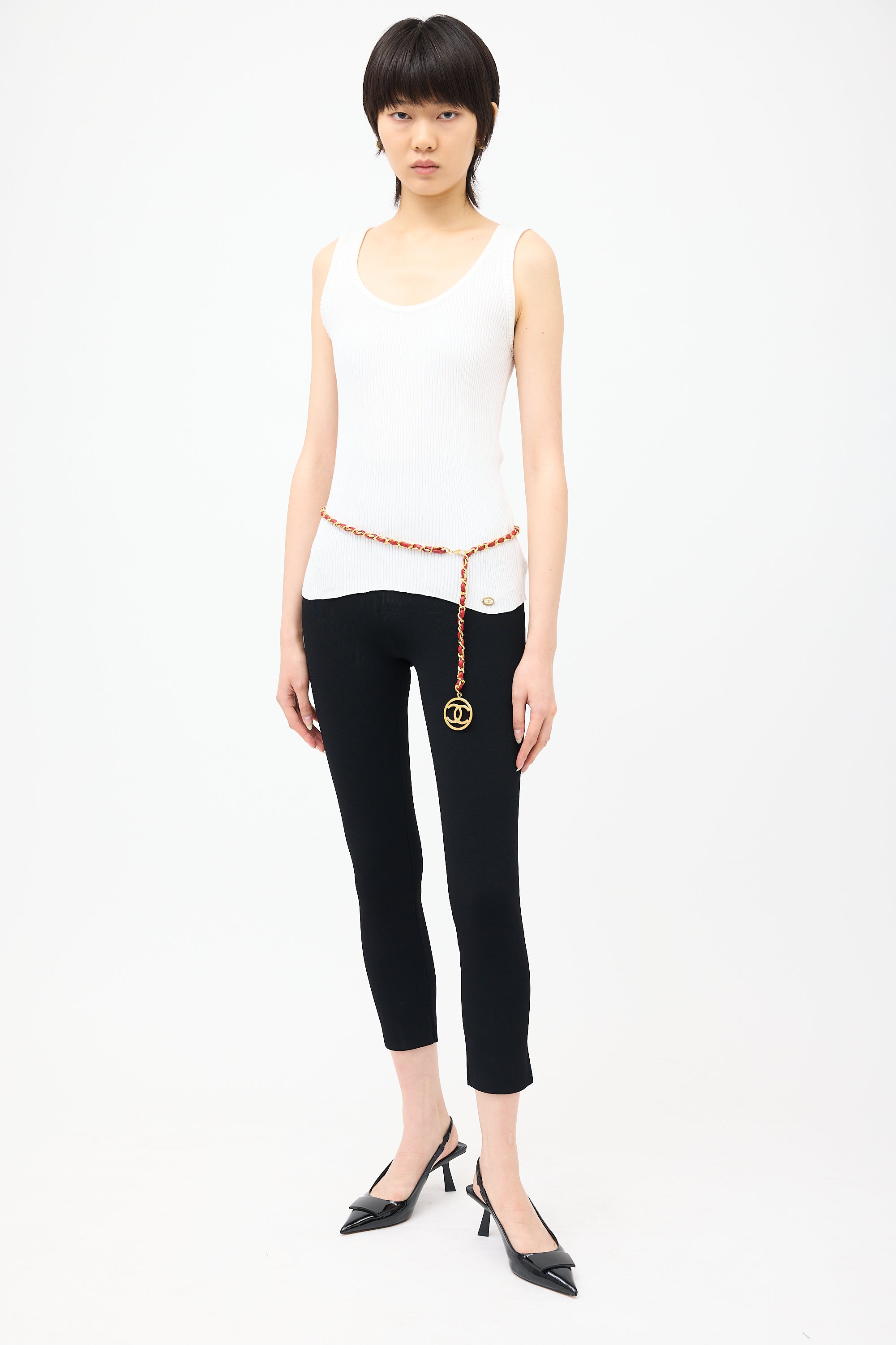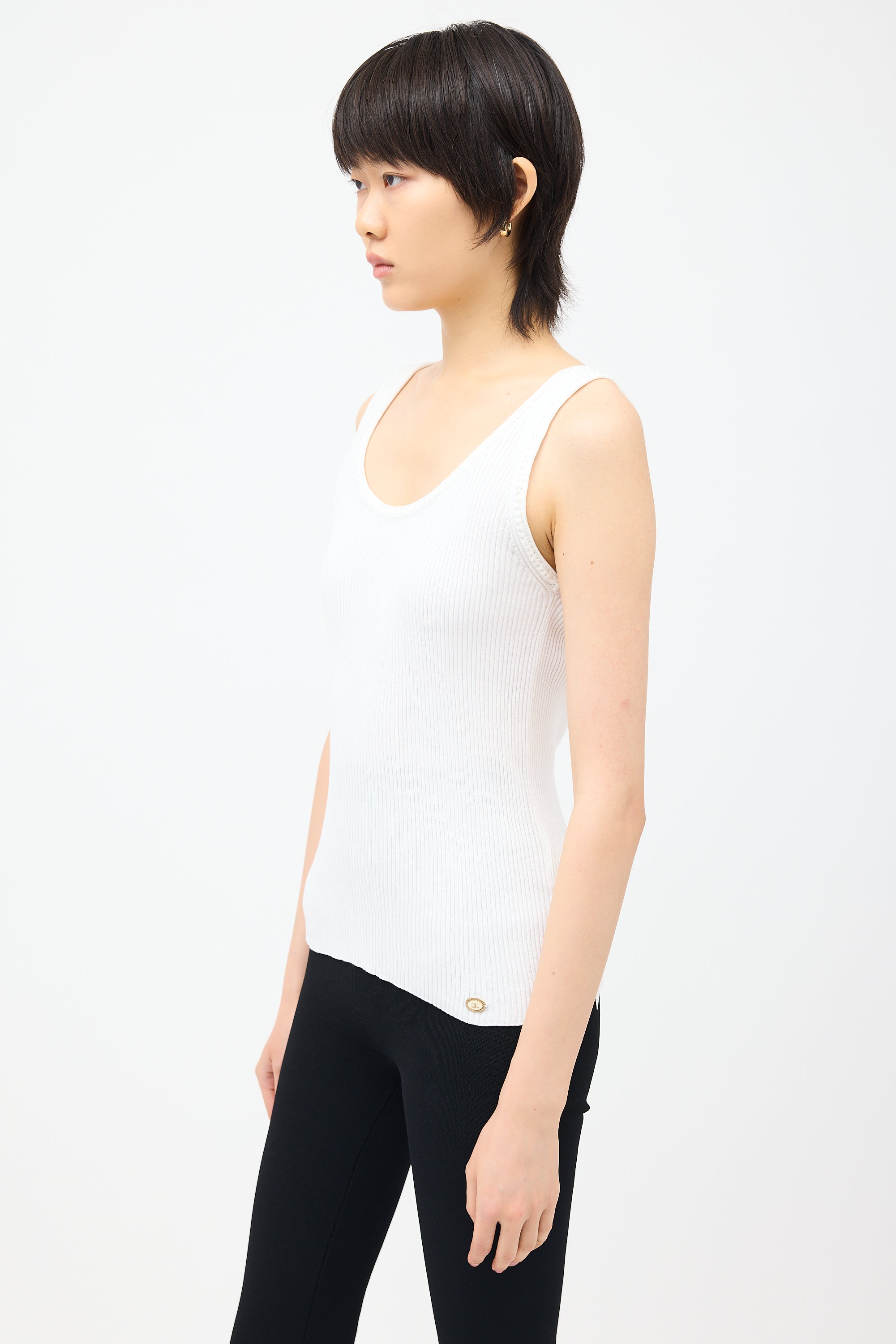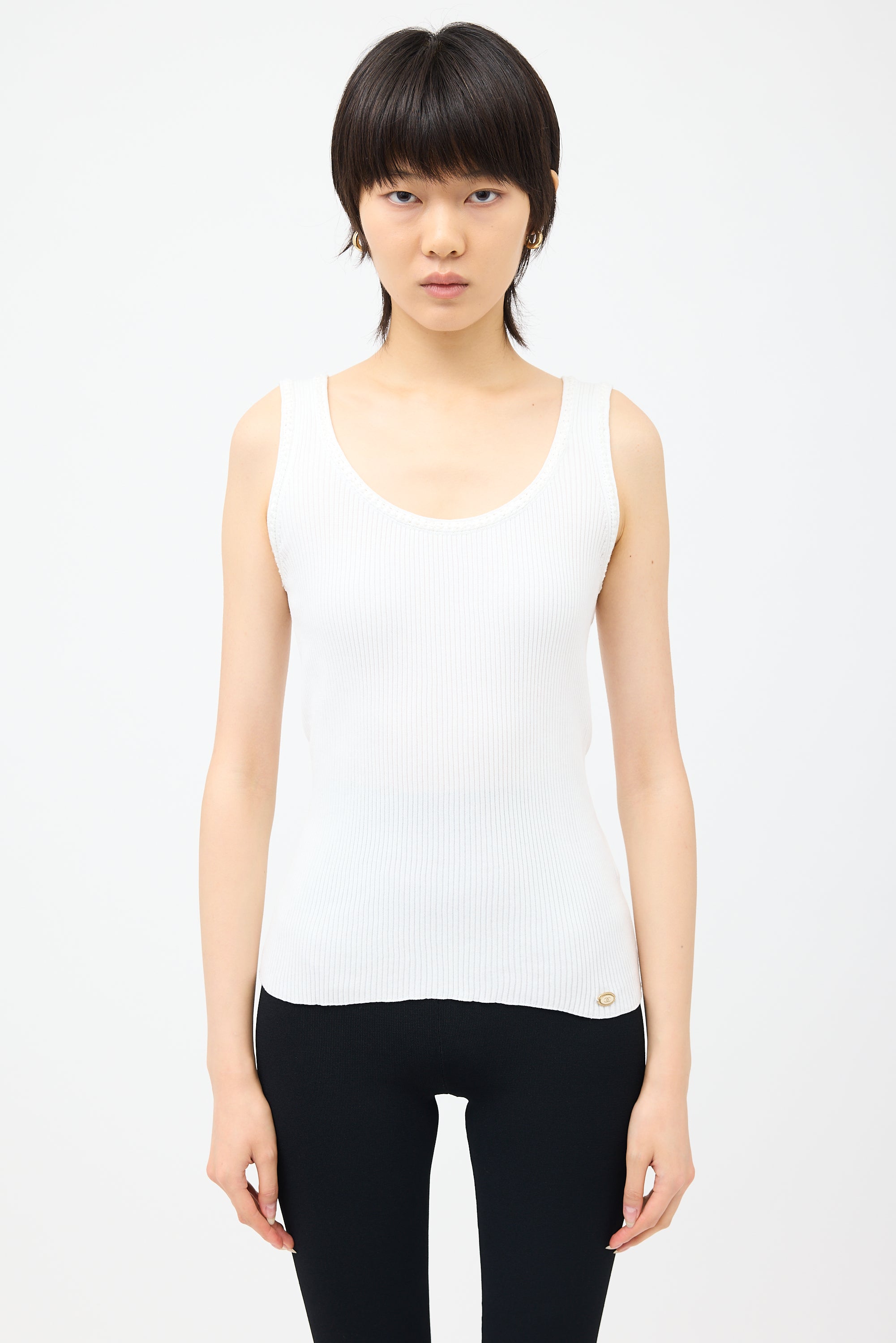 Pre-owned Chanel white rib knit tank top featuring round neckline, braided detail trim, and gold tone CC logo embellishment at hem.