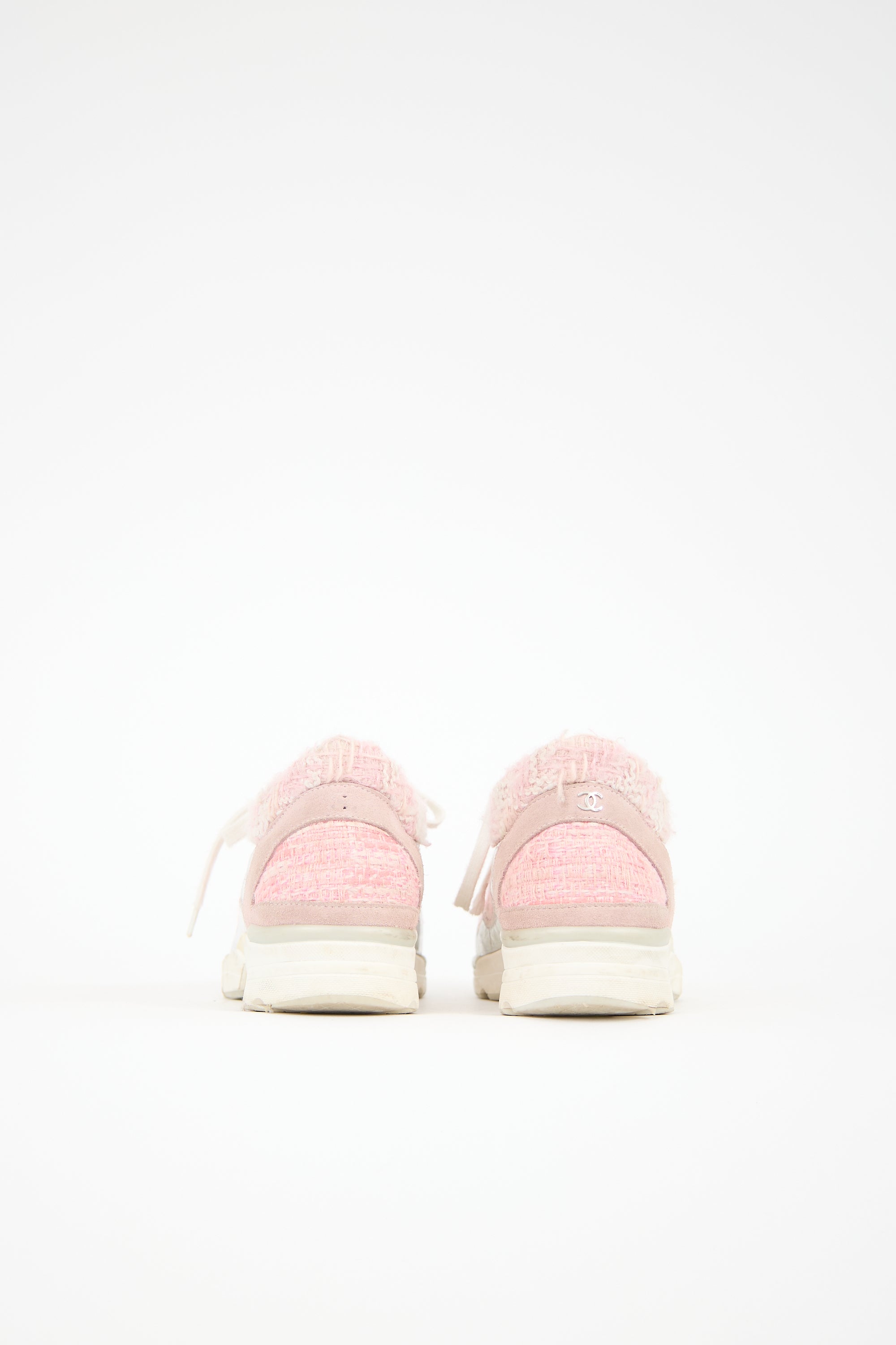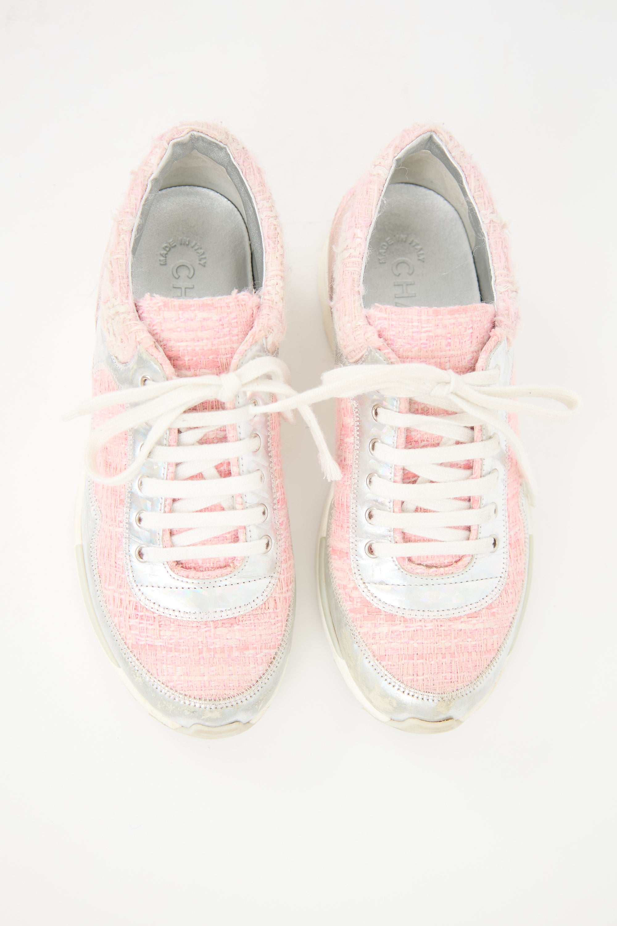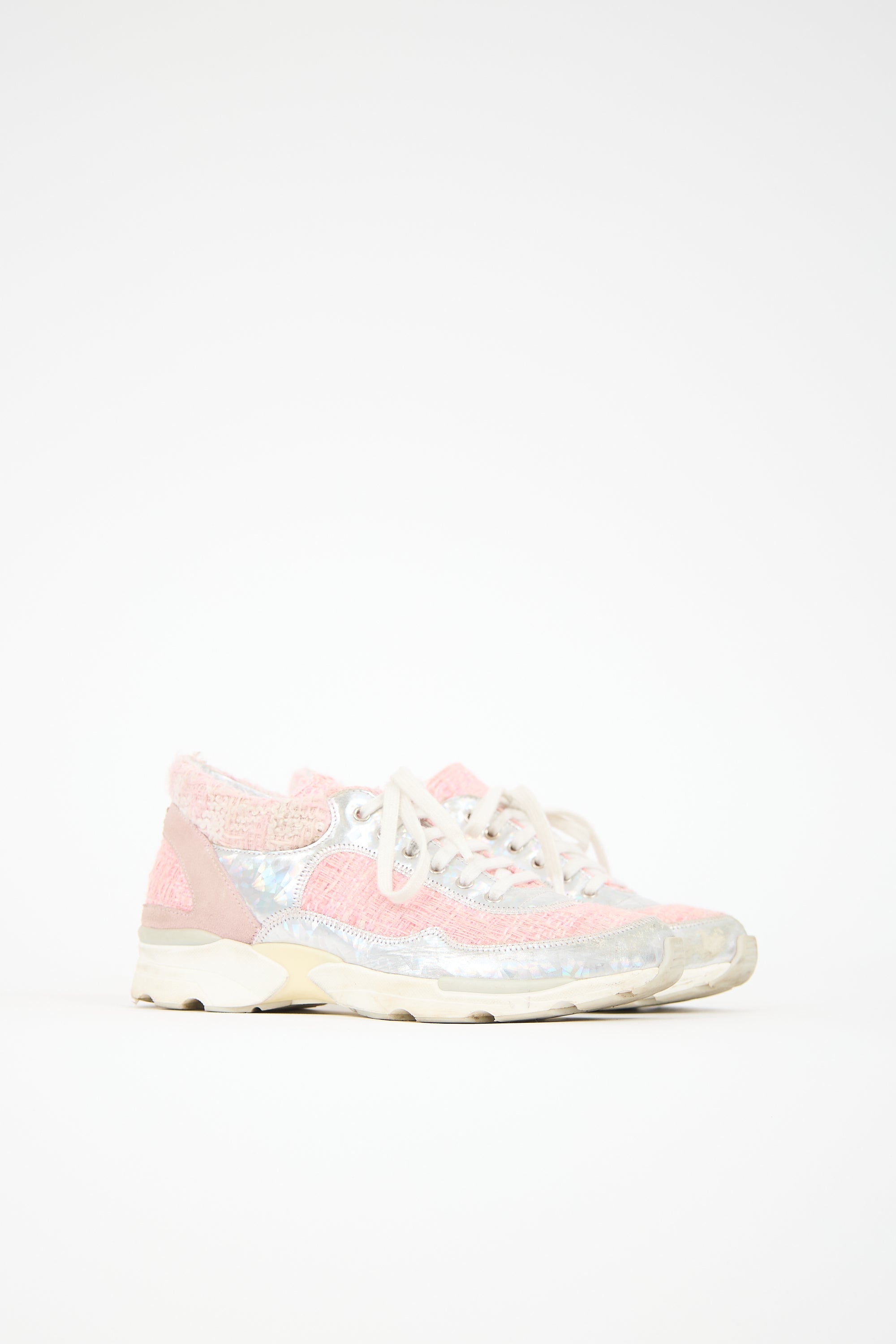 Pre-owned Chanel pink tweed sneakers featuring a rounded toe, lace up front, silver holographic leather details at vamp, and treaded rubber sole.