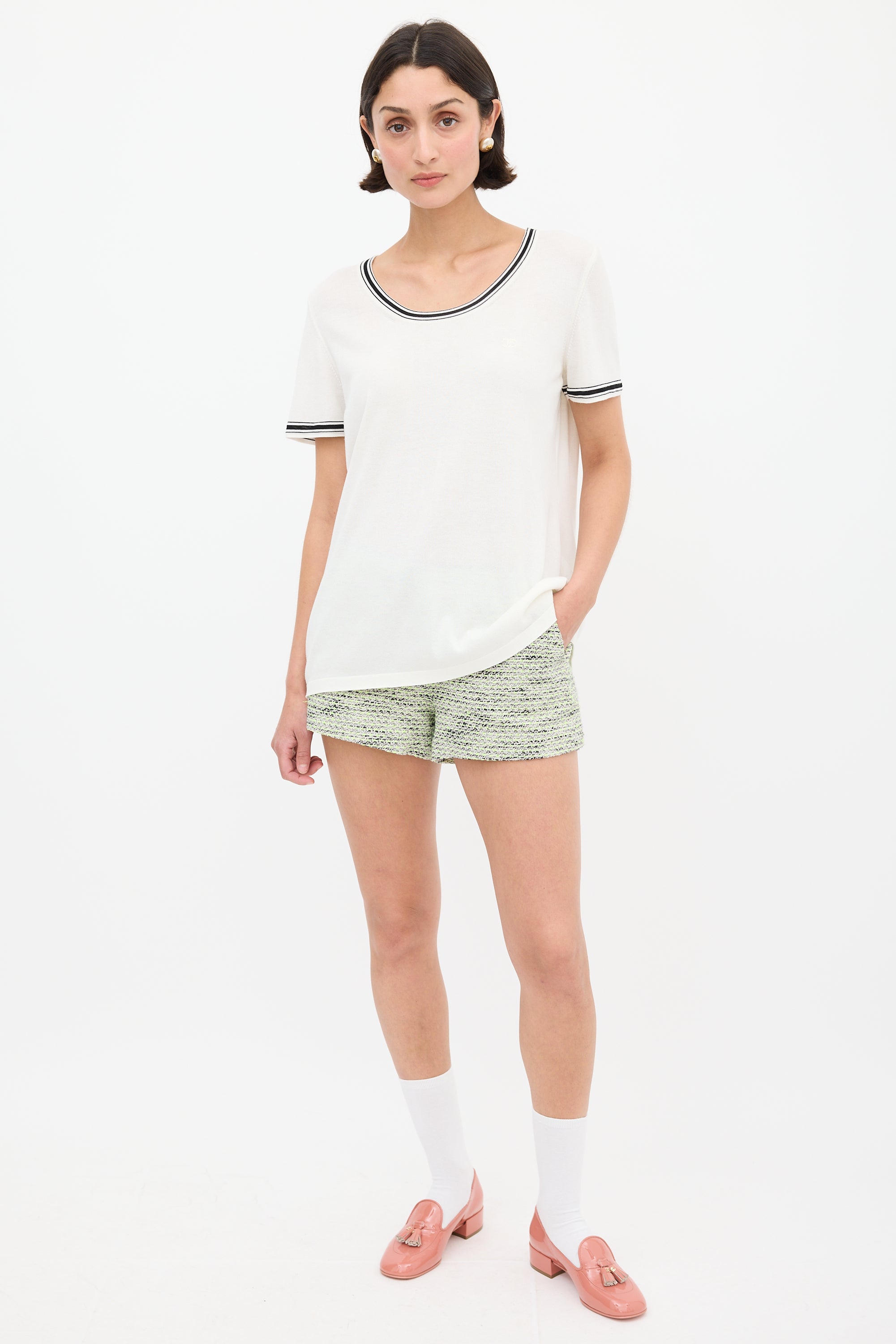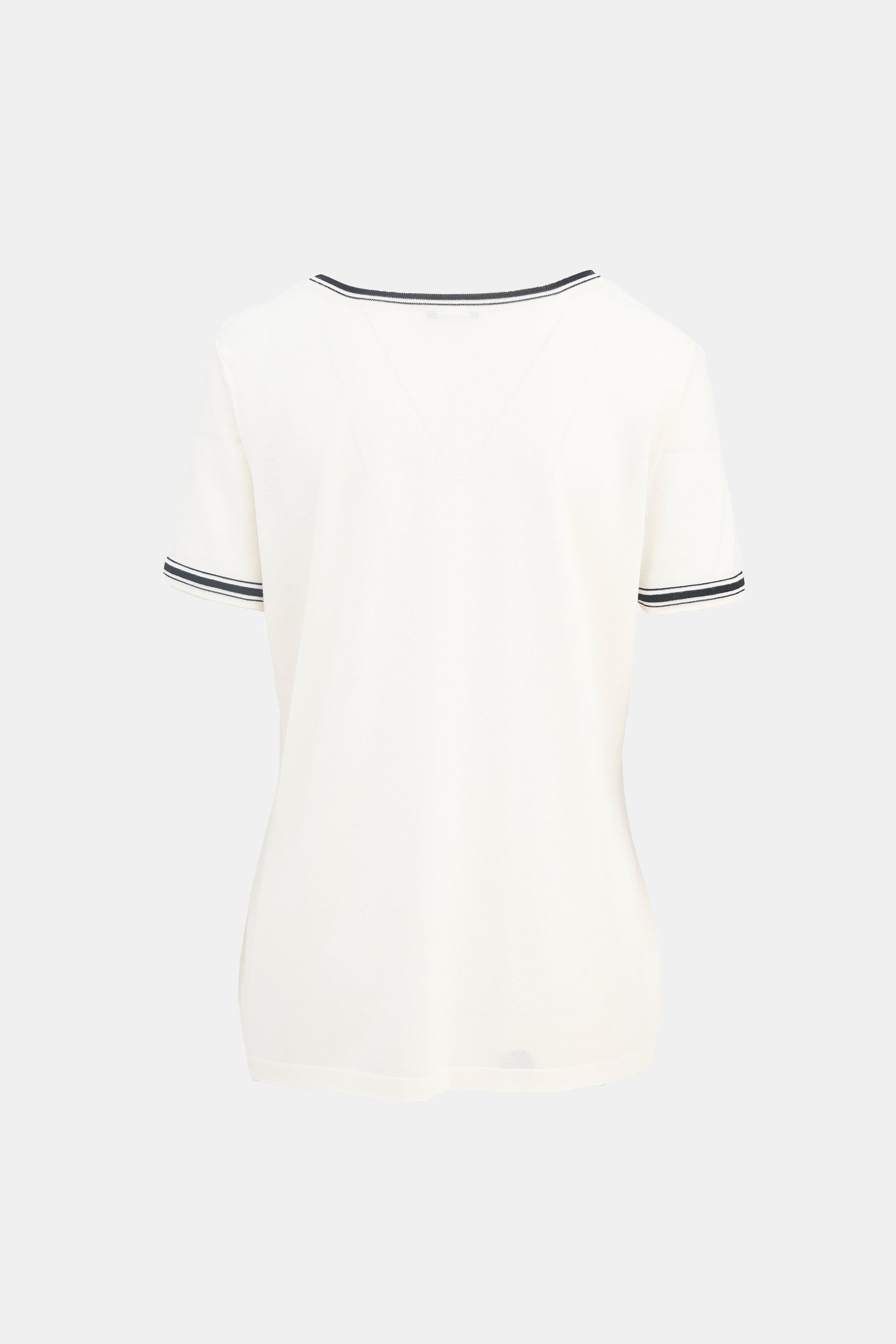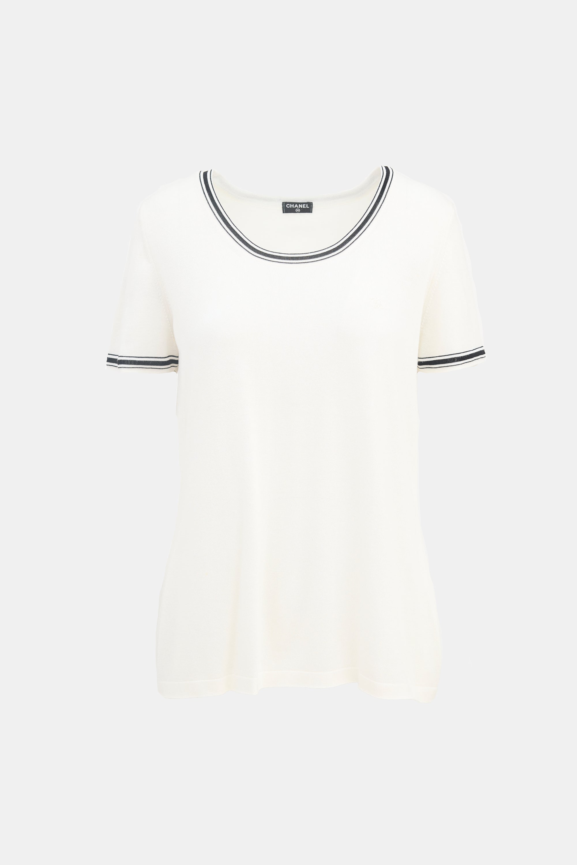 Pre-owned Chanel white top featuring a round neckline, black striped trim throughout, embroidered logo at chest, and short sleeves.