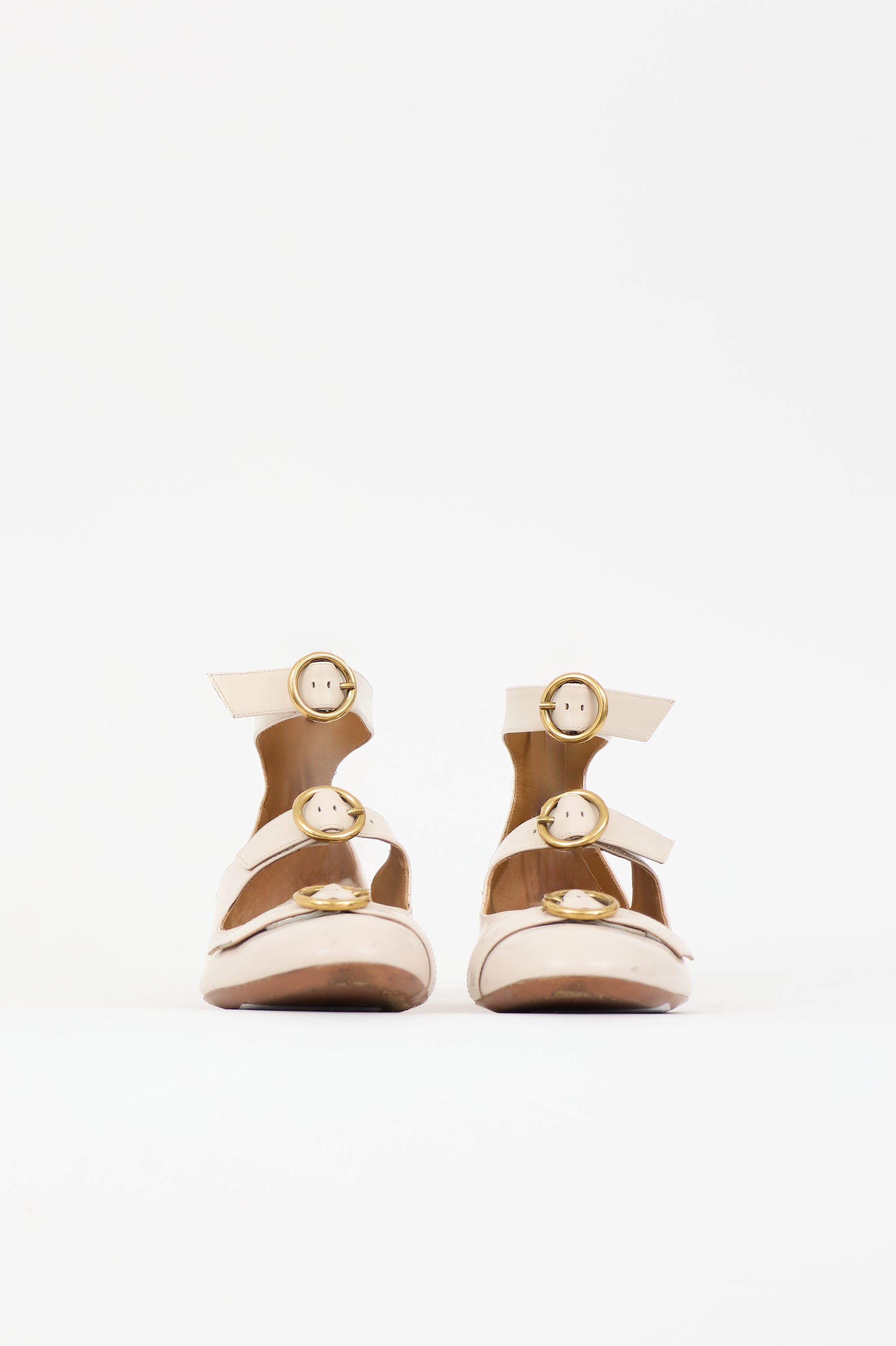 Pre-owned Chloé cream leather flats featuring a rounded toe, two buckled straps across vamp, covered counter with adjustable ankle strap, gold tone hardware, and small stacked heel.