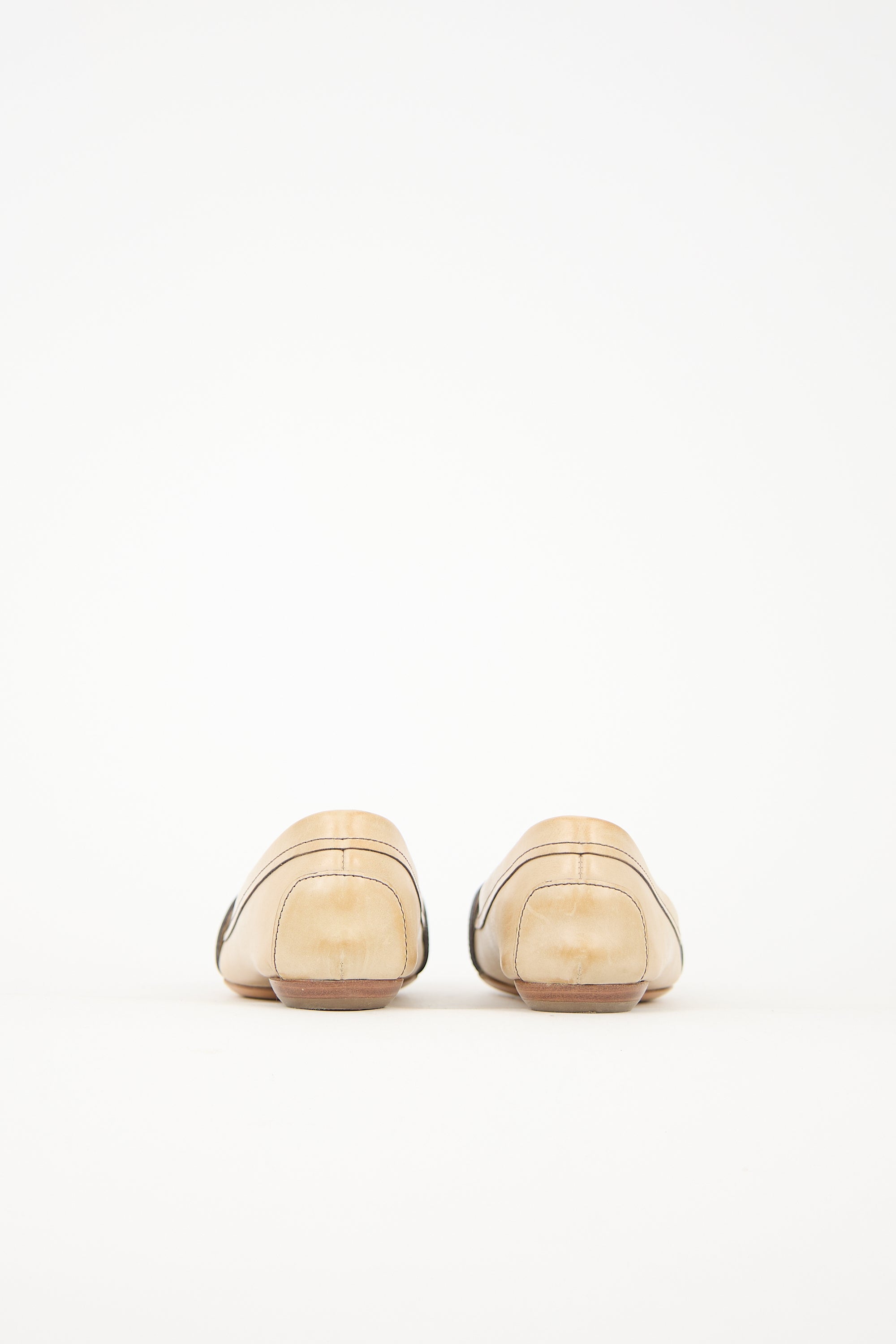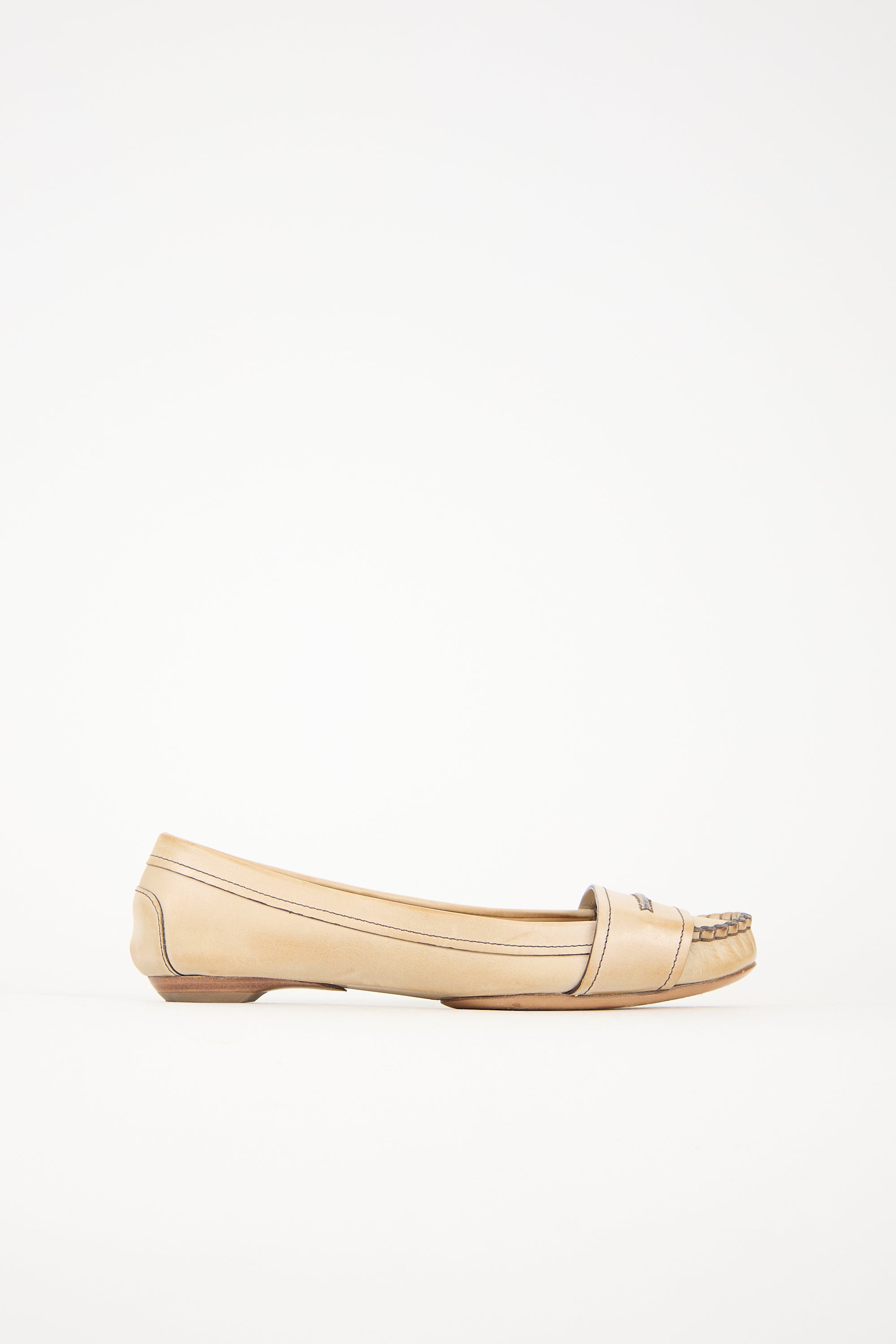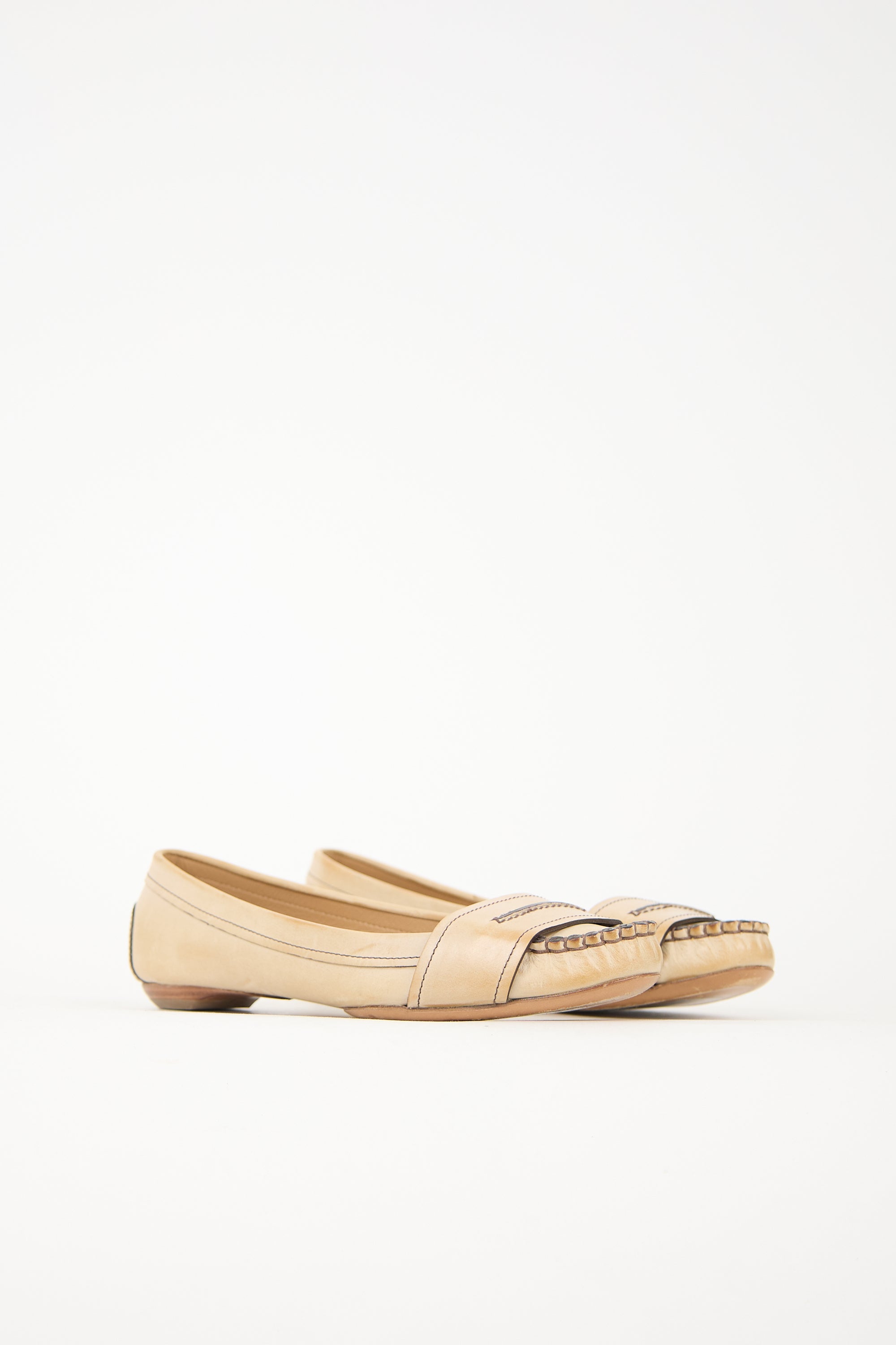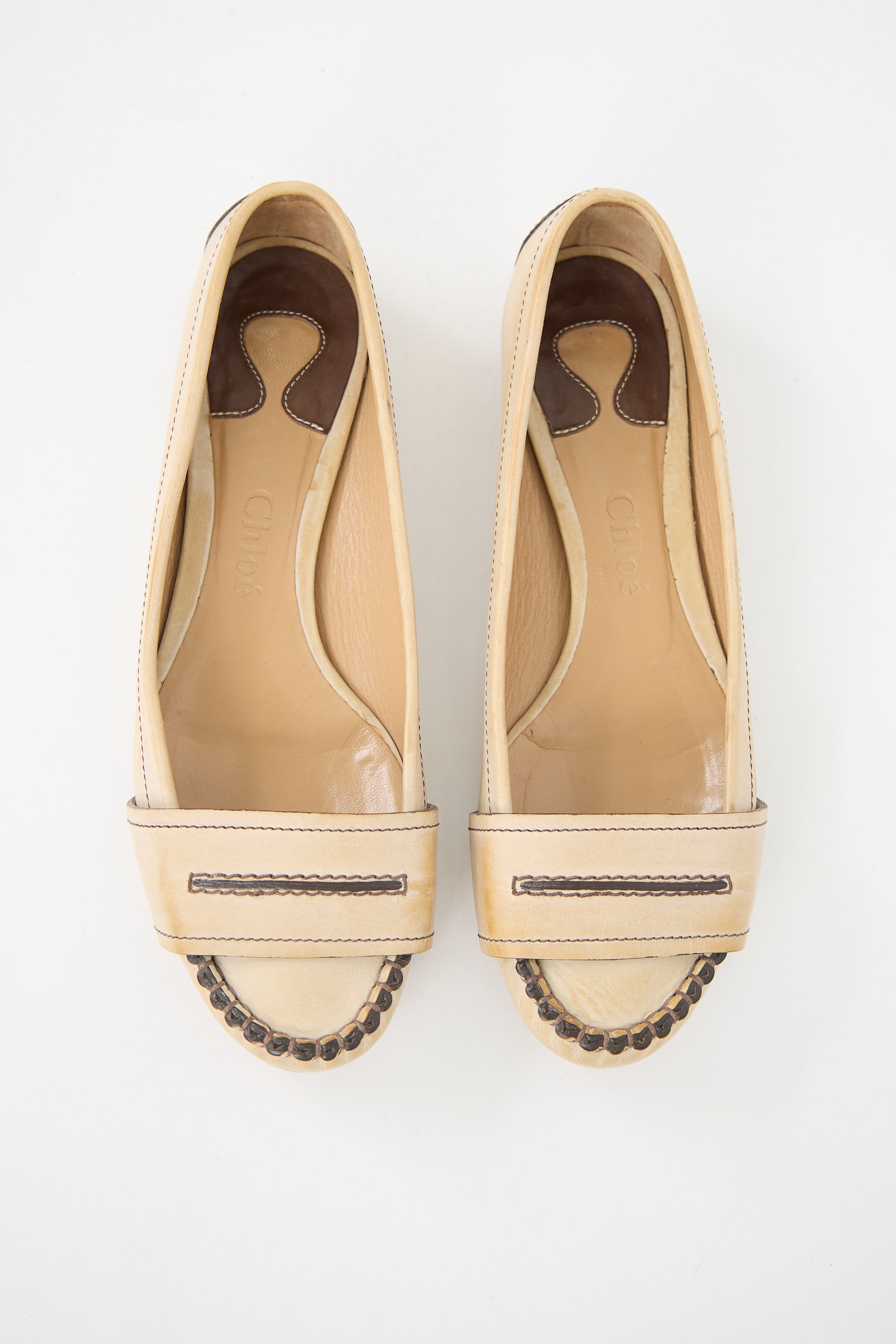 Pre-owned Chloe beige leather flats featuring rounded toe, wide strap at vamp, and slip on entry.